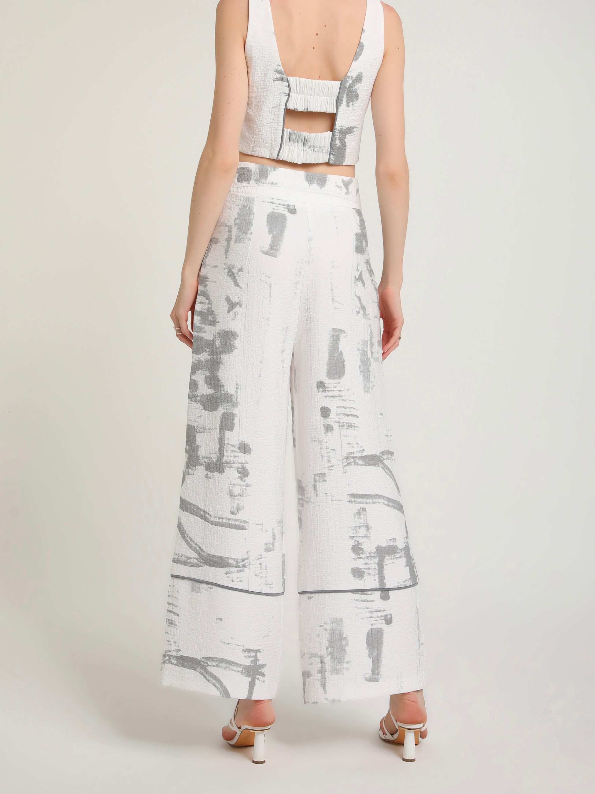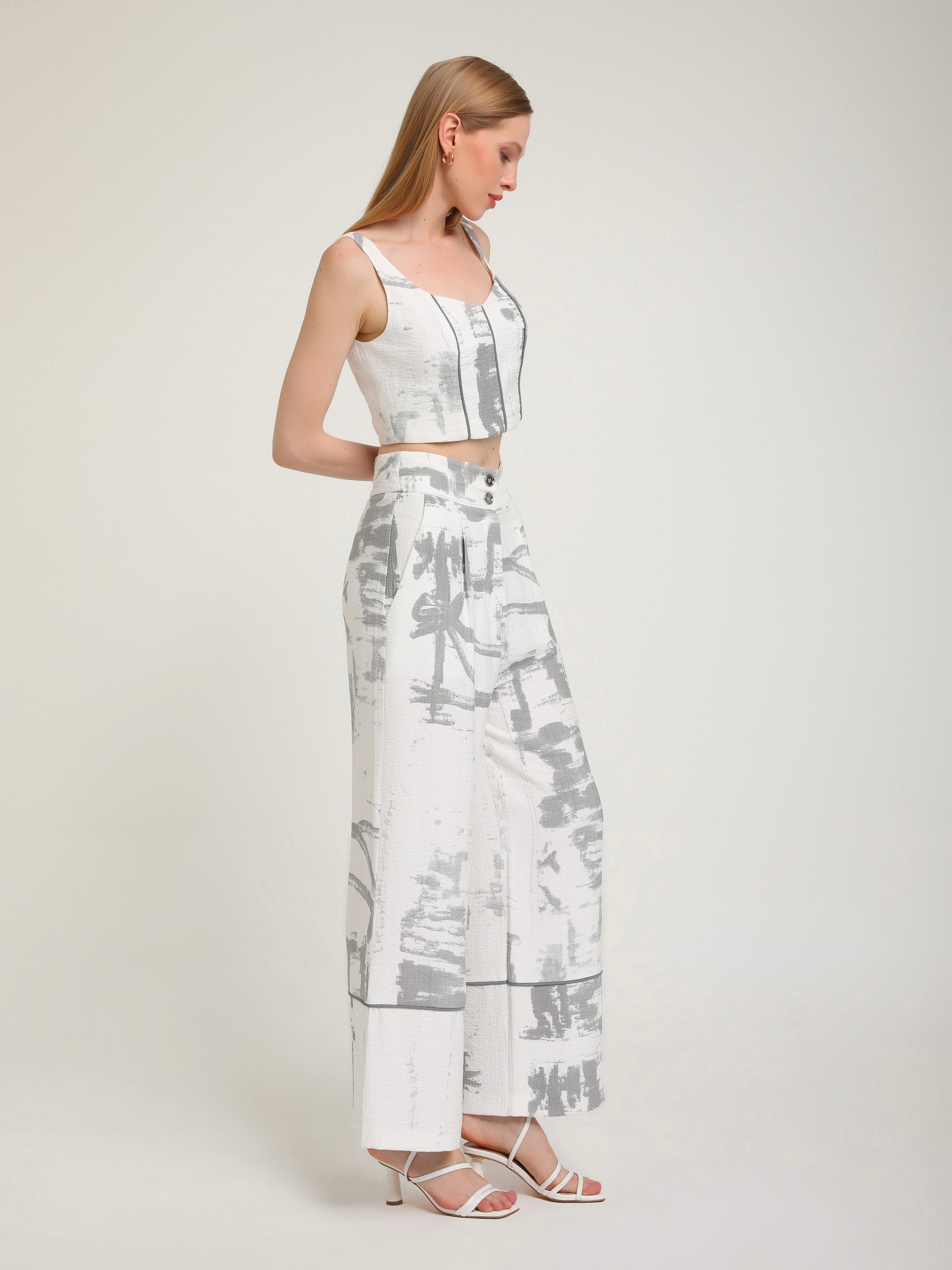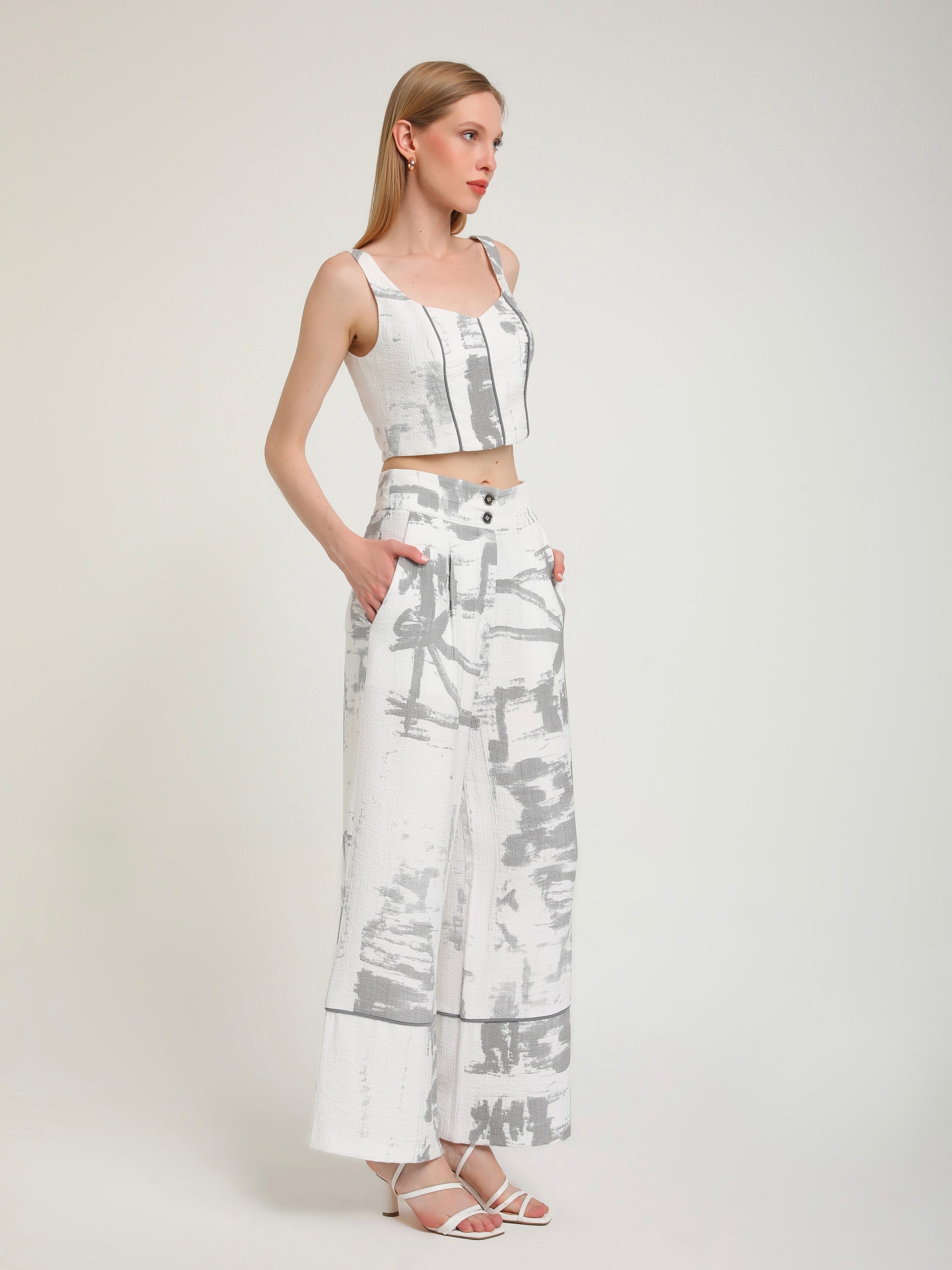 %92 viskon içeriği sayesinde hafif ve dökümlü bir yapıya sahip olan bu yüksek bel pantolon, konforlu kesimiyle hem stil hem rahatlık sunar. Beyaz zemin üzerine uygulanan gri tonlardaki soyut desenler, şehirli ve çağdaş bir stil yaratırken, geniş paça formu hareket özgürlüğü sağlar.