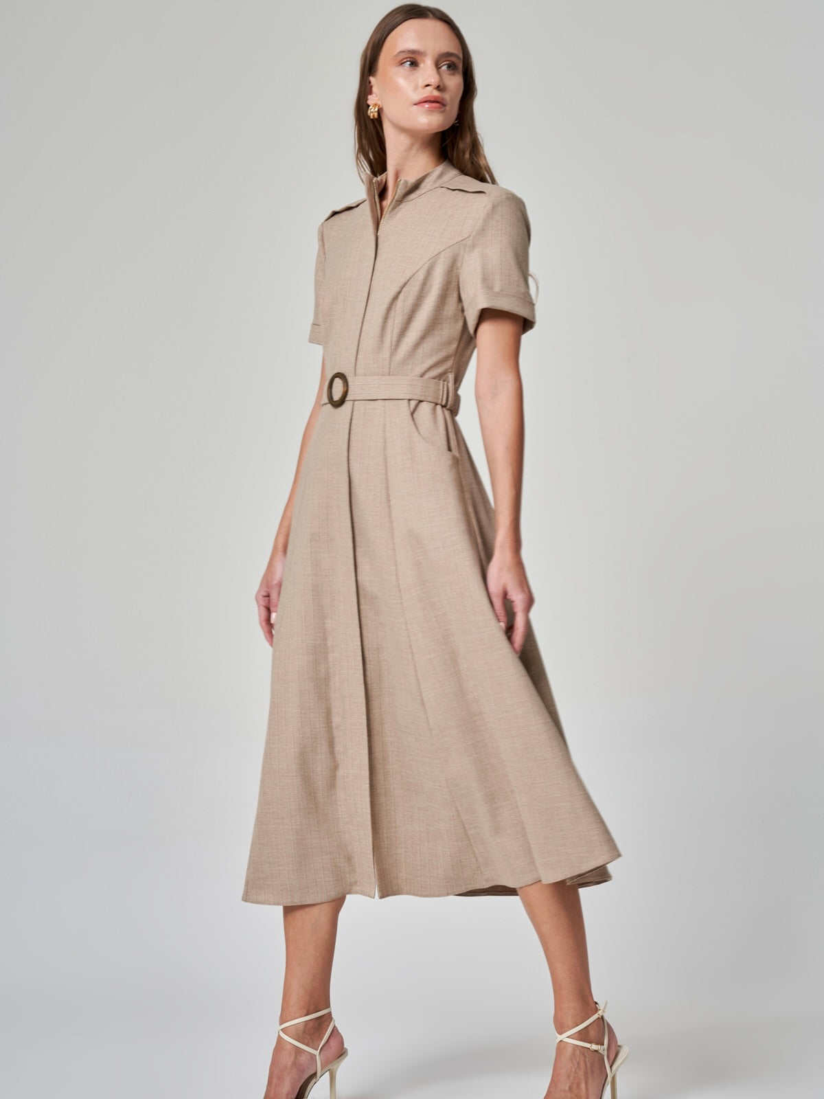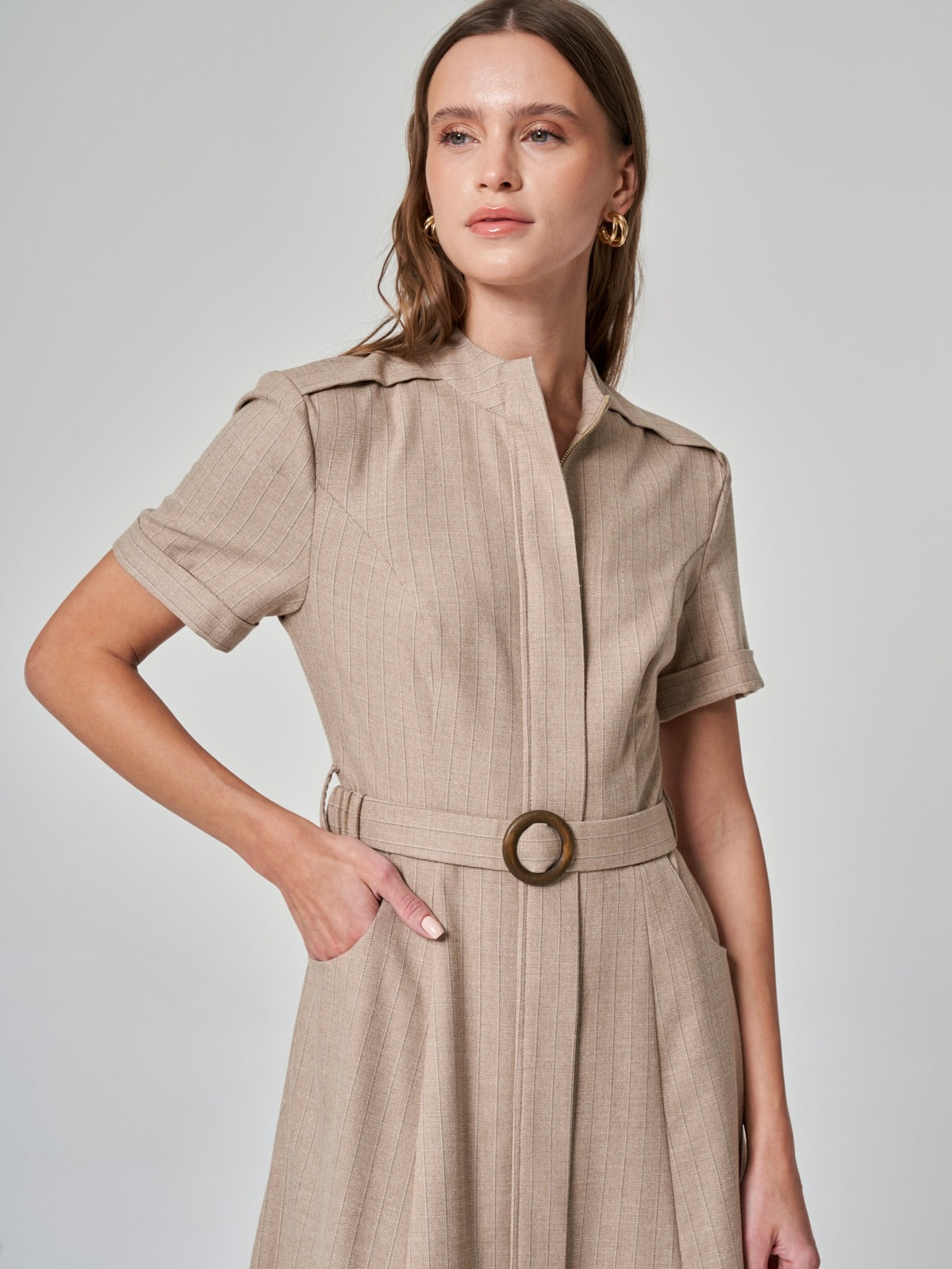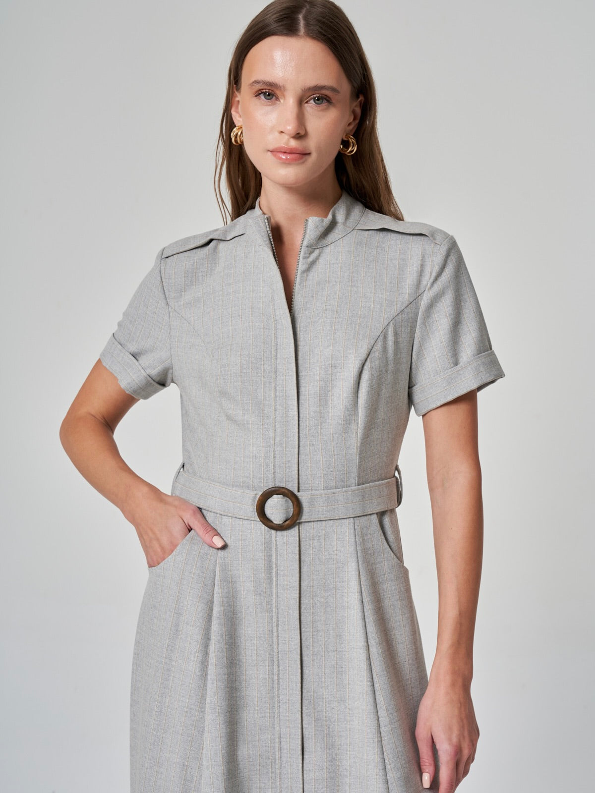 Modern, sofistike ve fonksiyonel… %50 polyester, %20 pamuk, %18 viskon ve %9 lycra karışımıyla konforlu bir kullanım sunan bu elbise, şehirli kadının dinamik temposuna uyum sağlıyor. Dik yaka ve kısa kollu tasarımıyla güçlü bir duruş sergilerken, cepli ve kemerli yapısıyla hem şık hem de fonksiyonel bir görünüm sunuyor. Ön fermuar detayı, modern çizgisini vurgularken, gri ve bej renk seçenekleriyle her ortama uyum sağlayan zamansız bir stil yaratıyor. İş toplantılarından sosyal davetlere kadar günün her anında size eşlik edecek bir tasarım!