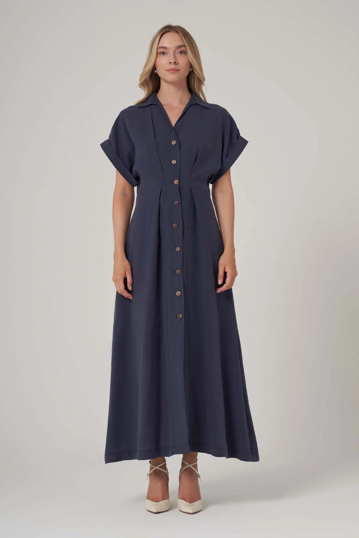 Düğmeli Kısa Kollu Cepli Tencel Midi Elbis
