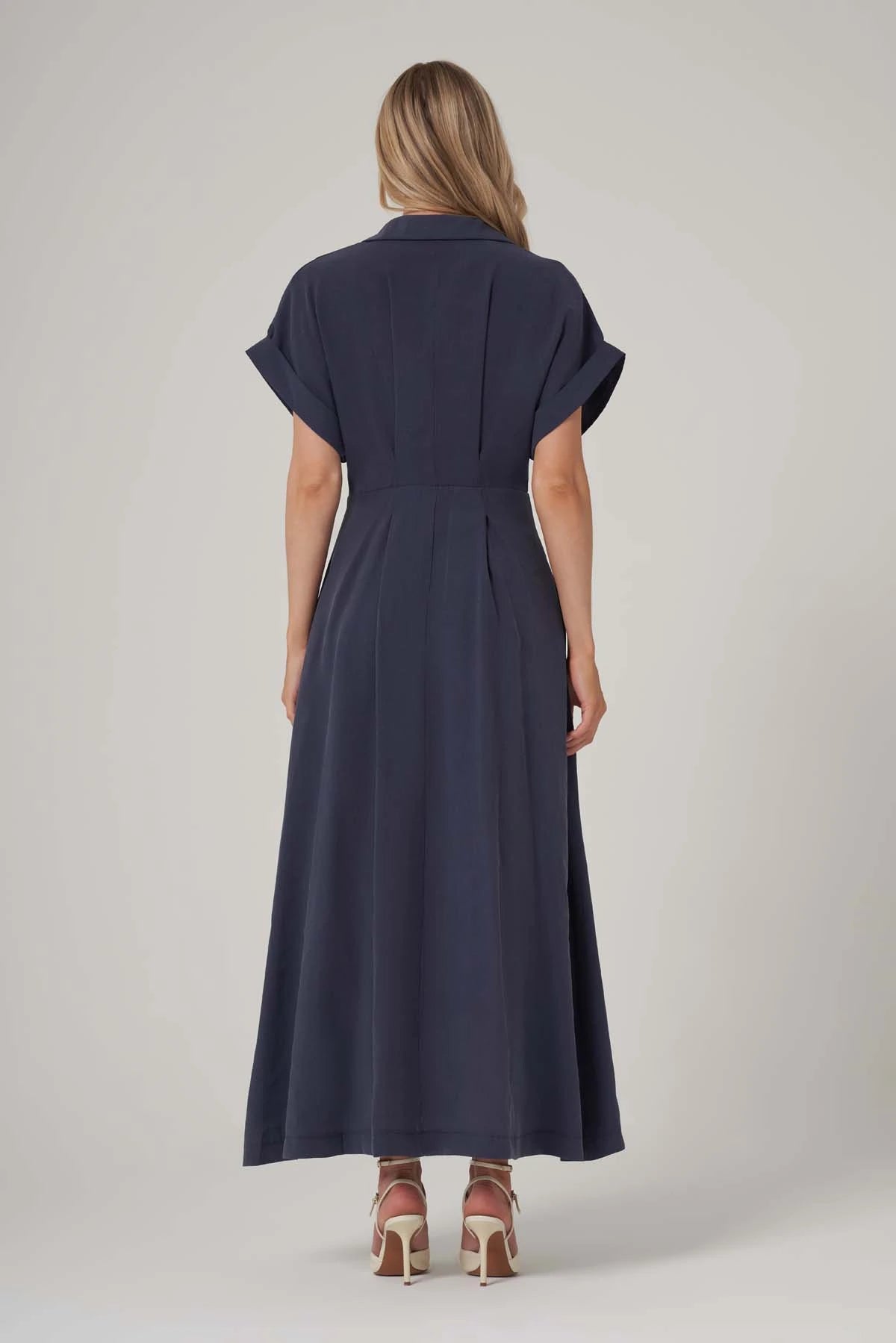 Düğmeli Kısa Kollu Cepli Tencel Midi Elbise