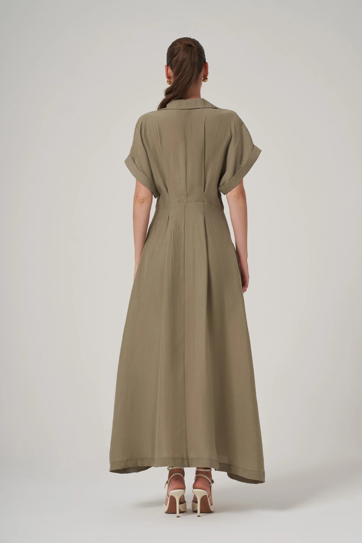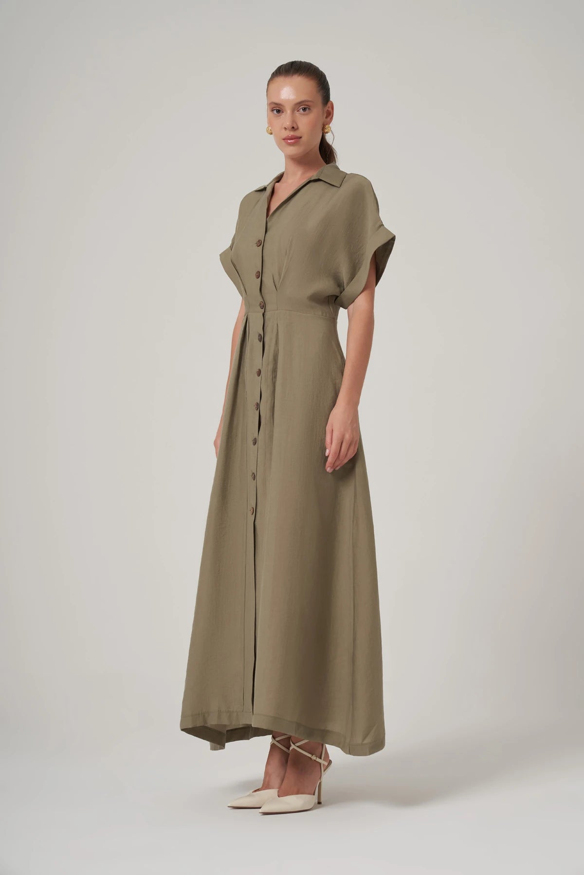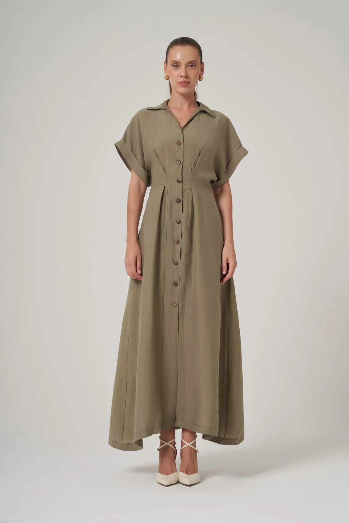 %88 Tencel ve %12 Polyester içeriğiyle yumuşak ve nefes alabilir bir doku sunan elbise, sürdürülebilir bir stil tercihi arayanlar için ideal. Bel hattındaki yapı, bedeni nazikçe sararak feminen bir siluet oluşturur. Gün boyu konfor sunarken aynı zamanda estetik bir duruş sergiler.