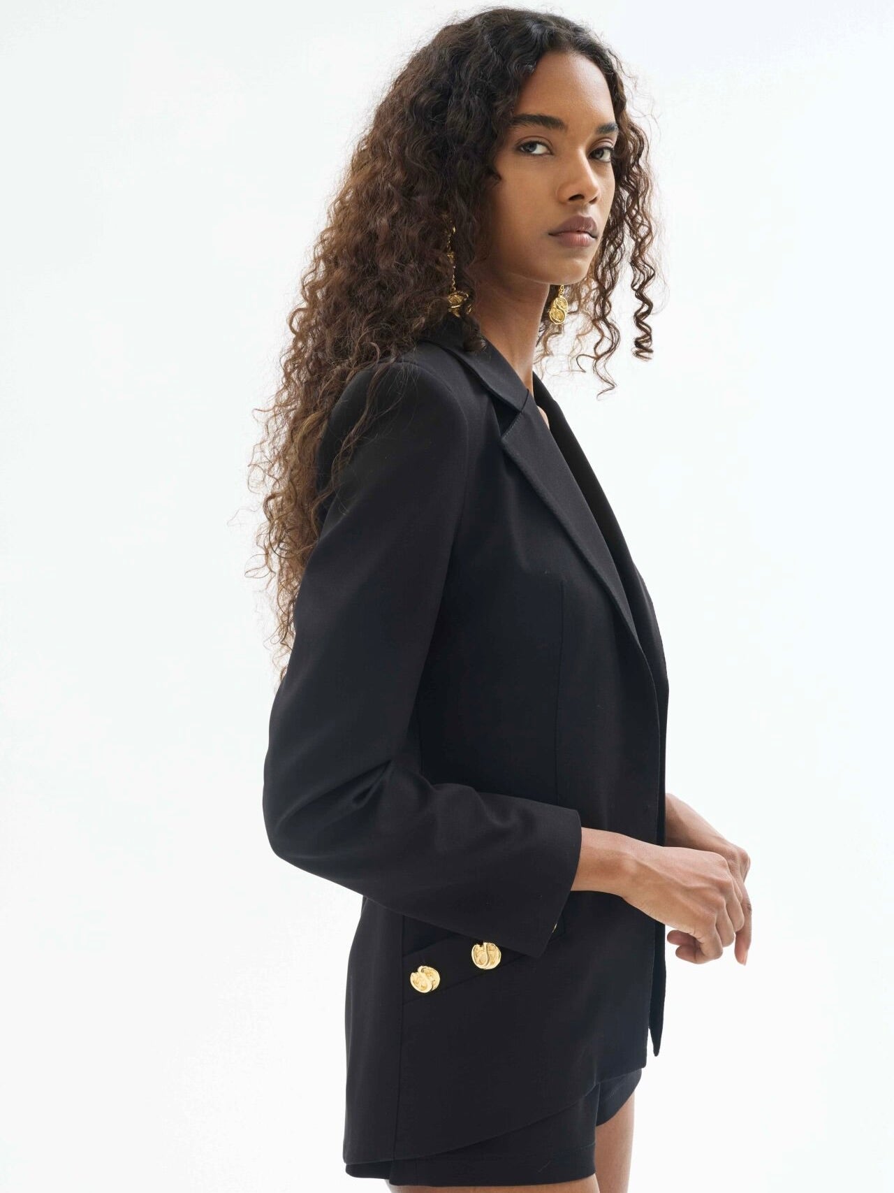 Zamansız şıklığın ve güçlü silüetlerin temsilcisi olan bu siyah ceket, Gaia n Uranos’un rafine tasarım çizgisini taşıyor. Minimal ama etkileyici görünümüyle öne çıkan bu parça, özellikle arkadan uzayan formuyla klasik blazer algısını yeniden tanımlıyor. Altın tonlu düğme detayları, tasarıma sofistike bir parlaklık katarken, ister takım halinde ister tek başına kullanıldığında yüksek bir stil etkisi yaratıyor. Geceden gündüze uzanan kombinlerin güçlü tamamlayıcısı.