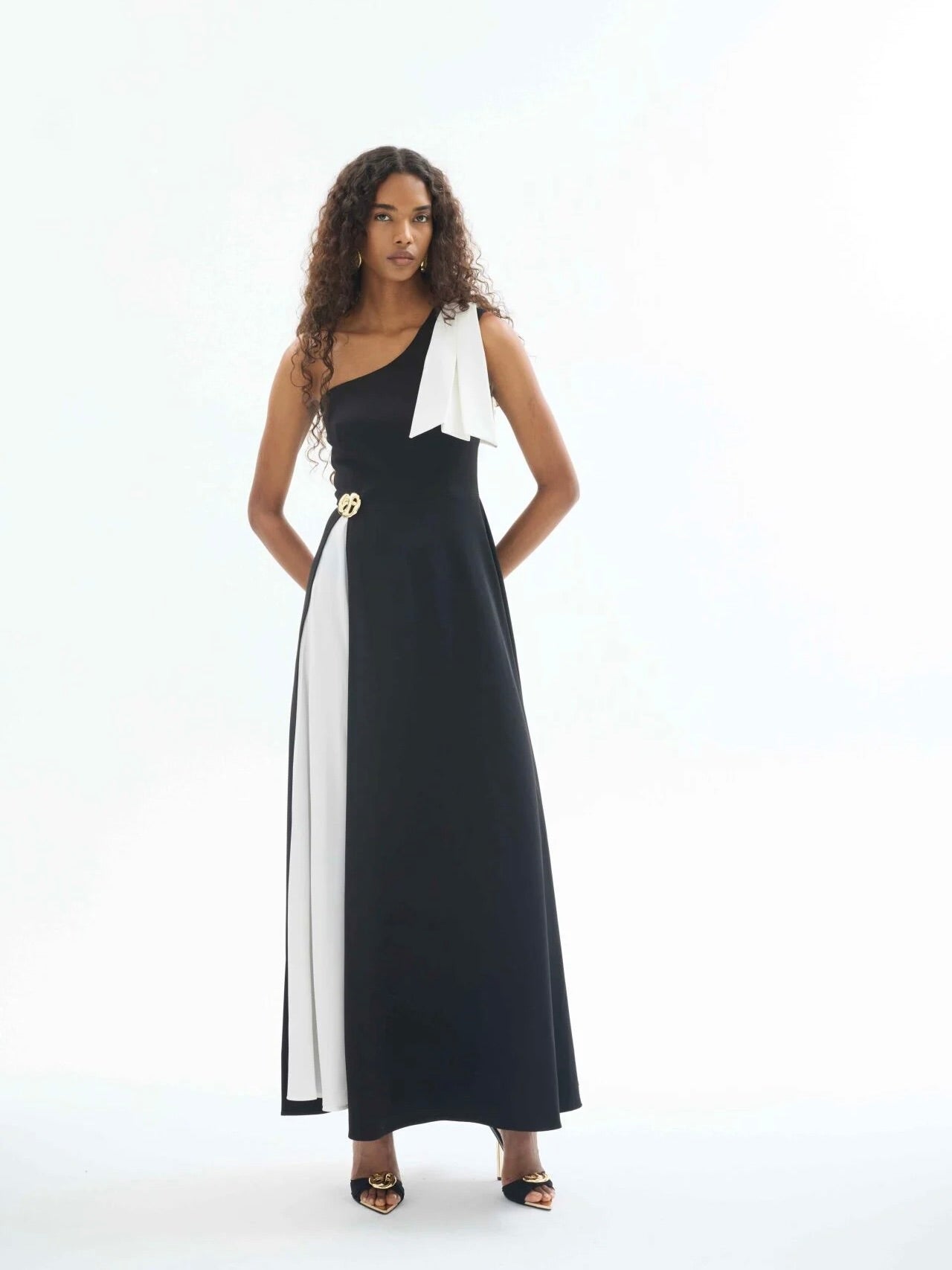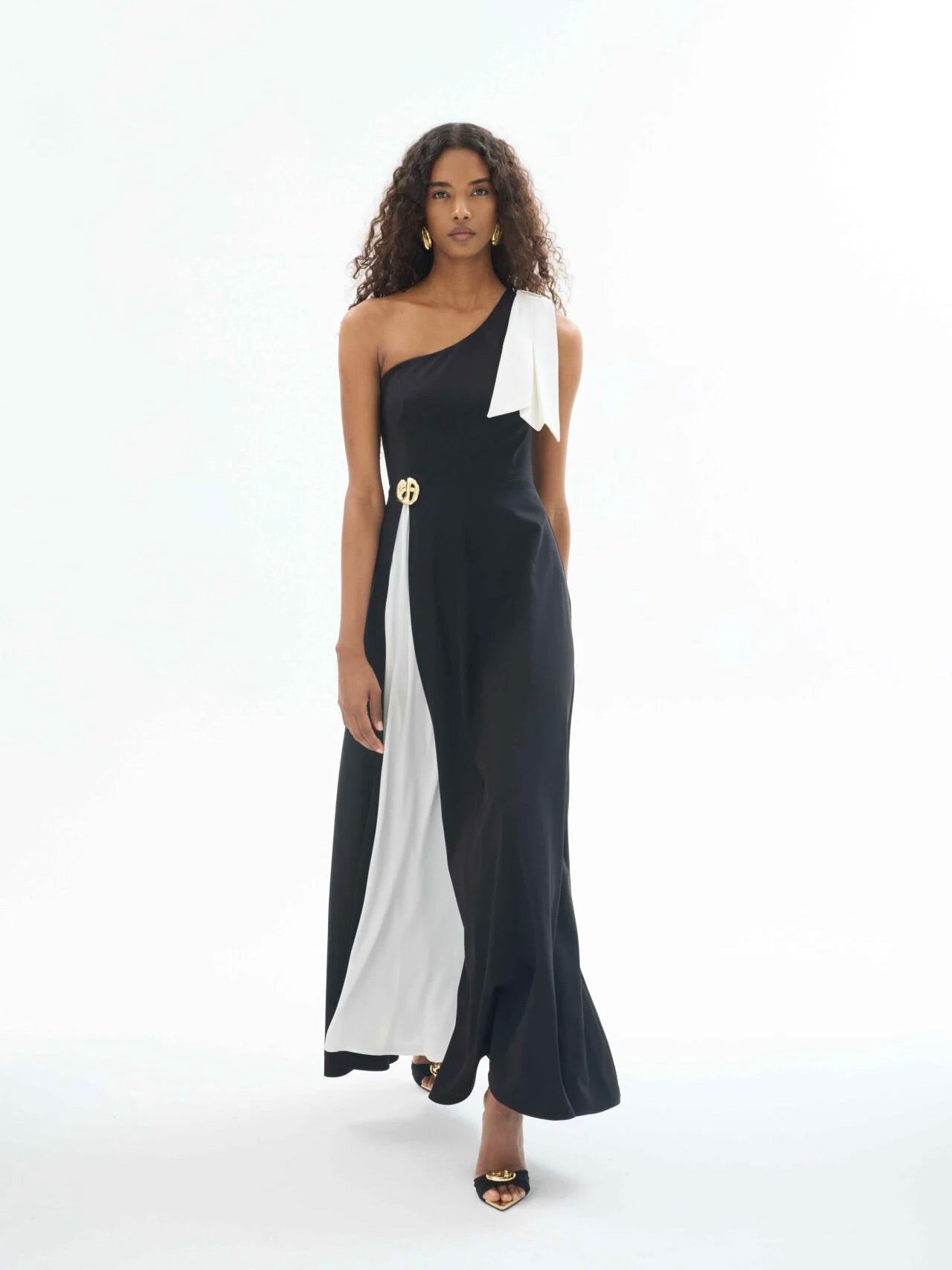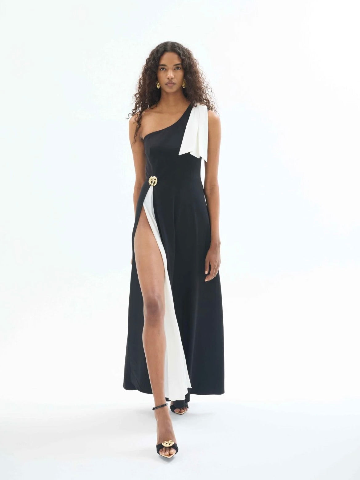 Tek omuz tasarımı ve dramatik yırtmaç detayıyla dikkat çeken bu siyah elbise, beyaz fiyonk yaka detayı ve alt katmandaki kontrast dokusuyla güçlü bir siluet yaratır. Bel kısmındaki metal tokalı aksesuar, feminen hatları vurgularken tasarıma sofistike bir hava katar.