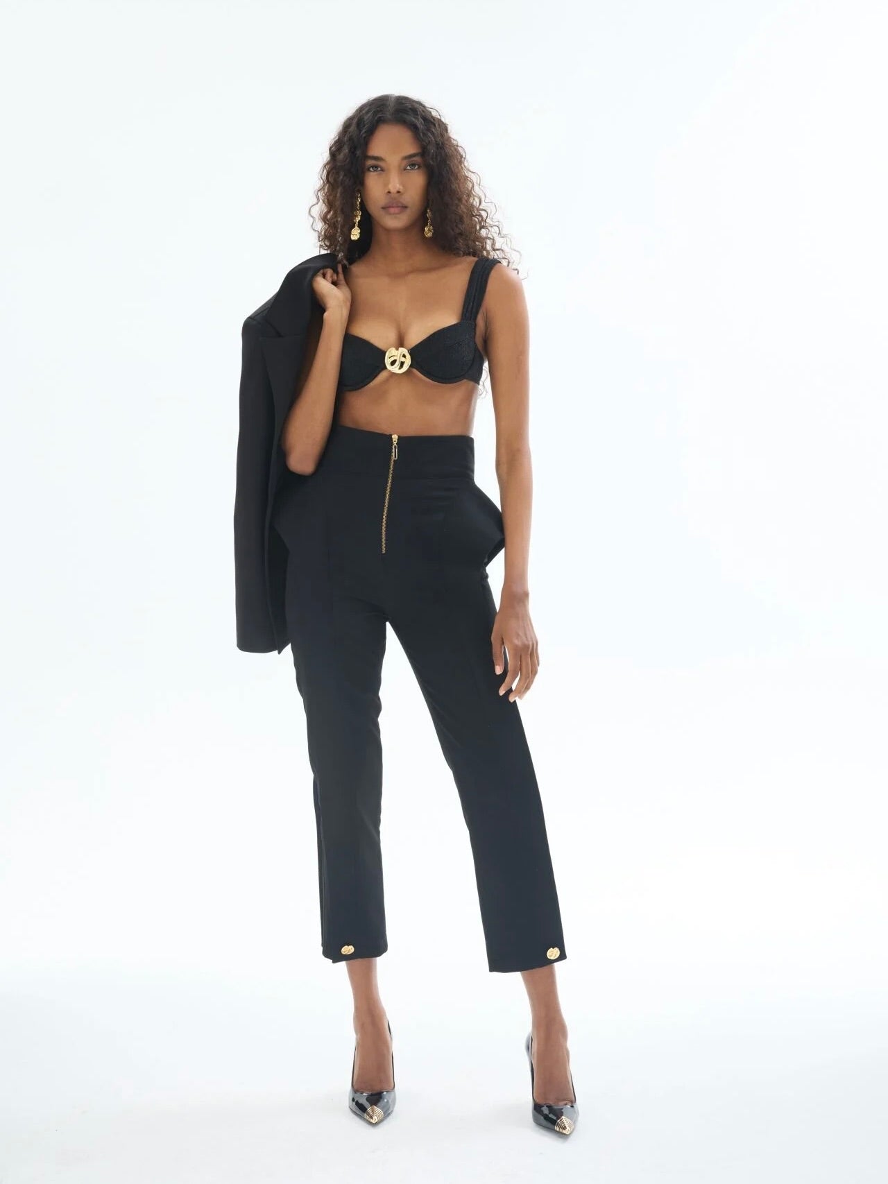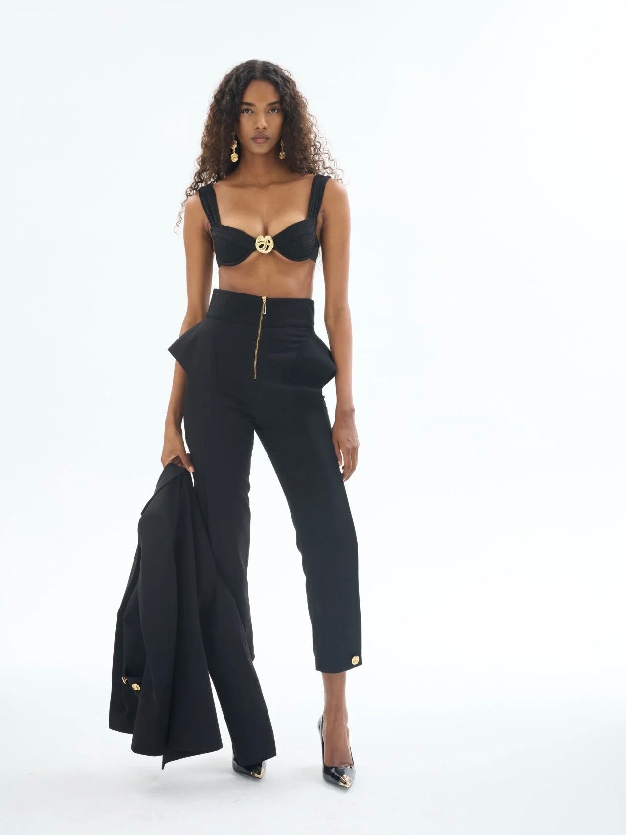 Minimal çizgilerle maksimal etki yaratan bu siyah peplum pantolon, Gaia n Uranos’un ikonik stil kodlarını modern bir yorumla buluşturuyor. Öne yerleştirilen altın rengi fermuar detayı, sofistike tasarımı cesur bir dokunuşla tamamlıyor. Yüksek bel formu ve peplum hatlarıyla vücut proporsiyonunu dengelerken, bilekte biten boyu stilettolardan sandaletlere birçok ayakkabıyla kombinlenmeye olanak tanıyor.