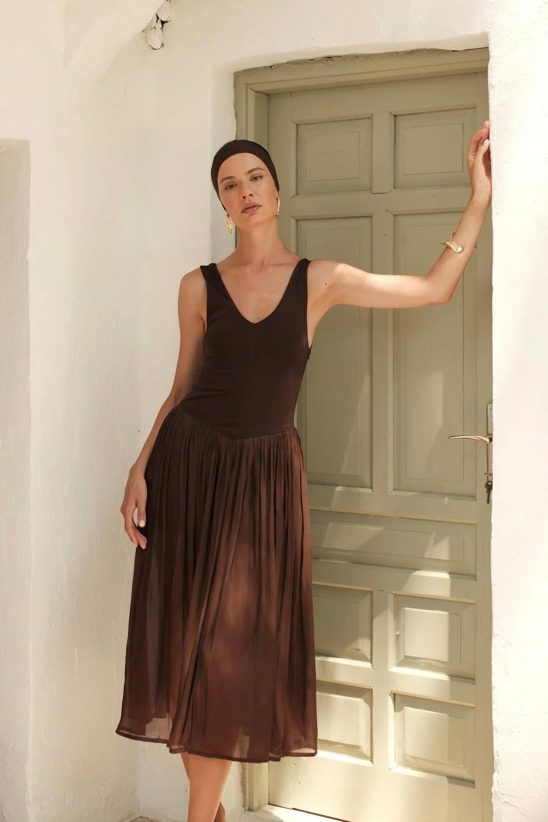 Zamansız zarafetin en güçlü temsilcilerinden biri olan Gaia n Uranos Kahverengi Çan Elbise, sofistike silüetiyle modern kadının gardırobuna şıklık katıyor. Derin V yaka detayı feminen bir dokunuş sunarken, bedeni kusursuz saran üst kısmı zarif bir incelikle öne çıkıyor. Çan formundaki pileli etek ise hareket özgürlüğü sağlarken aynı zamanda romantik ve zarif bir akış yaratıyor.