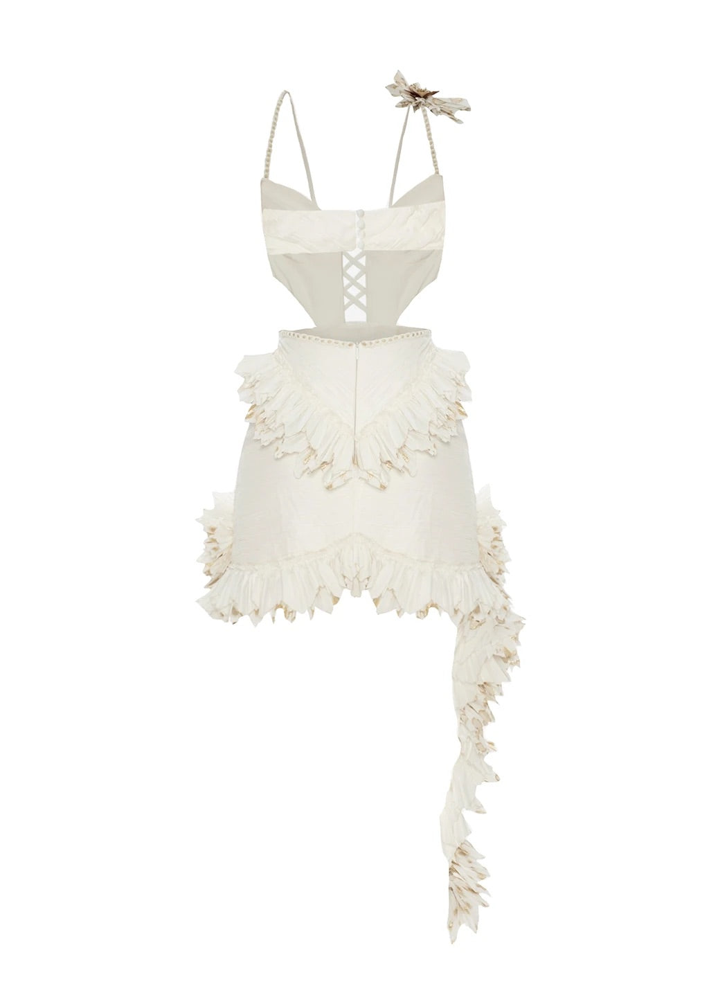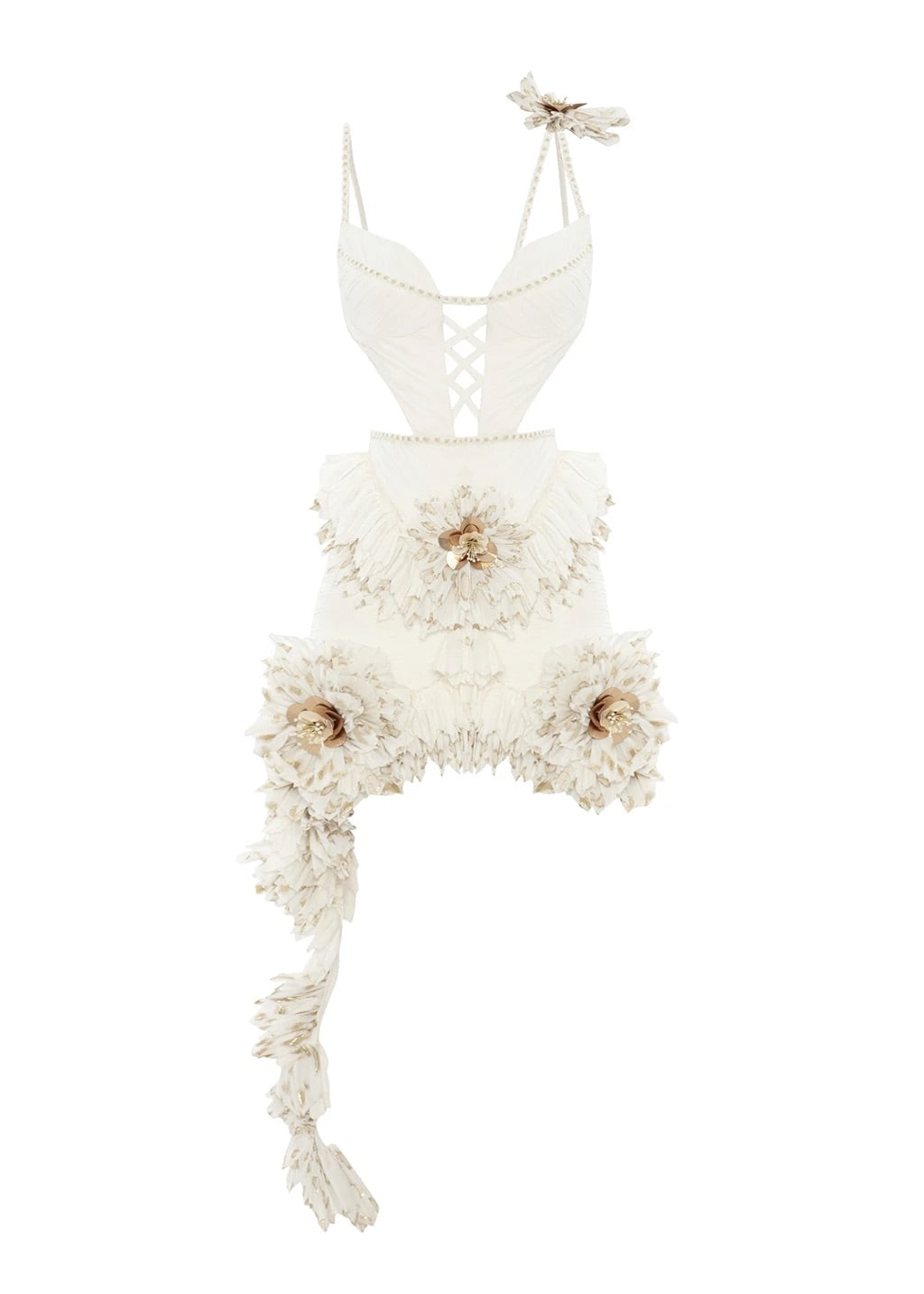 Cesur gelinlerin after party şıklığına özel tasarlanan bu kısa gelinlik, asimetrik kesimi, lazer kesim çiçek motifleri ve el işçiliği detaylarıyla göz kamaştırıyor. Floral desenli tencel kumaşıyla hem zarif hem de hafif bir doku sunan tasarım, vücuda tam oturan silueti ve çarpıcı omuz detayıyla dikkat çekiyor. Etek ucundaki katmanlı yapısı ve el işlemeli tokası ile tamamlanan bu özel parça, düğün sonrası geceye unutulmaz bir dokunuş katmak isteyenler için ideal.