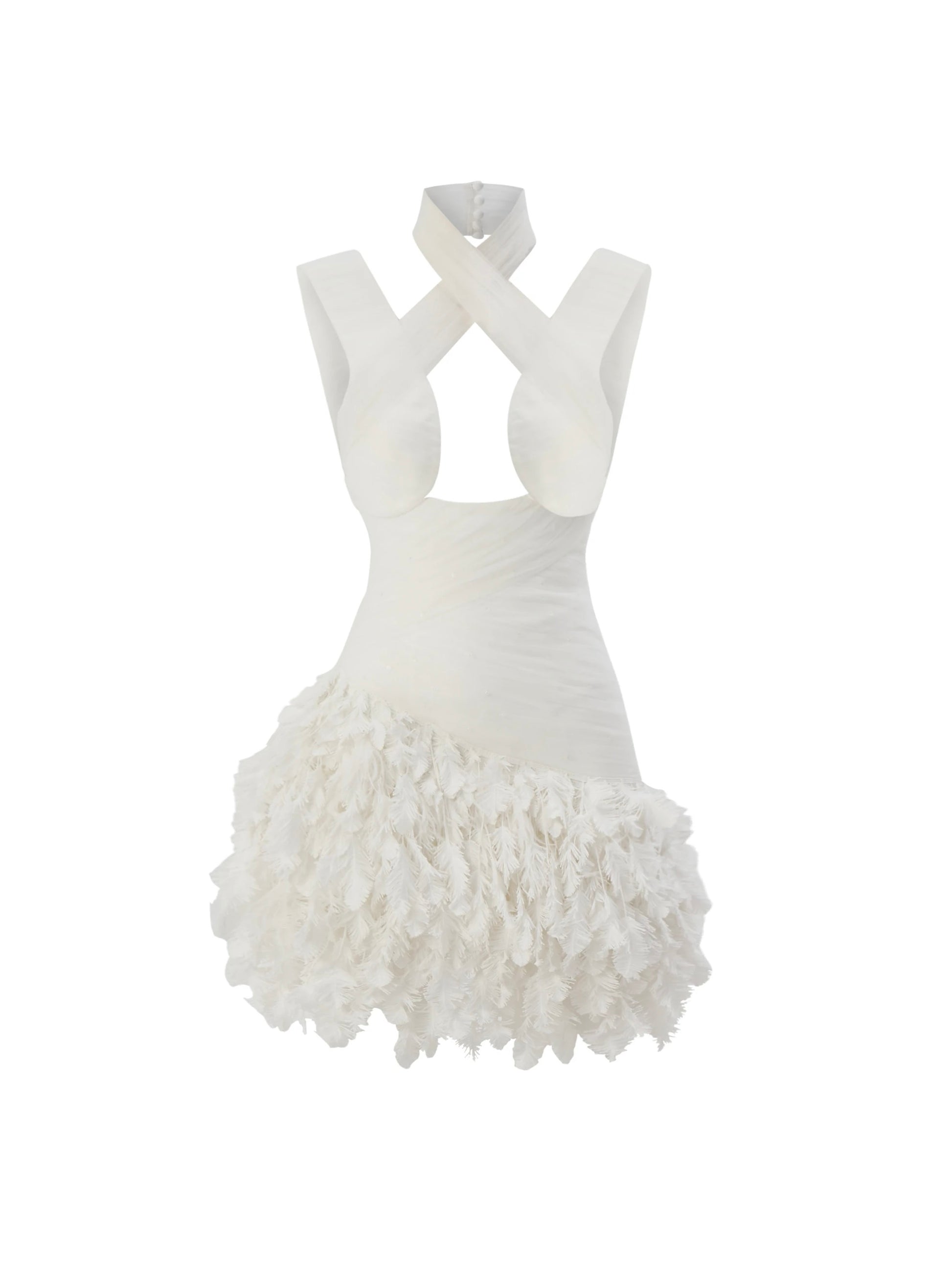 Modern zarafetle geleneksel detayları harmanlayan Haleia gelinlik, gelinliğe cesur bir yorum getiriyor. Swarovski taşlarla işlenmiş, tül kumaş üzerine yerleştirilen tüy ve yaprak aplikeler, ışığı adeta dans ettirerek her adımda dikkat çekiyor. Önü çapraz büstiyer formunda tasarlanan halter yaka kesimi ve mini boyuyla modern gelinliğin sınırlarını yeniden tanımlıyor.
