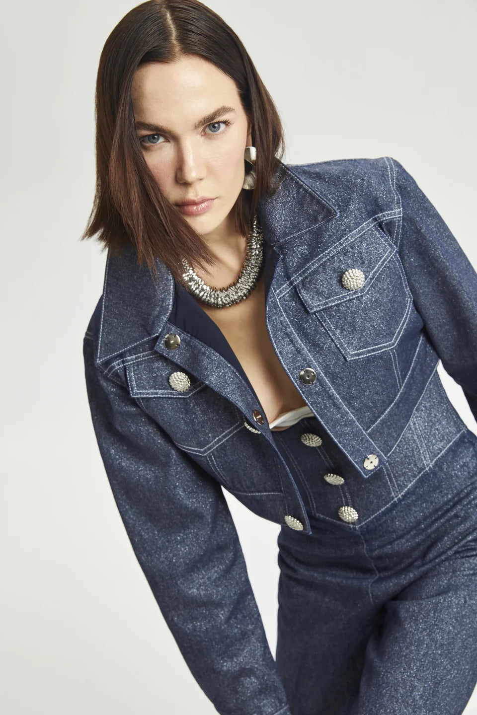 Haleia’nın modern çizgisini yansıtan kontrast dikişli kısa denim ceket, güçlü bir görünüm isteyenler için tasarlandı. Ön cepler ve gümüş rengi düğme detaylarıyla öne çıkan model, parlak efektli denim dokusuyla sofistike bir hava katıyor. Cropped kesimi sayesinde hem pantolon hem de eteklerle kolayca kombinlenebilen bu ceket, dinamik bir silüet sunuyor.