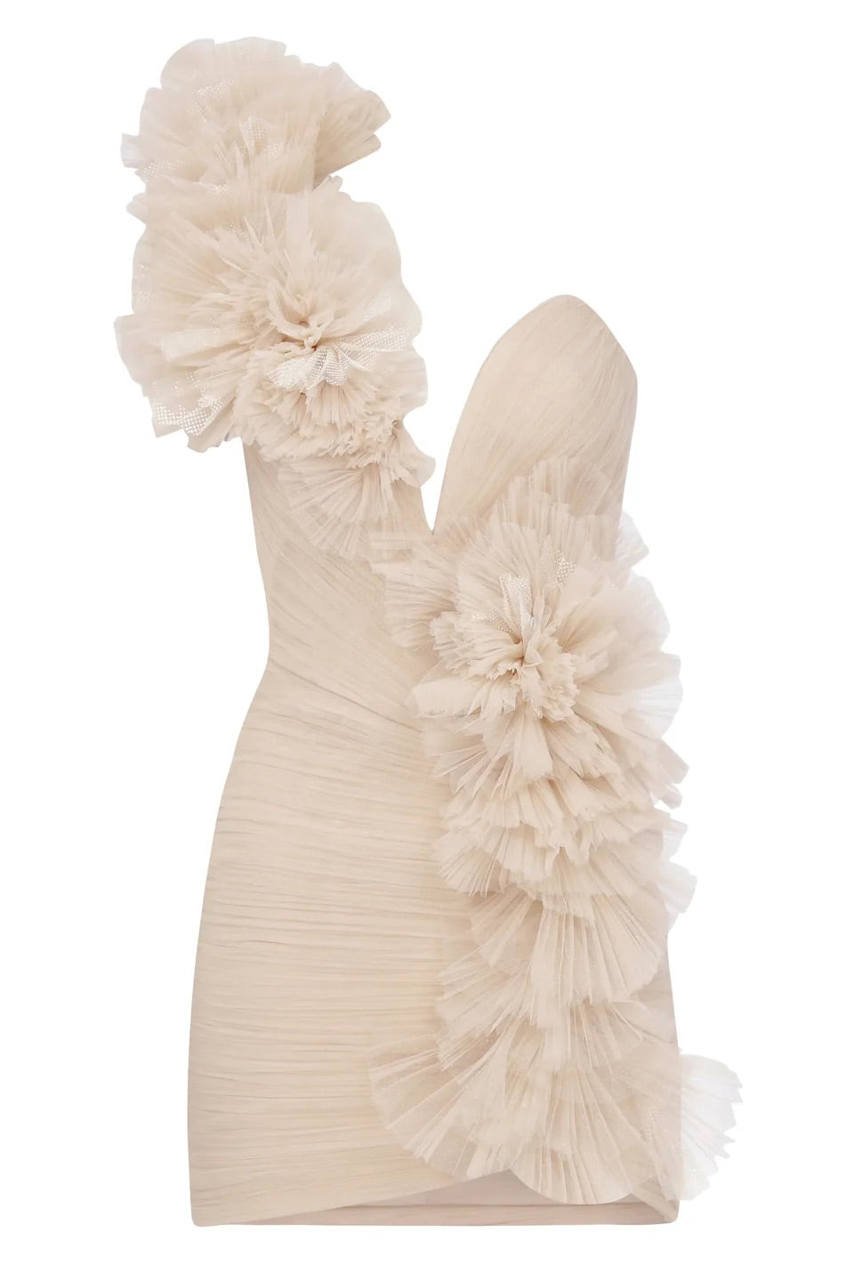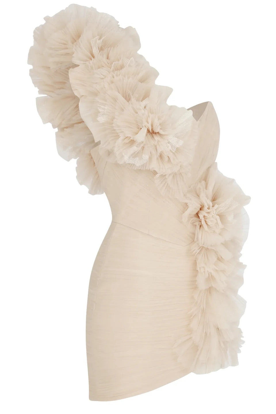 Derin V yaka kesimiyle dikkat çeken bu mini elbise, yanda yer alan fırfır detayları ve akışkan drape yapısıyla vücut formunu zarifçe öne çıkarır. Yumuşak yapılı kumaşı sayesinde modern ve feminen bir siluet sunarken, mini boyu tasarıma enerjik bir hava katar.