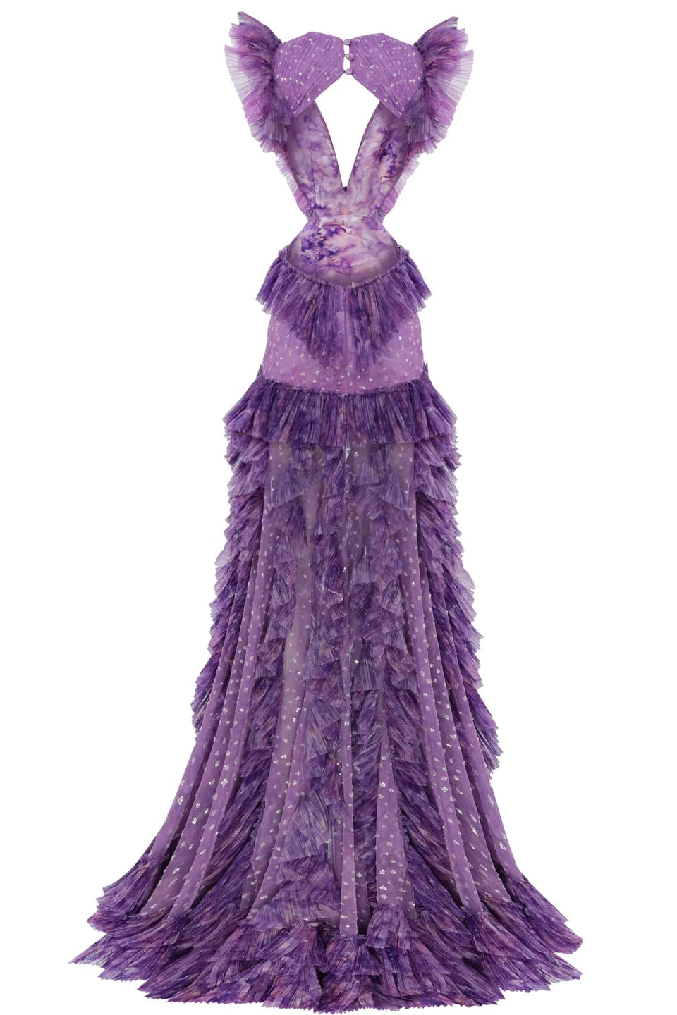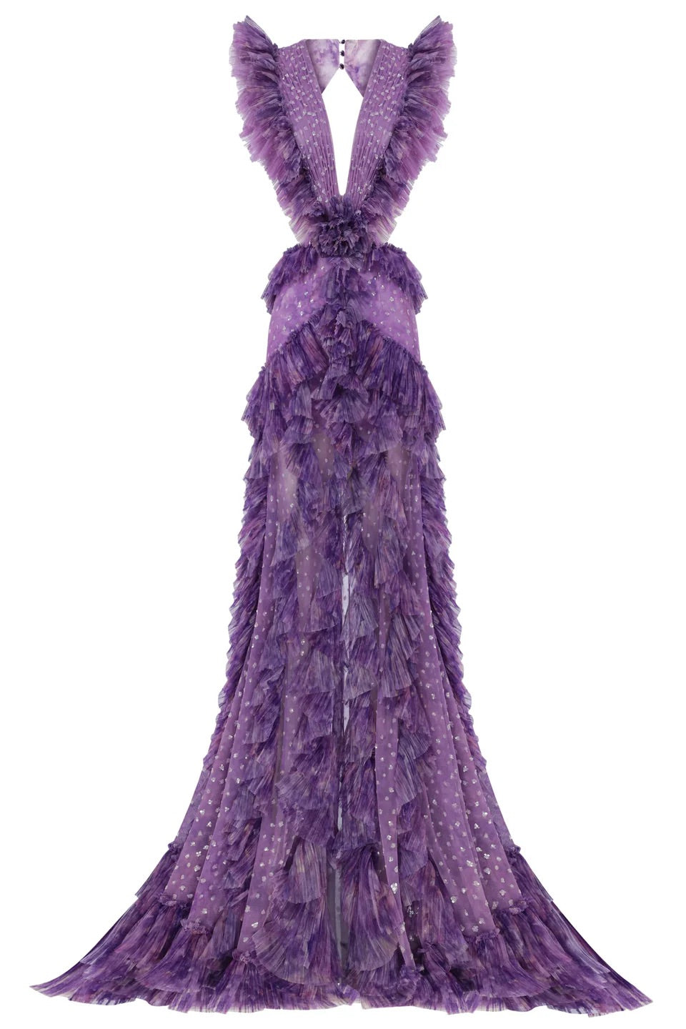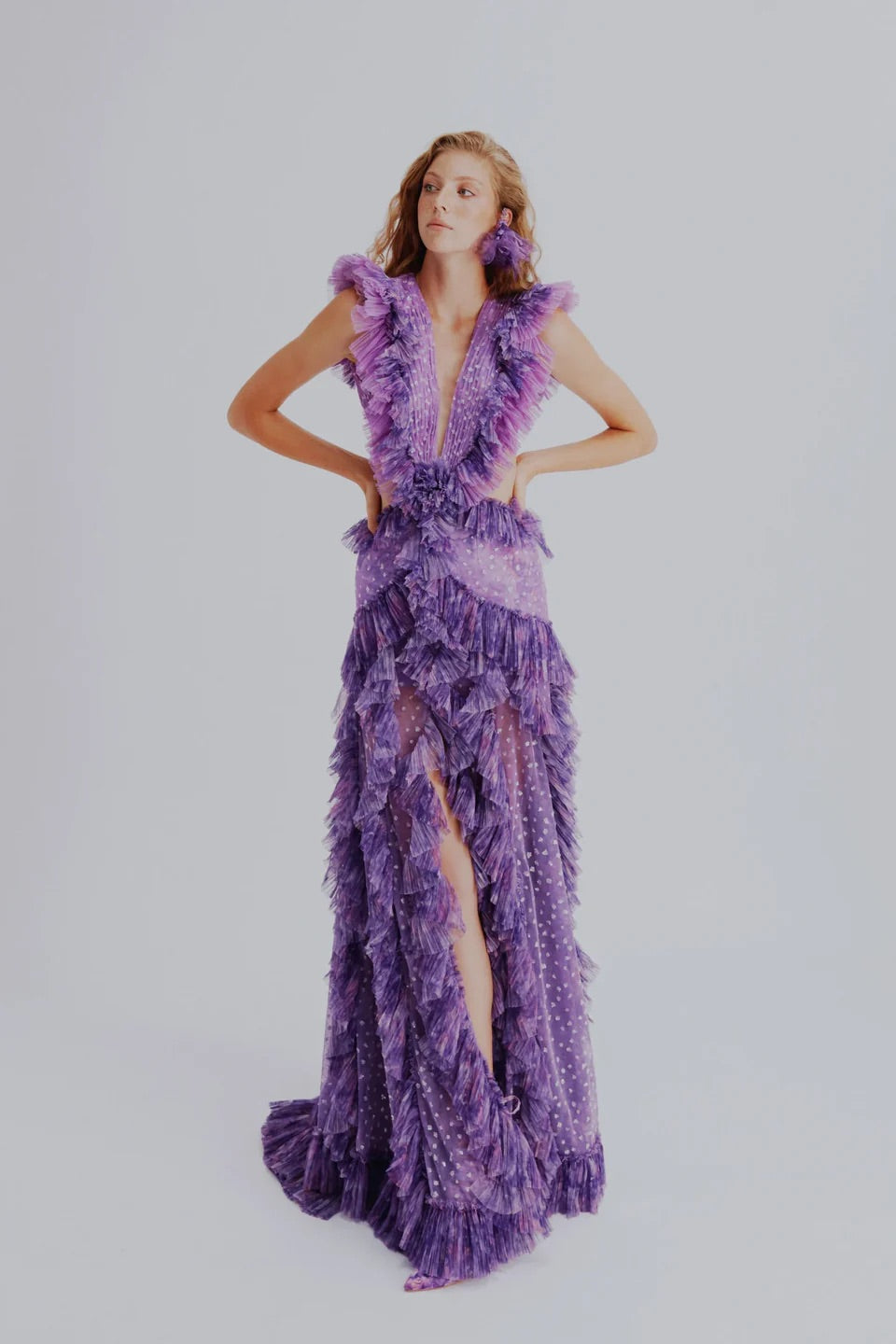 Derin V yaka kesimi ve öndeki yırtmaç detayıyla zarif ama iddialı bir görünüm sunan bu elbise, kat kat inen fırfırlarıyla hareketli ve hacimli bir siluet yaratır. Uzun ve akışkan formu bedeni olduğundan daha uzun gösterirken, katmanlı dokusu feminenliği cesurca vurgular.