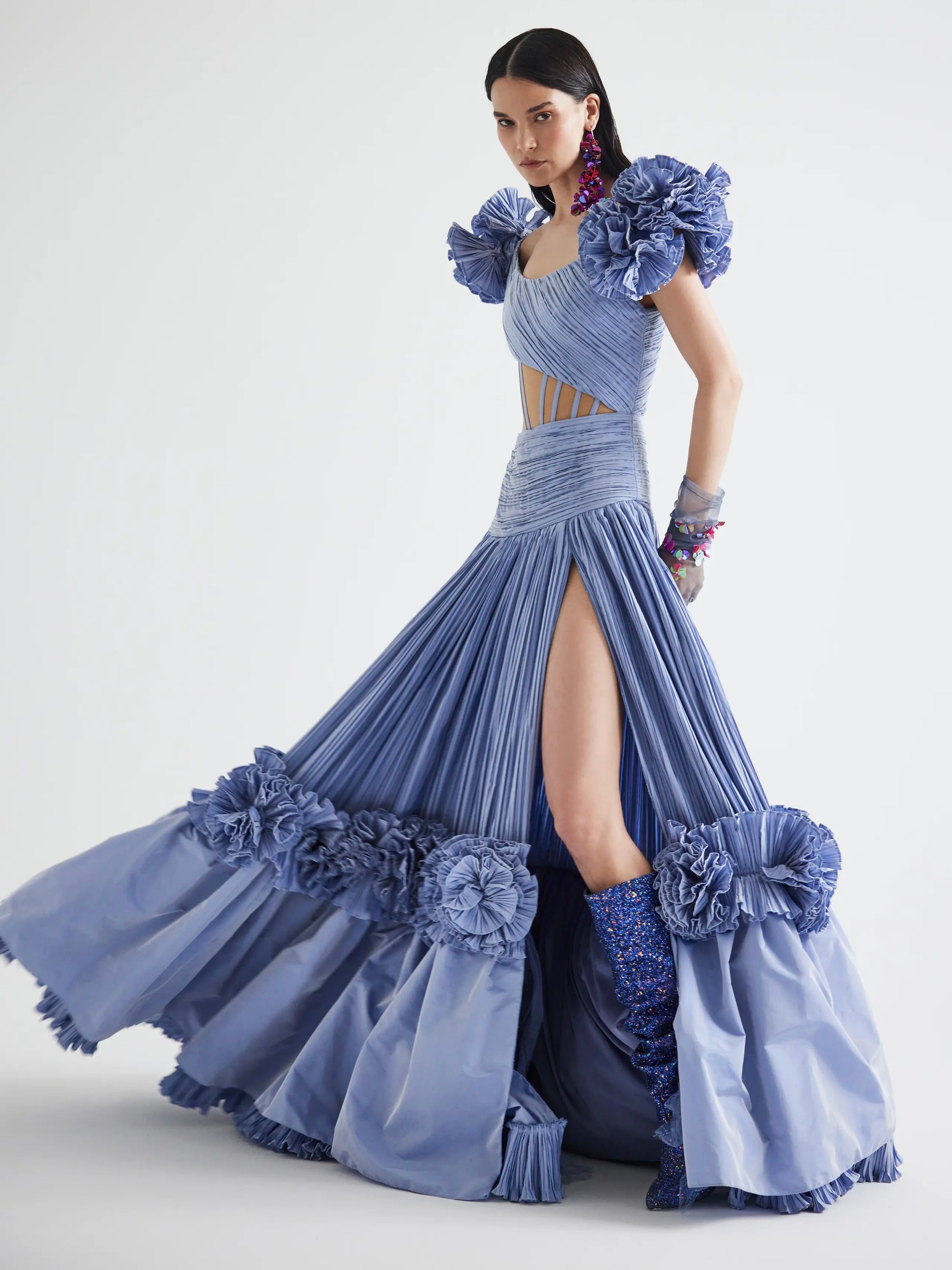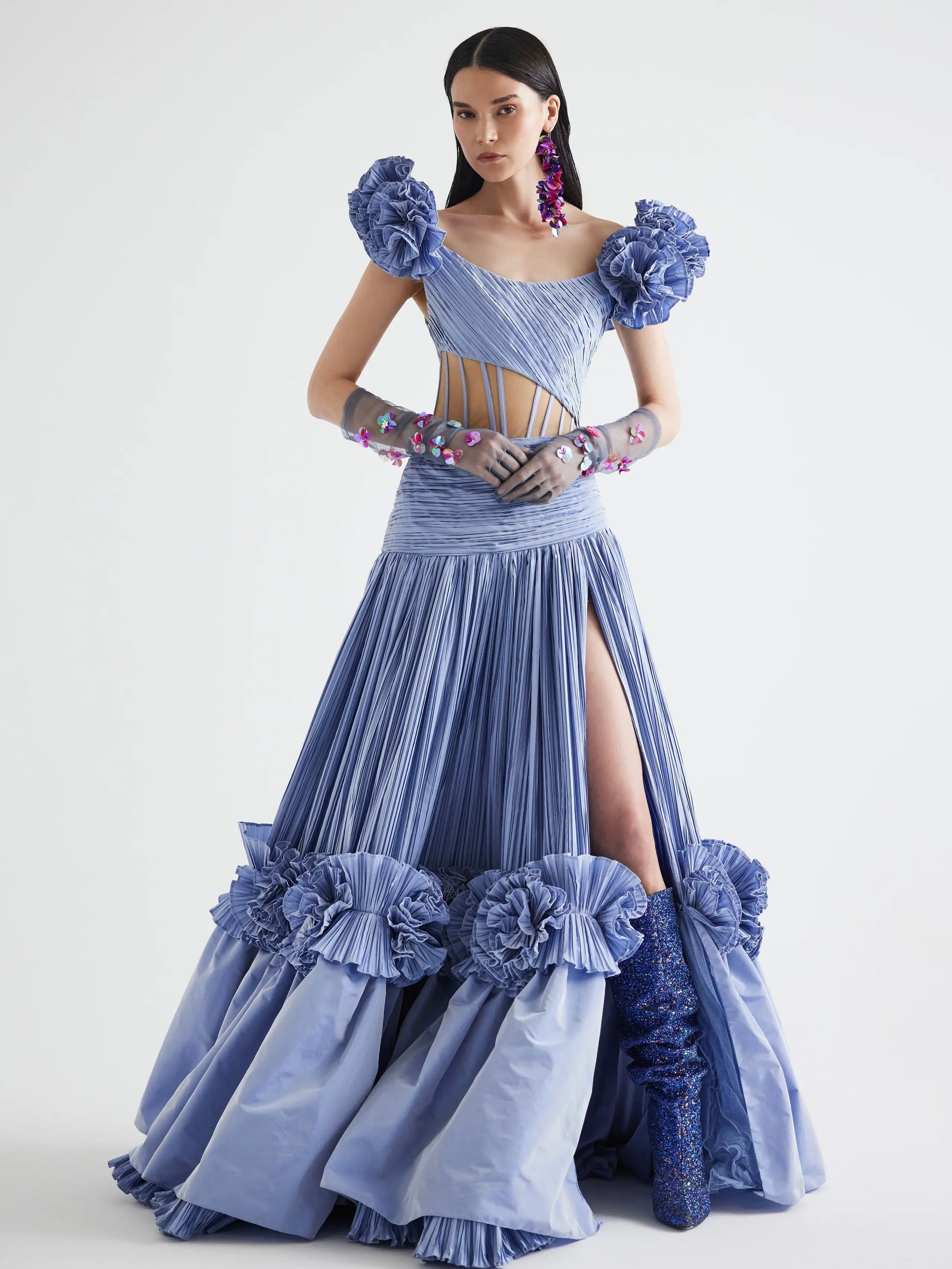 Haleia imzası taşıyan bu iddialı elbise, hacimli silueti ve zarif tasarımıyla göz kamaştırıyor. Drapeli göğüs ve bel bölgesi, feminen hatları vurgularken, pilili etek yapısı her adımda teatral bir etki yaratır. Omuz ve etek kısmındaki fırfır detayları, elbiseye hem modern hem romantik bir dokunuş katıyor. Yüksek yırtmacı sayesinde güçlü ve özgür bir stil sunan bu parça, özel davetler, kır düğünleri ya da kırmızı halı anları için tasarlandı. Arka kısmında yer alan fermuarla kolayca giyilebilir.
