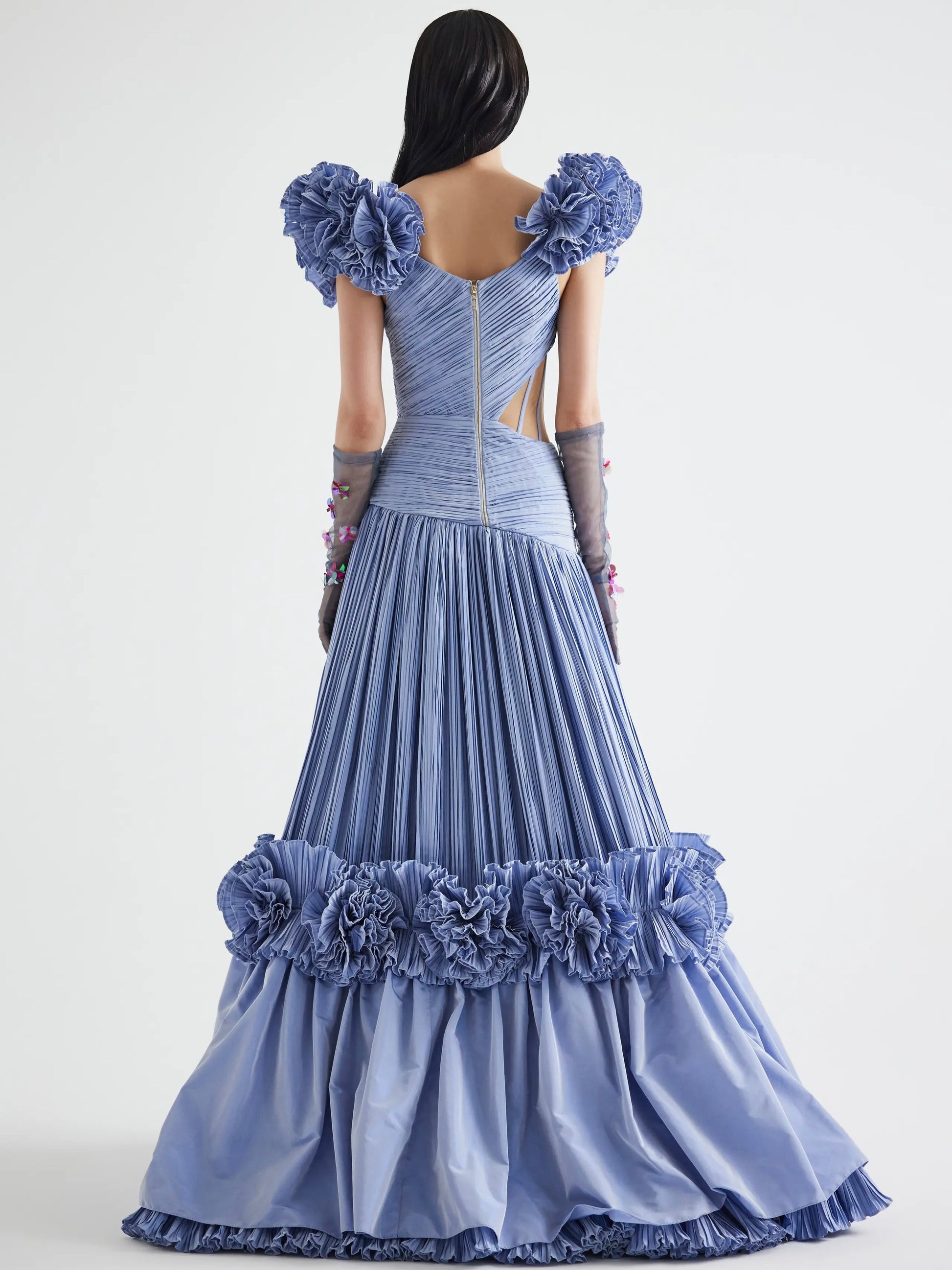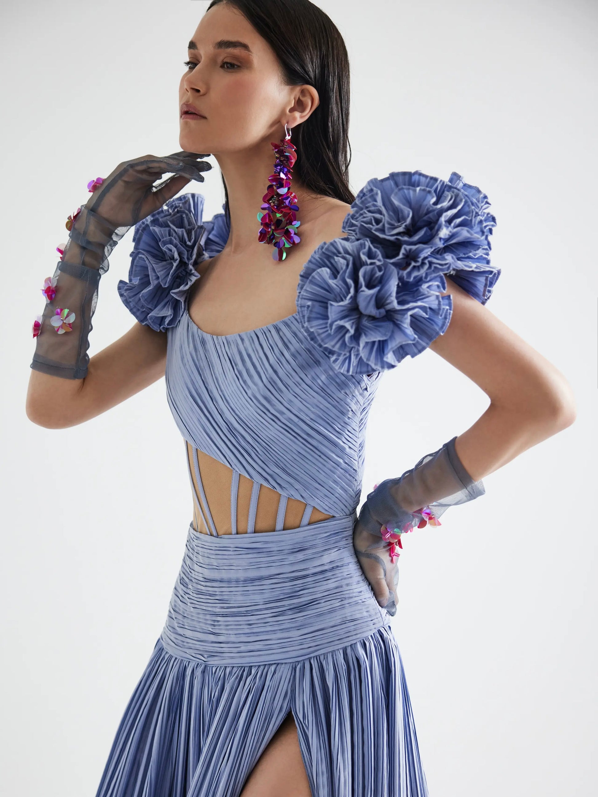 Haleia Drapeli ve Volan Detaylı Mavi Maxi Elbise