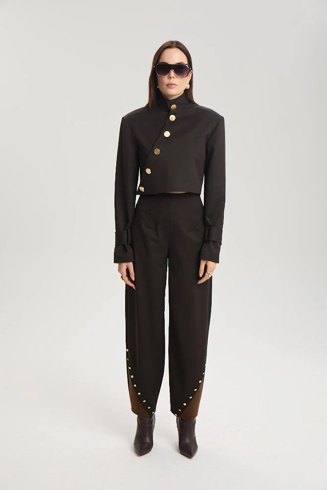 Tasarım Detayları: Cropped kesim, uzun kollu, asimetrik ön kapanış, altın rengi düğme detayları
