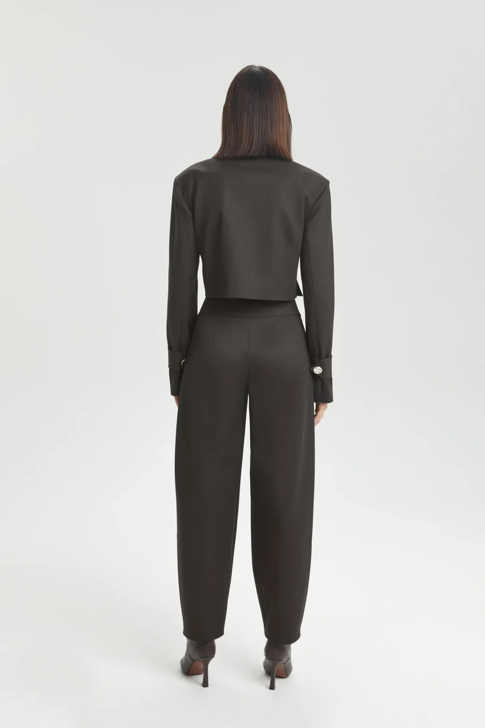 Haleia’nın sofistike dokunuşunu yansıtan asimetrik kapanışlı cropped ceket, modern ve güçlü bir silüet sunuyor. Uzun kollu tasarımı altın rengi düğmelerle hareket kazanırken, asimetrik ön kapama detayı klasik ceket formuna özgün bir yorum katıyor. Yüksek bel pantolonlar ve eteklerle kombinlenebilecek ideal bir parça olarak dikkat çekiyor.