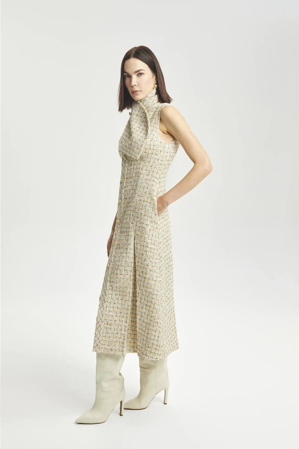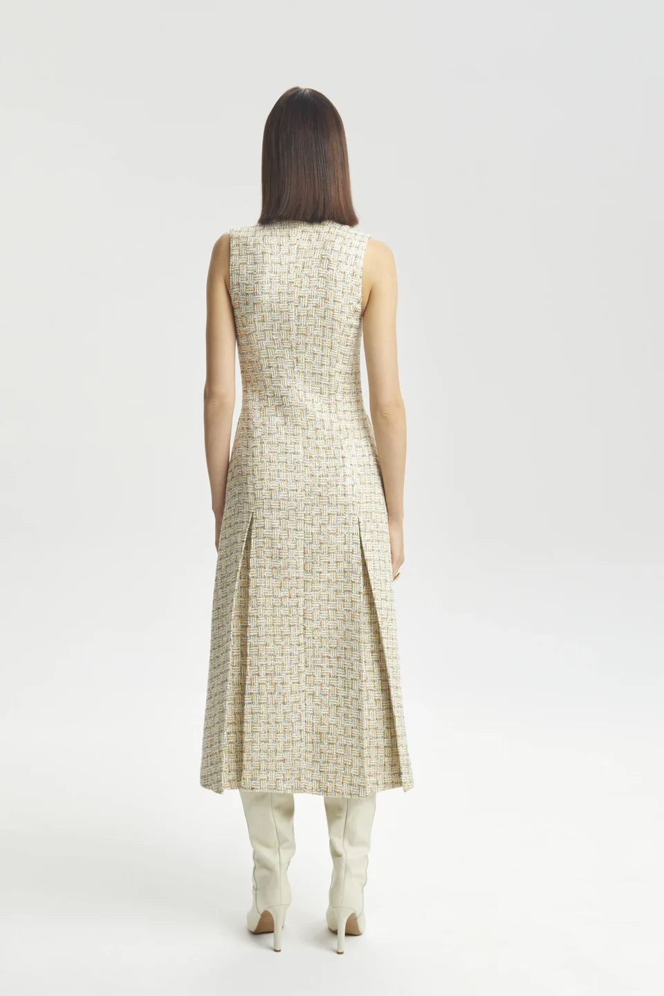 Zengin buklet dokusunu modern bir silüetle buluşturan bu kolsuz elbise, altın rengi metal aksesuarları ve öndeki çıtçıt düğmeli kapamasıyla sofistike bir görünüm sunar. Yumuşak kontrast panellerle hareket kazanan tasarım, hem tek başına hem de katmanlı kombinlerde kullanılabilecek çok yönlü bir parçadır.