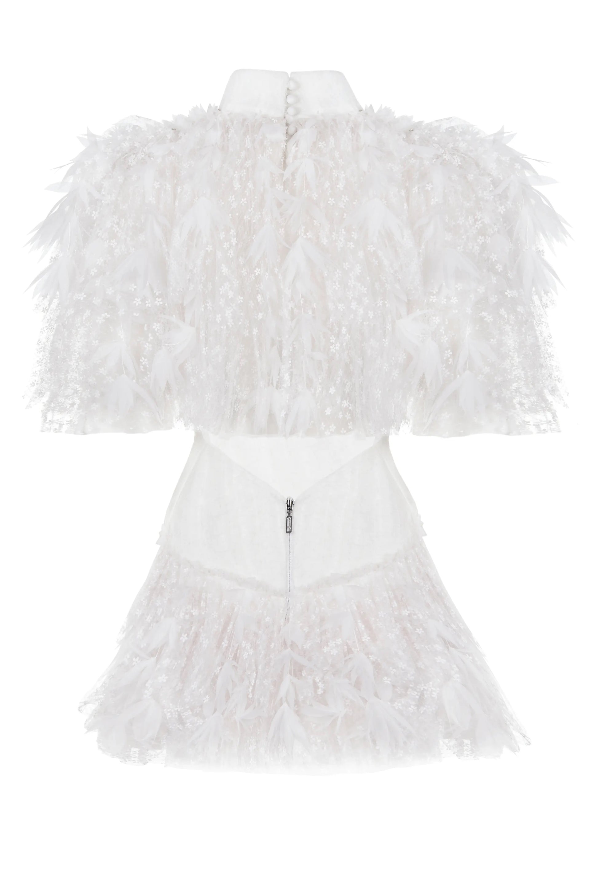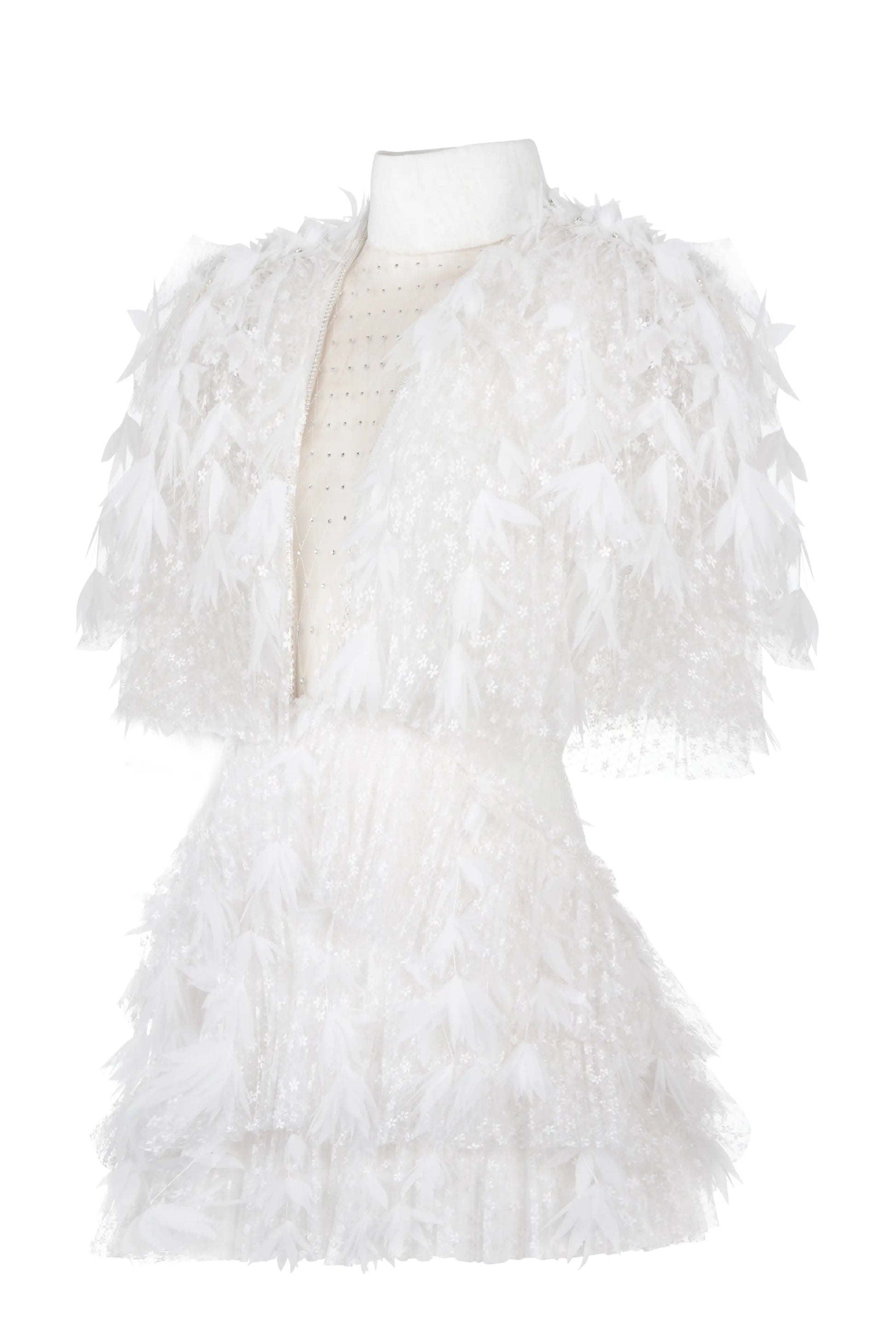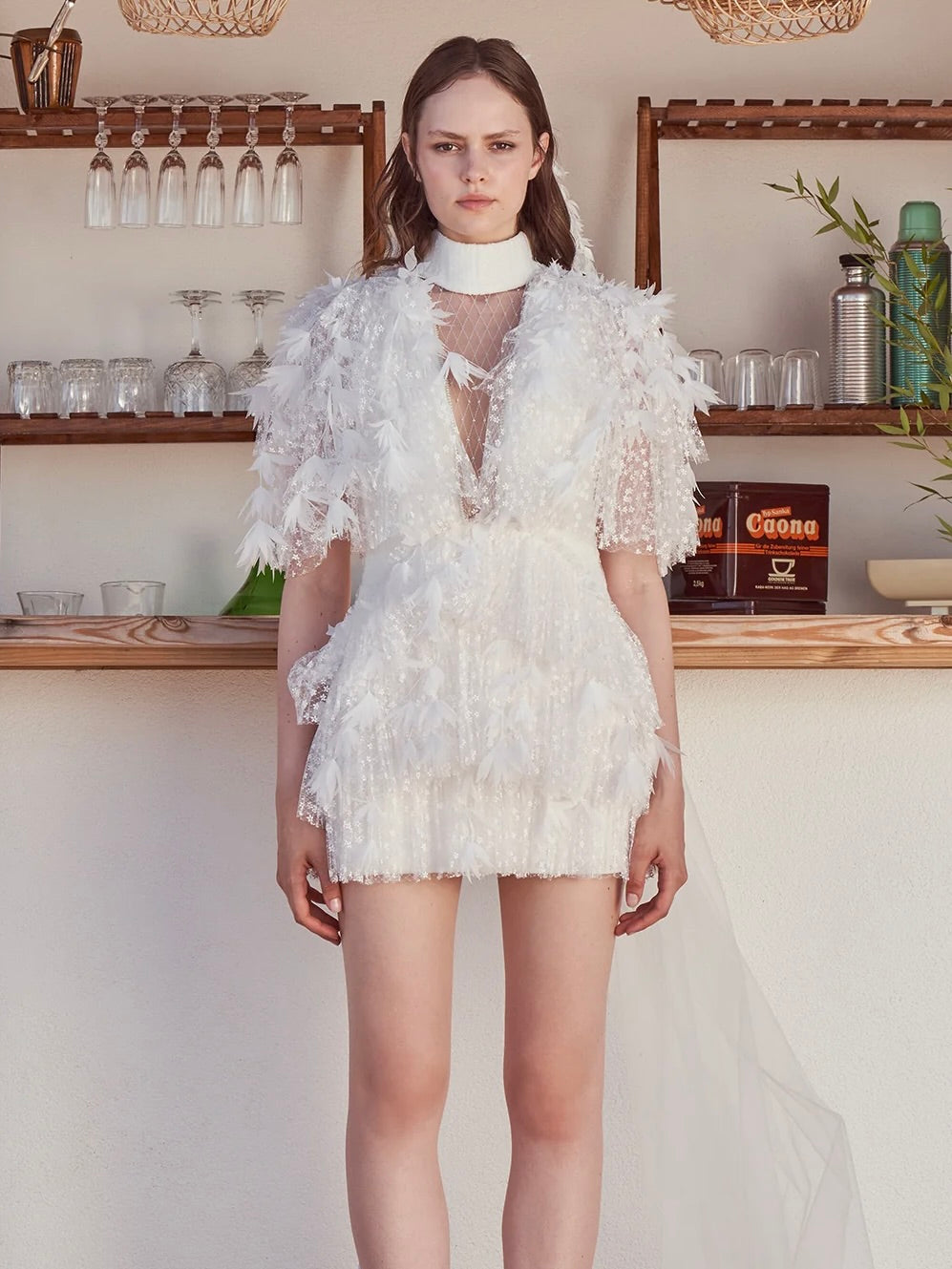 Geleneksel gelinlik anlayışını modern dokunuşlarla yeniden tanımlayan bu Haleia tasarımı, mini boy kesimiyle cesur bir zarafet sunar. İnce floral desenli tülden üretilmiş elbise, üzerindeki lazer kesim organze çiçek motifleriyle üç boyutlu bir etki yaratır. Büst ve kalça bölümündeki drape detaylar feminen silueti vurgularken, önden taş desenli tül ile kapatılmış V kesim göğüs dekoltesi sofistike bir çekicilik katar. Arka bölümdeki cut-out detayı ve uzun tül duvak, tasarıma teatral bir hava kazandırır. Slim fit kesimiyle bedeni sarar; özel günlerinizde size unutulmaz bir duruş sunar.