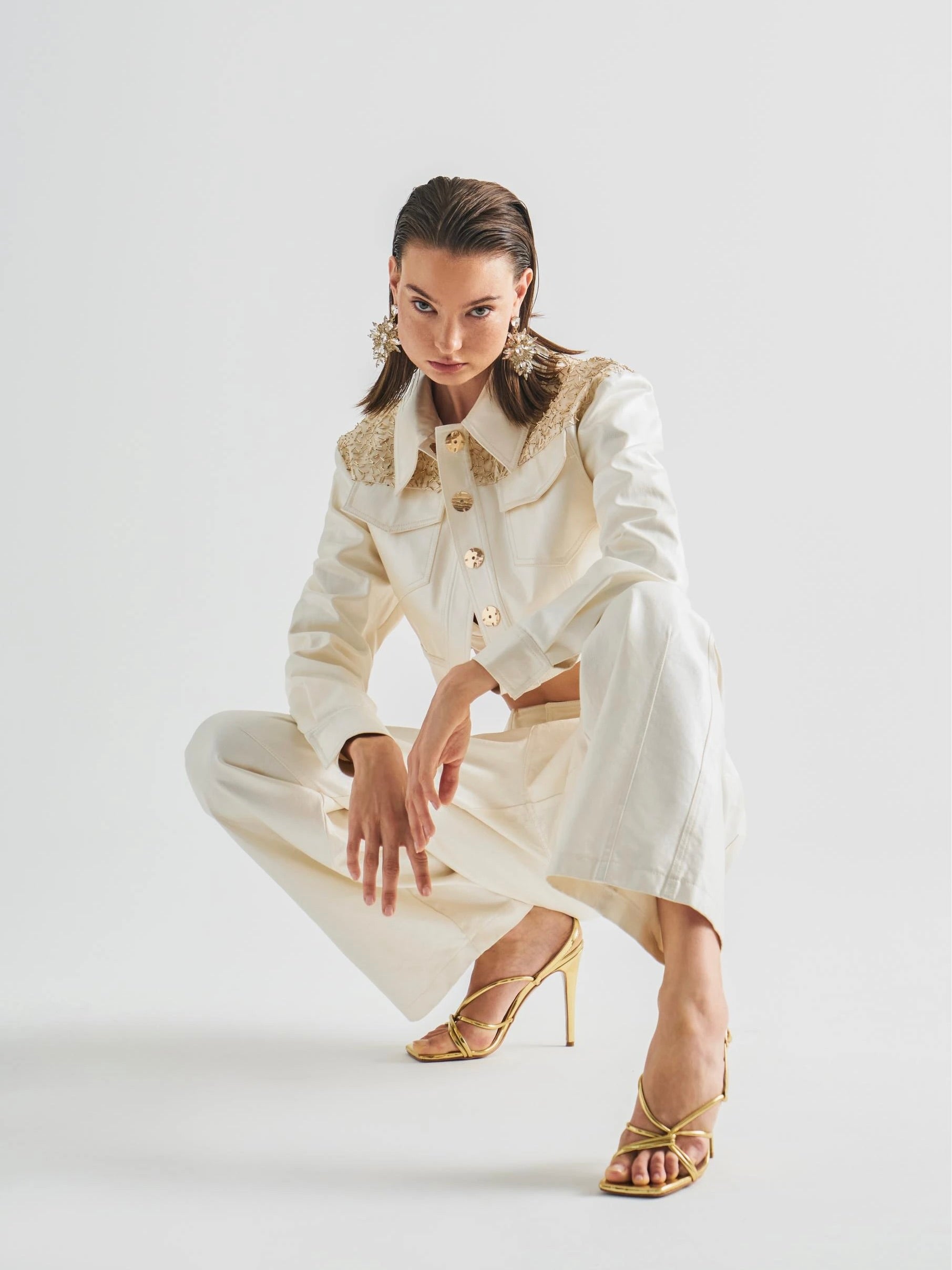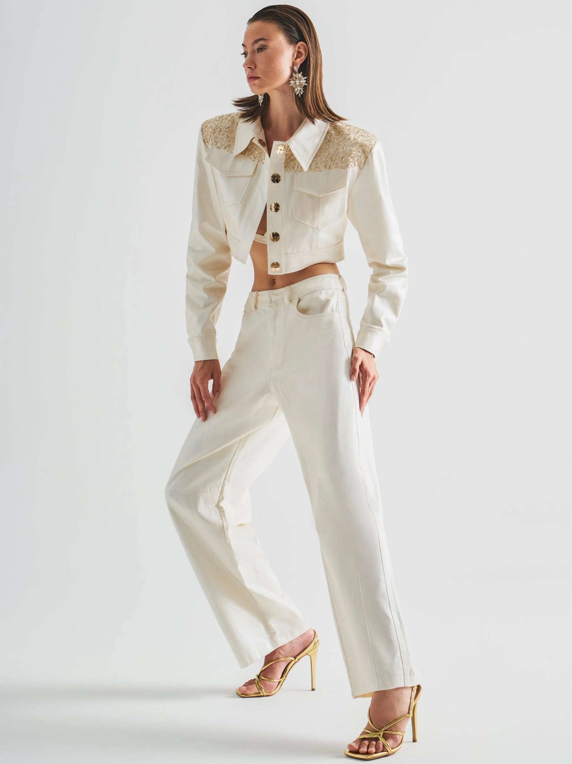 Bu zarif crop ceket, omuzlardaki işleme detayları ve kapitone efektli kapak cepleriyle güçlü bir stil ifadesi yaratıyor. %100 pamuklu kaplamalı denim kumaşı sayesinde hem yapısal bir duruşa sahip hem de rahat bir kullanım sunuyor.