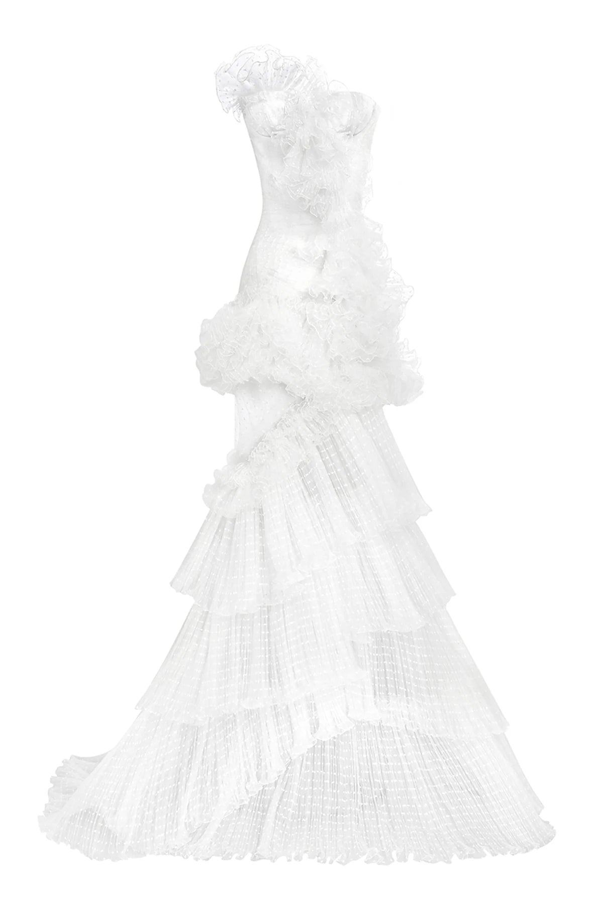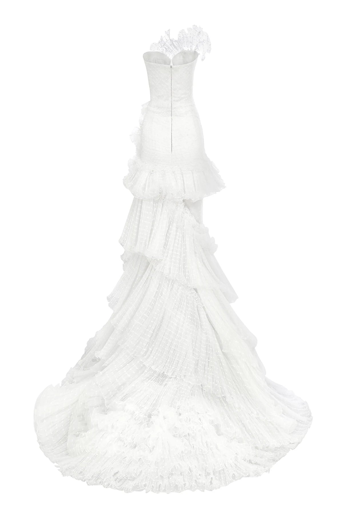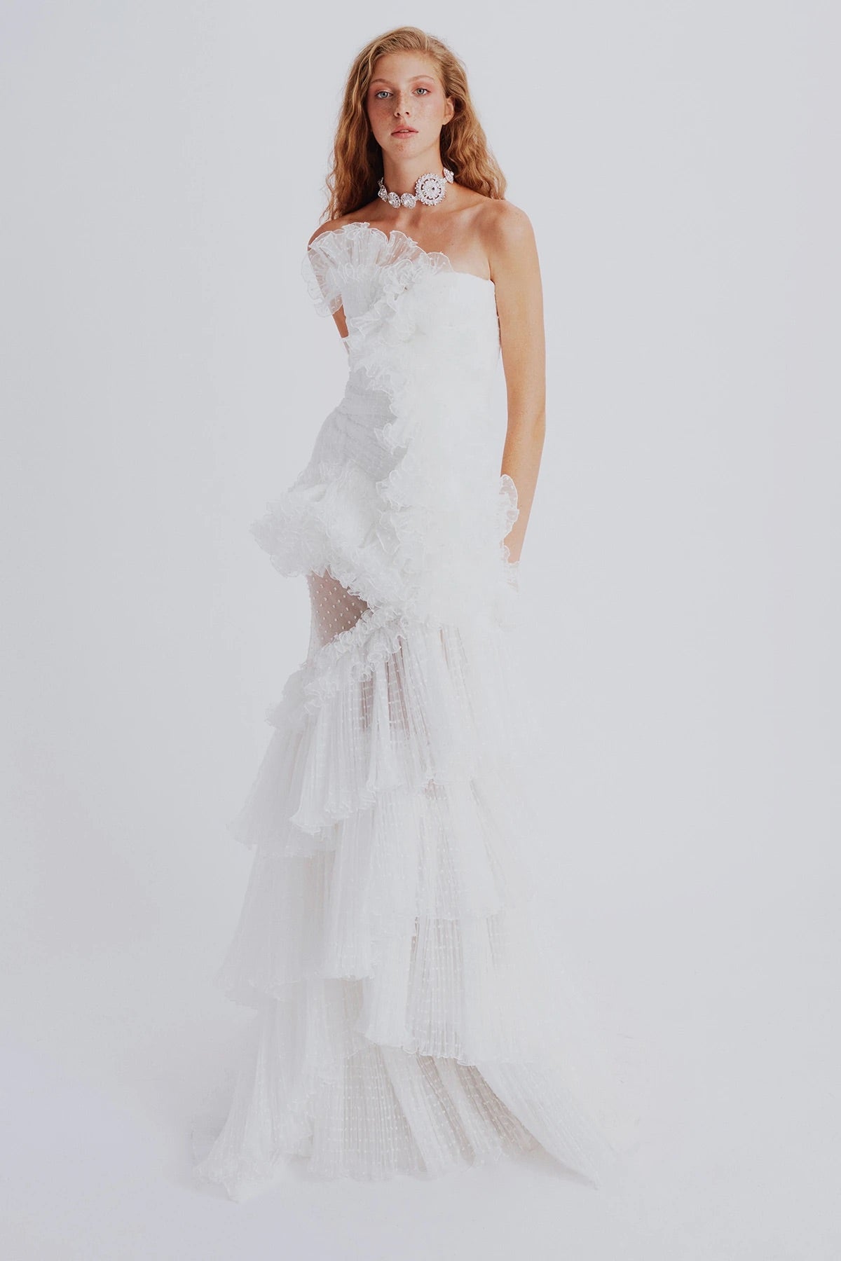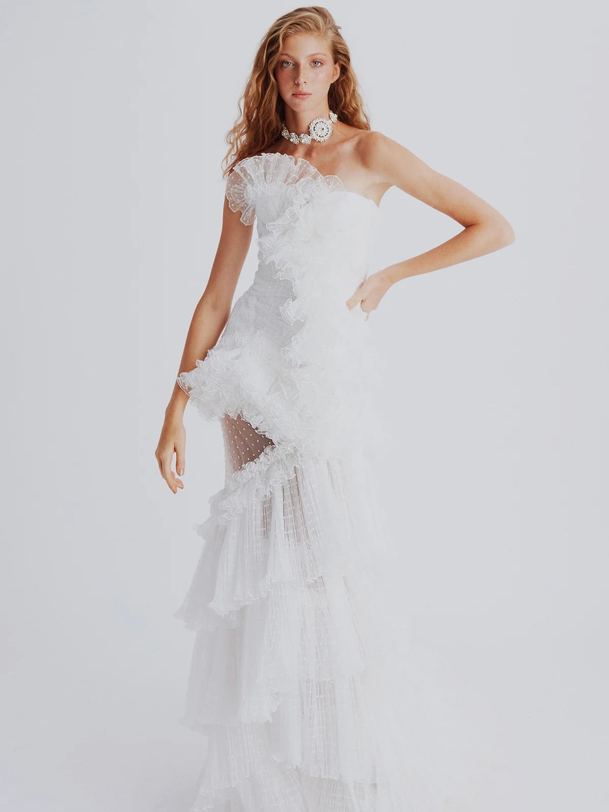 Haleia’nın zarif dünyasından çıkan bu maxi boy gelinlik, puantiyeli organze kumaşı ve ton-sür-ton krep saten astarıyla romantizmi modern çizgilerle buluşturuyor. Straplez kesimi ve asimetrik zigzag volan detaylarıyla feminen bir görünüm sunarken, etek boyunca devam eden kat kat pileli yapı, modele hacim ve hareket kazandırıyor. Belden oturan formuyla vücut hatlarını zarifçe vurgulayan bu özel parça, arka kısmındaki fermuarla tamamlanıyor.