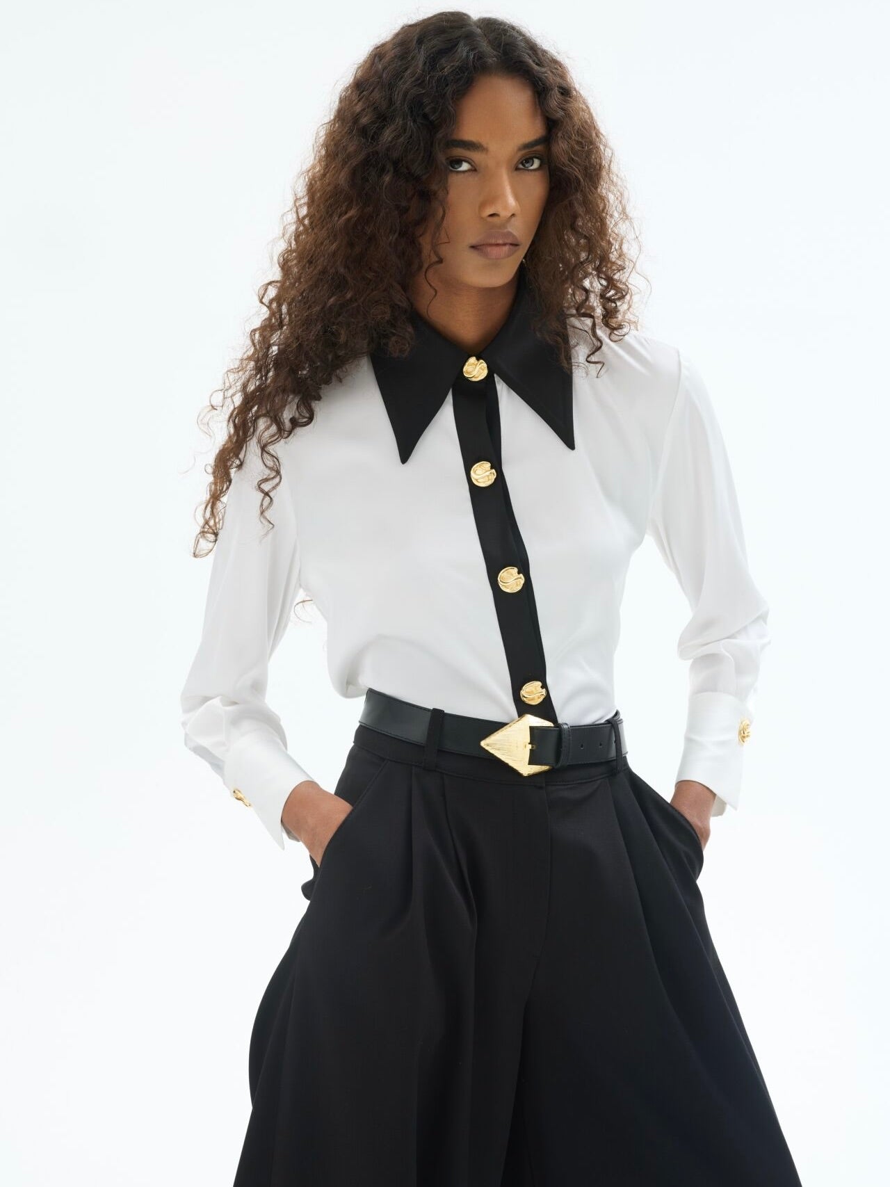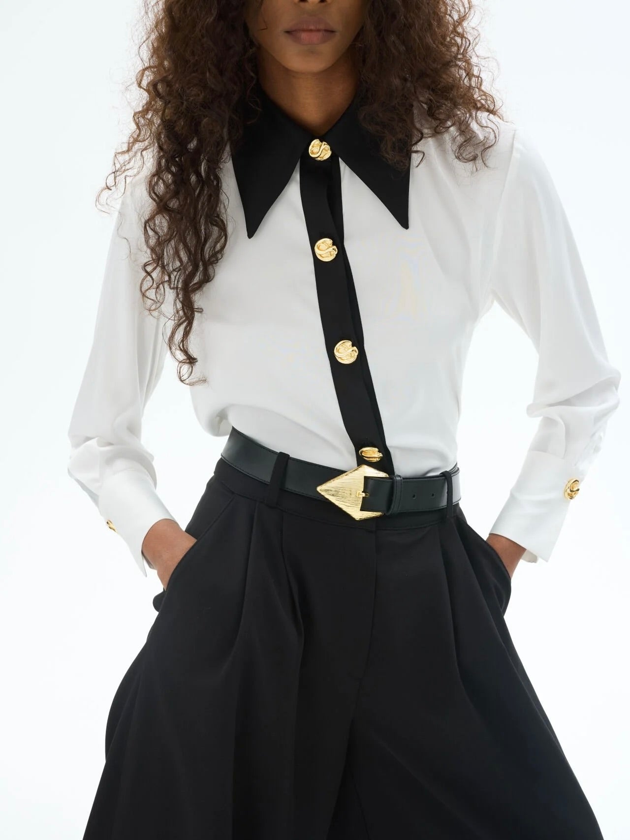Geniş kontrast yaka ve düğme şeridi