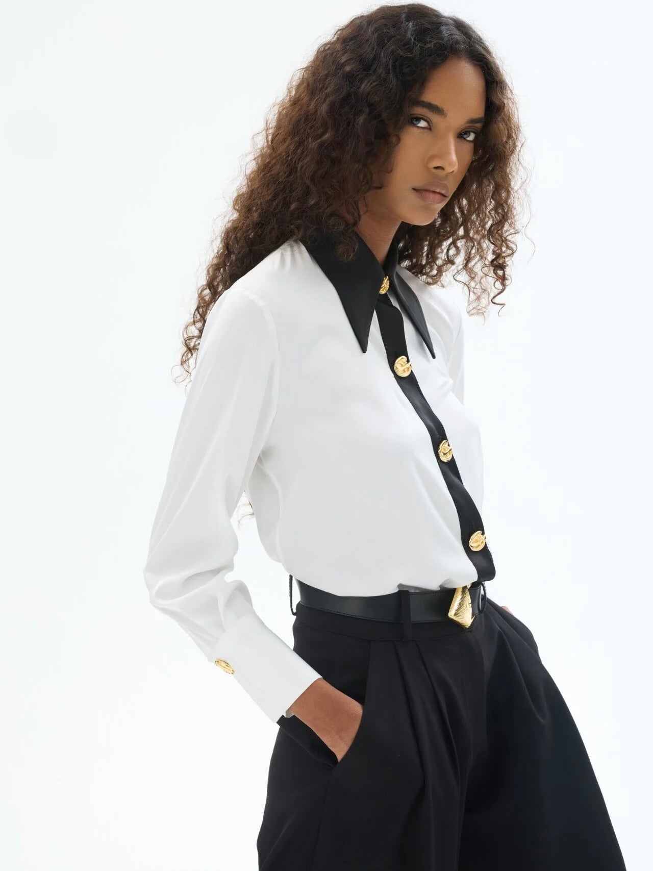 Regular kesimiyle rahat bir şıklık sunan bu ipek gömlek, siyah geniş yaka ve düğme patı detaylarıyla dikkat çeker. Altın tonlu özel düğmeleriyle zarafeti detaylarda yaşatan tasarım, gardırobunuza güçlü bir karakter kazandırır.