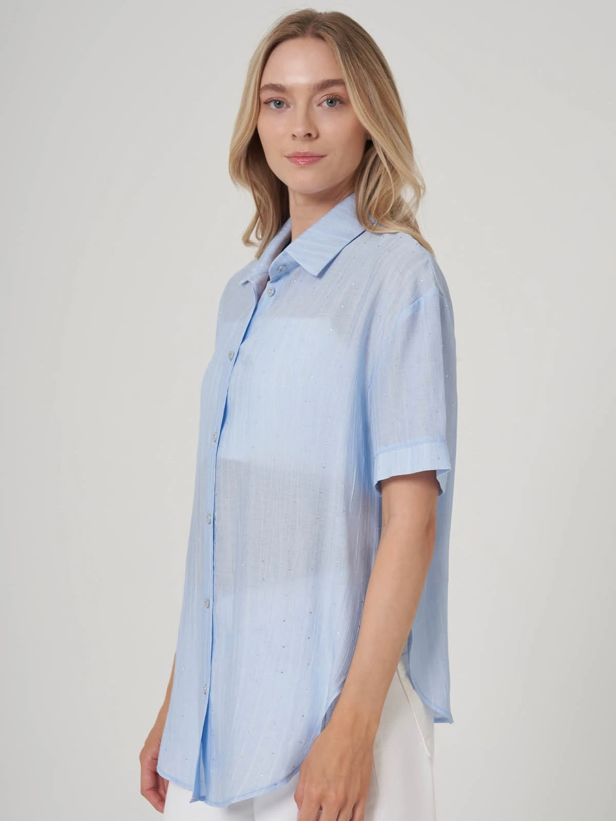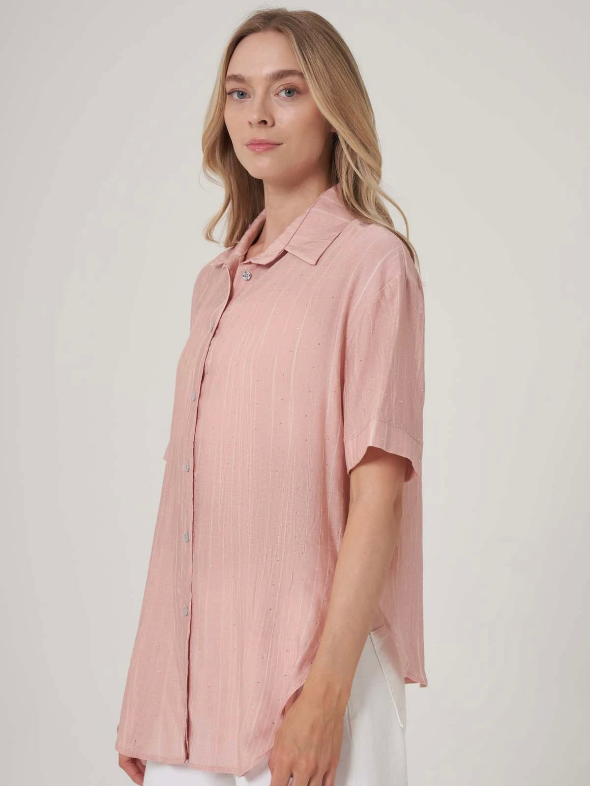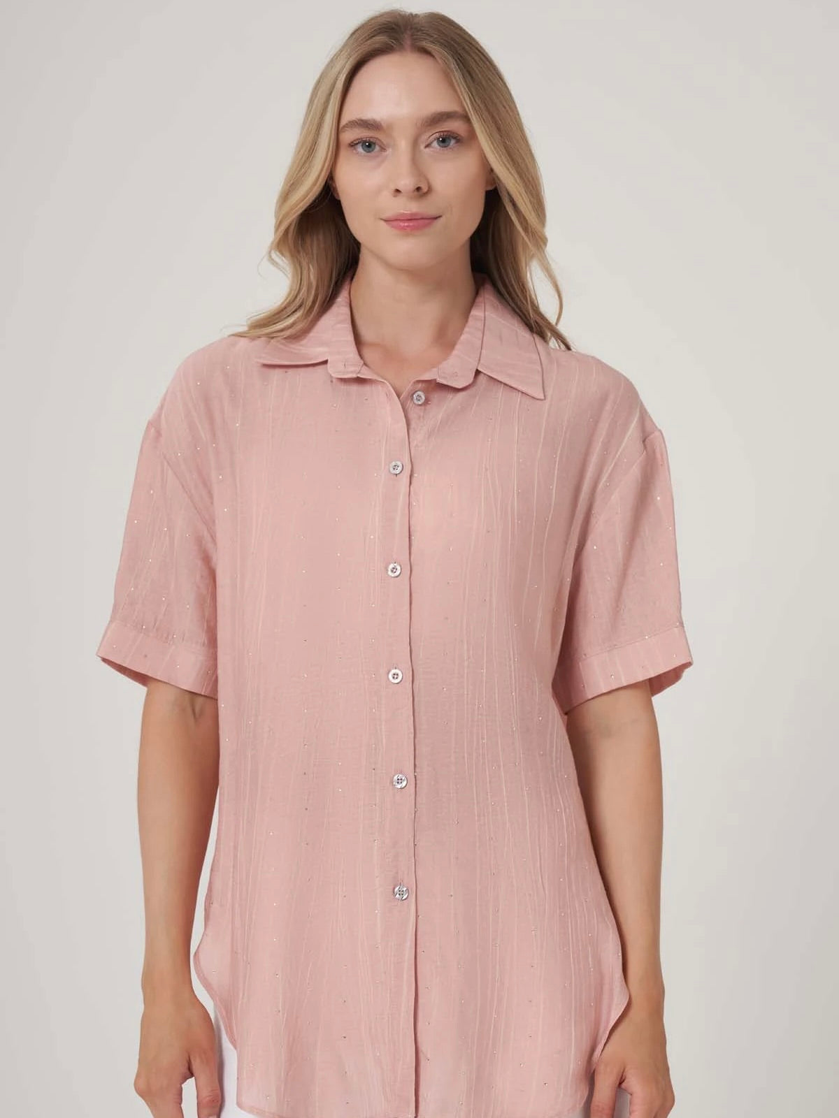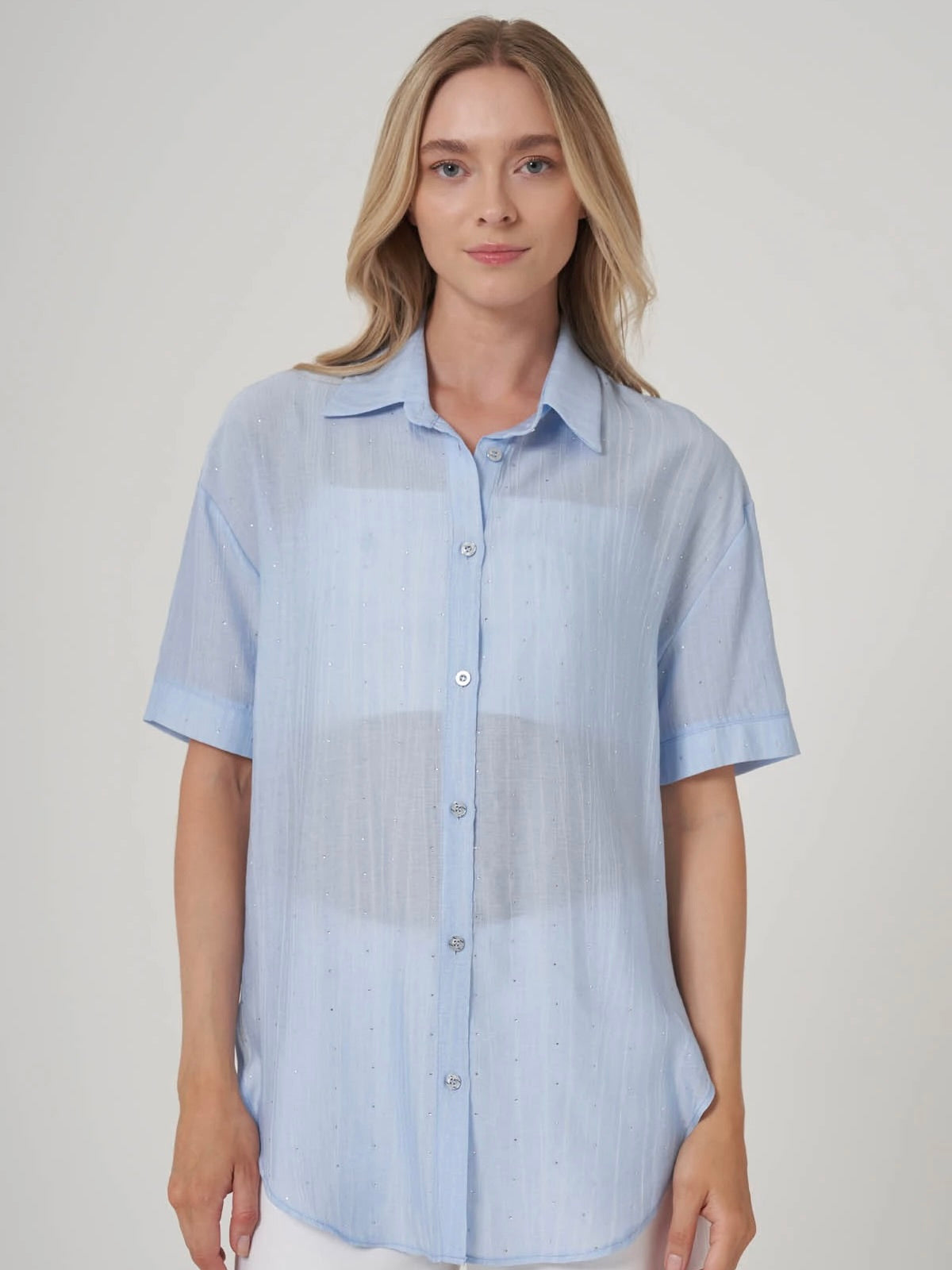 Zamansız rahatlık ve ince ışıltının bir araya geldiği bu oversize gömlek, dört farklı renk seçeneğiyle her tarza uyum sağlıyor. Hafif transparan yapısı ve dikine çizgili dokusu, doğal ışıkta zarif bir etki yaratırken, üzerine serpiştirilmiş mikro taş detayları gündelik görünümlere sofistike bir dokunuş katıyor. Kısa kollu tasarımıyla yaz ayları için ideal olan bu parça, gömlek yakası ve önden düğmeli formuyla klasik stil severler için modern bir alternatif sunuyor.