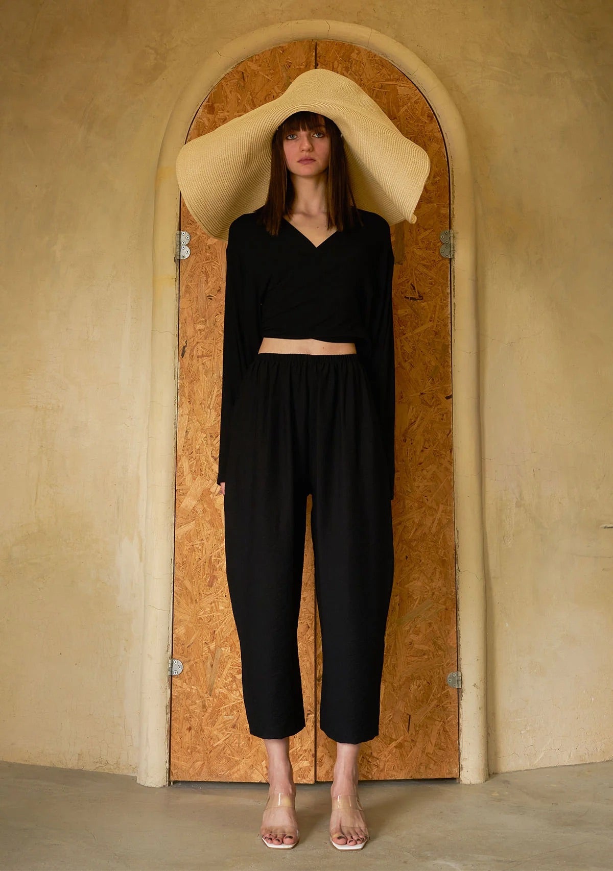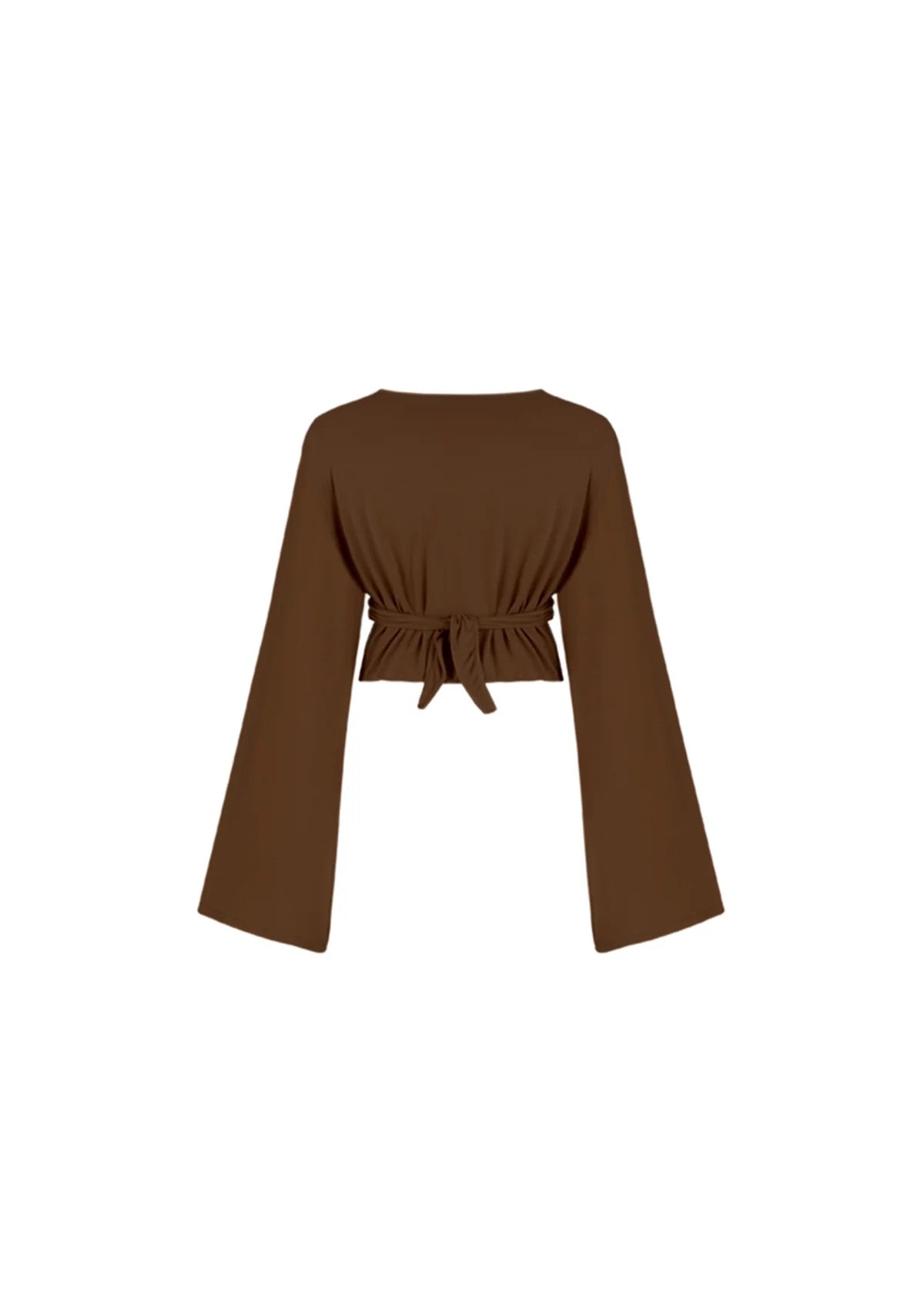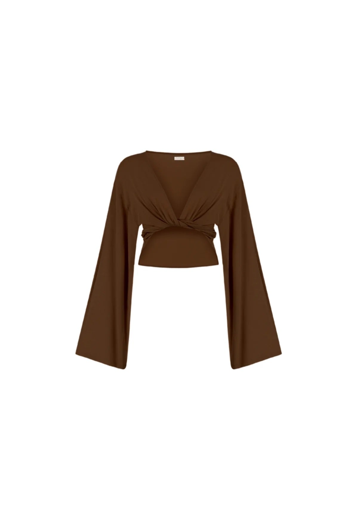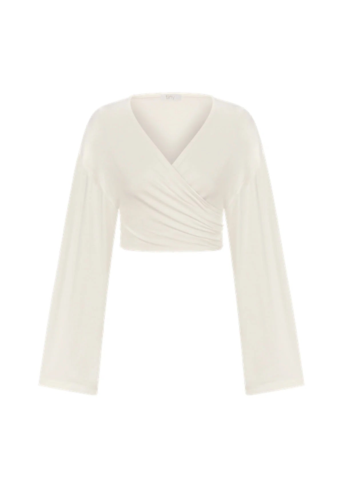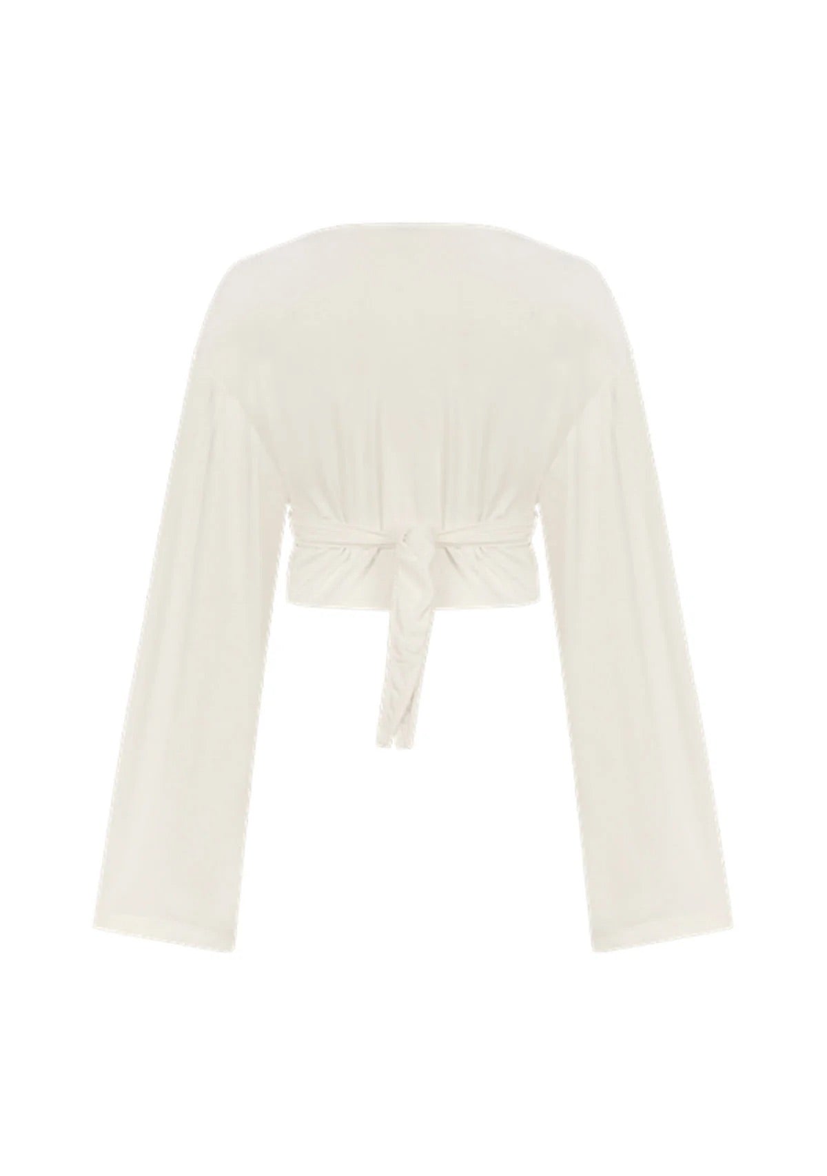 Yumuşak dokulu kumaşıyla teninize nazikçe temas eden bu uzun kollu bluz, bağlamalı ve esnek yapısıyla vücudu zarifçe kavrar. Yarasa kol kesimi, rahat bir hareket alanı sunarken kısa formu ve beli saran bağcıklarıyla feminen bir siluet yaratır.