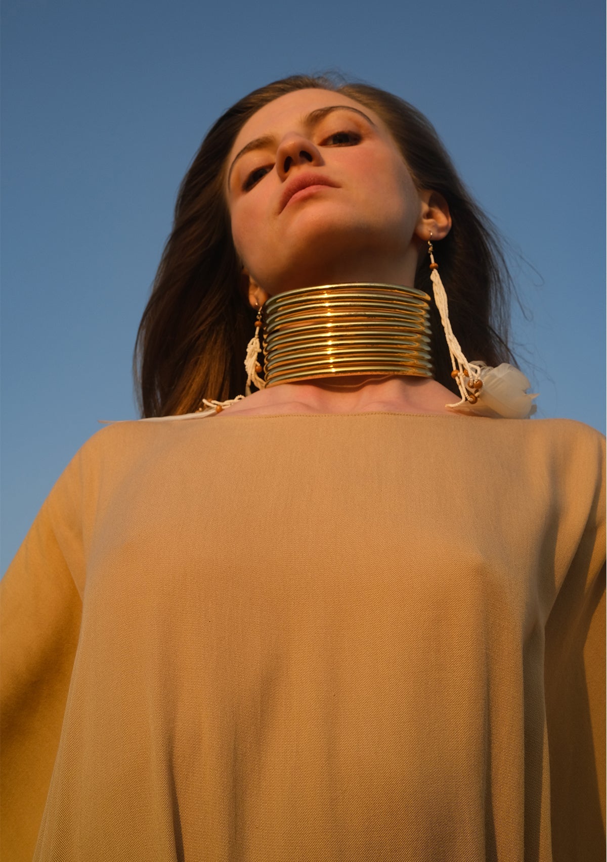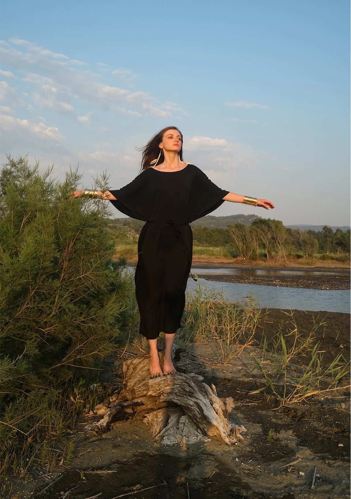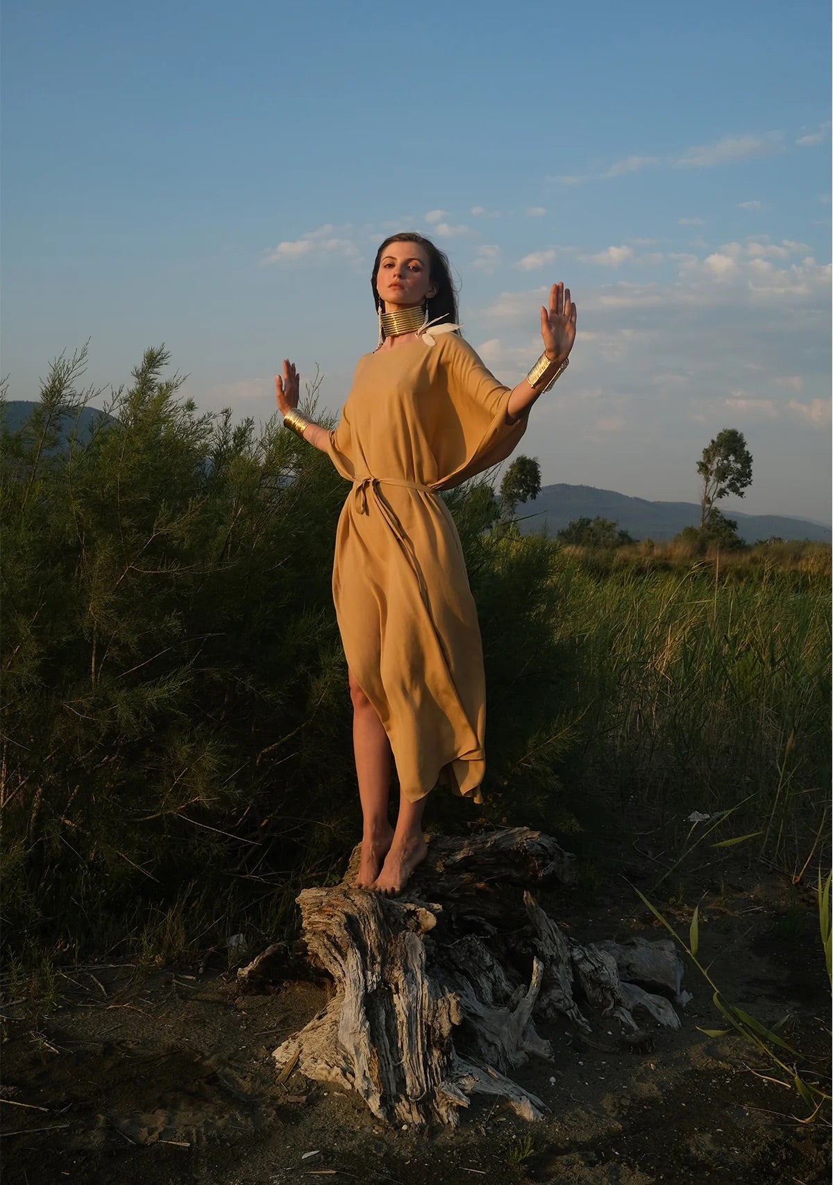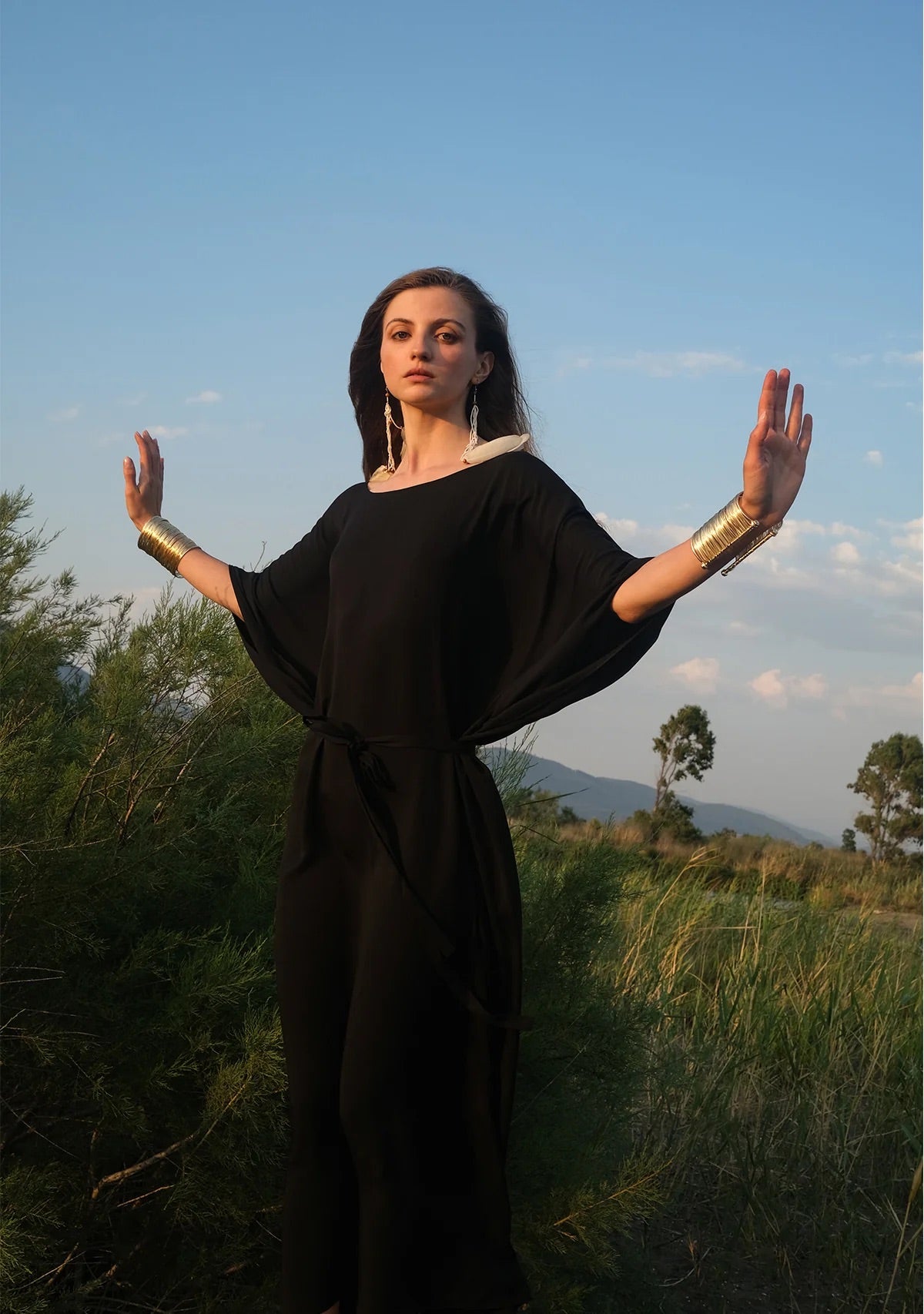 Doğal dökümlü yapısıyla bedenle uyum içinde hareket eden bu kayık yaka elbise, sade şıklığı yeniden tanımlıyor. Geniş kesimi ve beldeki ayarlanabilir kuşağı sayesinde vücuda göre şekil alır. Yan yırtmaç detayları yürürken hafifçe dalgalanarak elbiseye zarif bir hareket kazandırır.