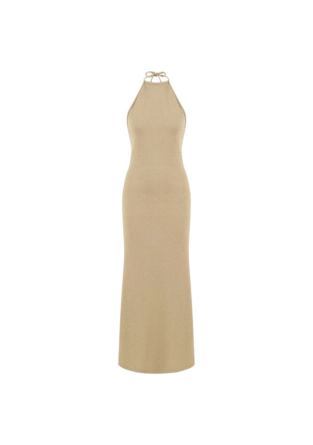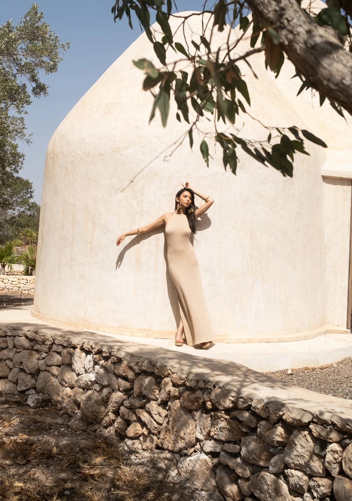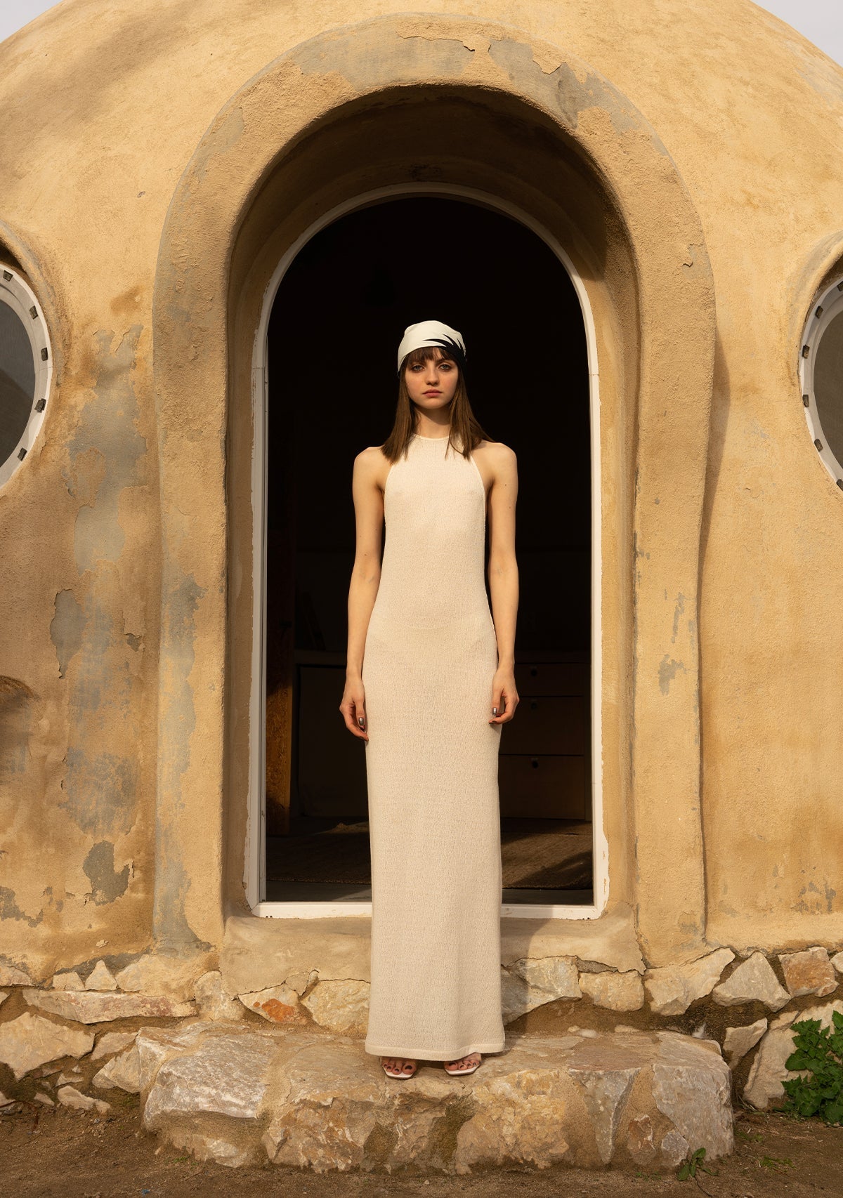 Tiny’nin imza siluetlerinden biri olan halter yaka triko elbise, modern zarafetin en sade haliyle karşında. Boyundan bağlamalı yapısı sırt ve omuzları öne çıkarırken, transparan dokulu triko kumaşı vücut hatlarını zarifçe yansıtır. Bileğe kadar uzanan düz kesimi ve arka yırtmacı, her adımda akış ve konfor sunar. Tek parça bir şıklıkla plajdan akşamüstü davetlerine geçmek isteyenler için tasarlandı.