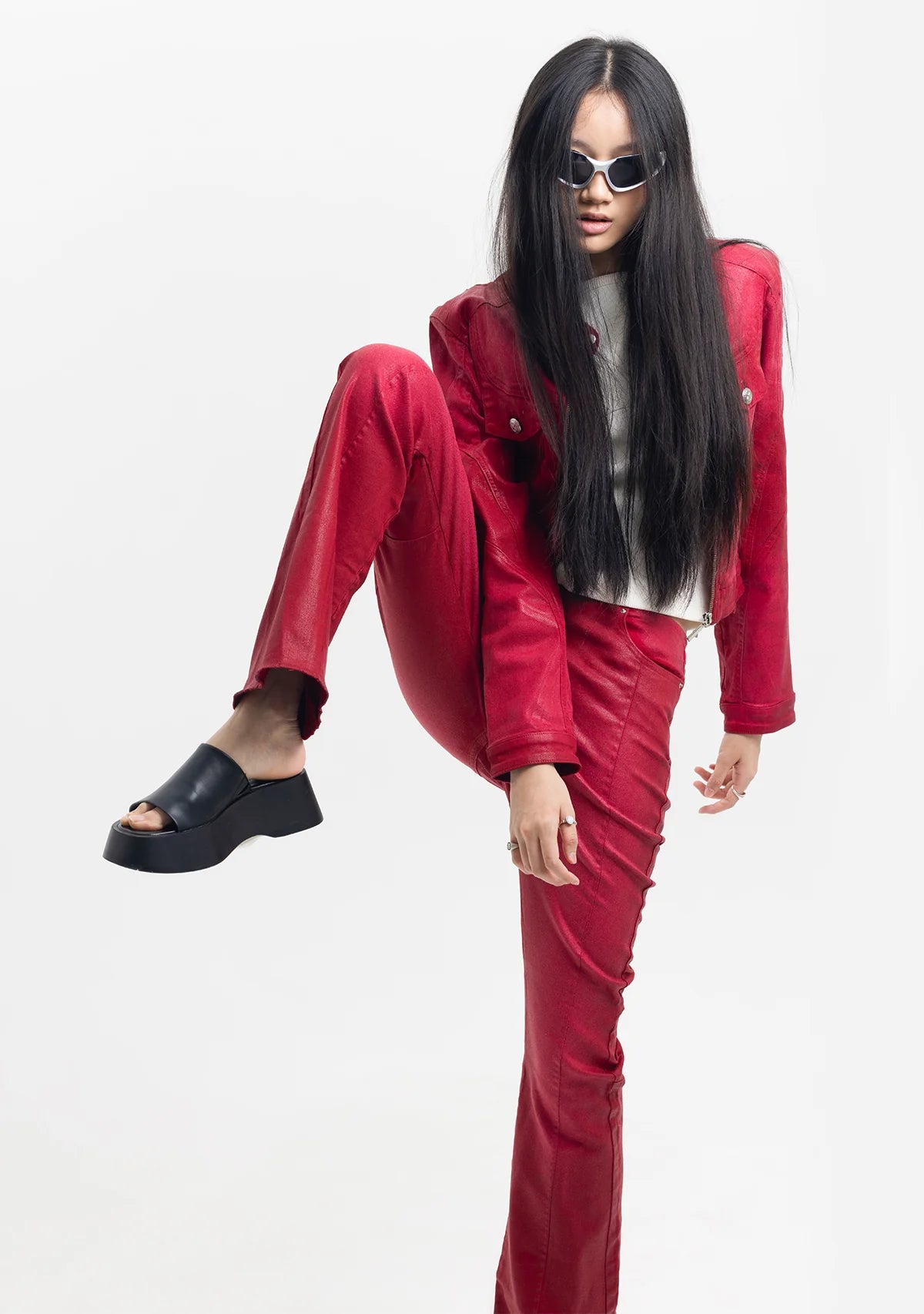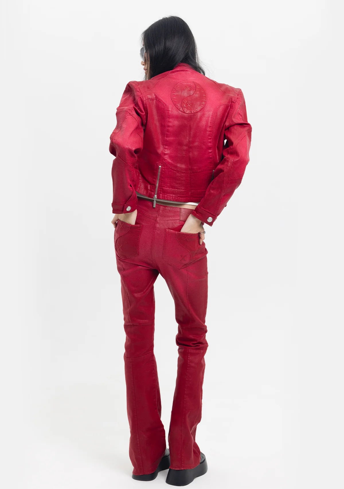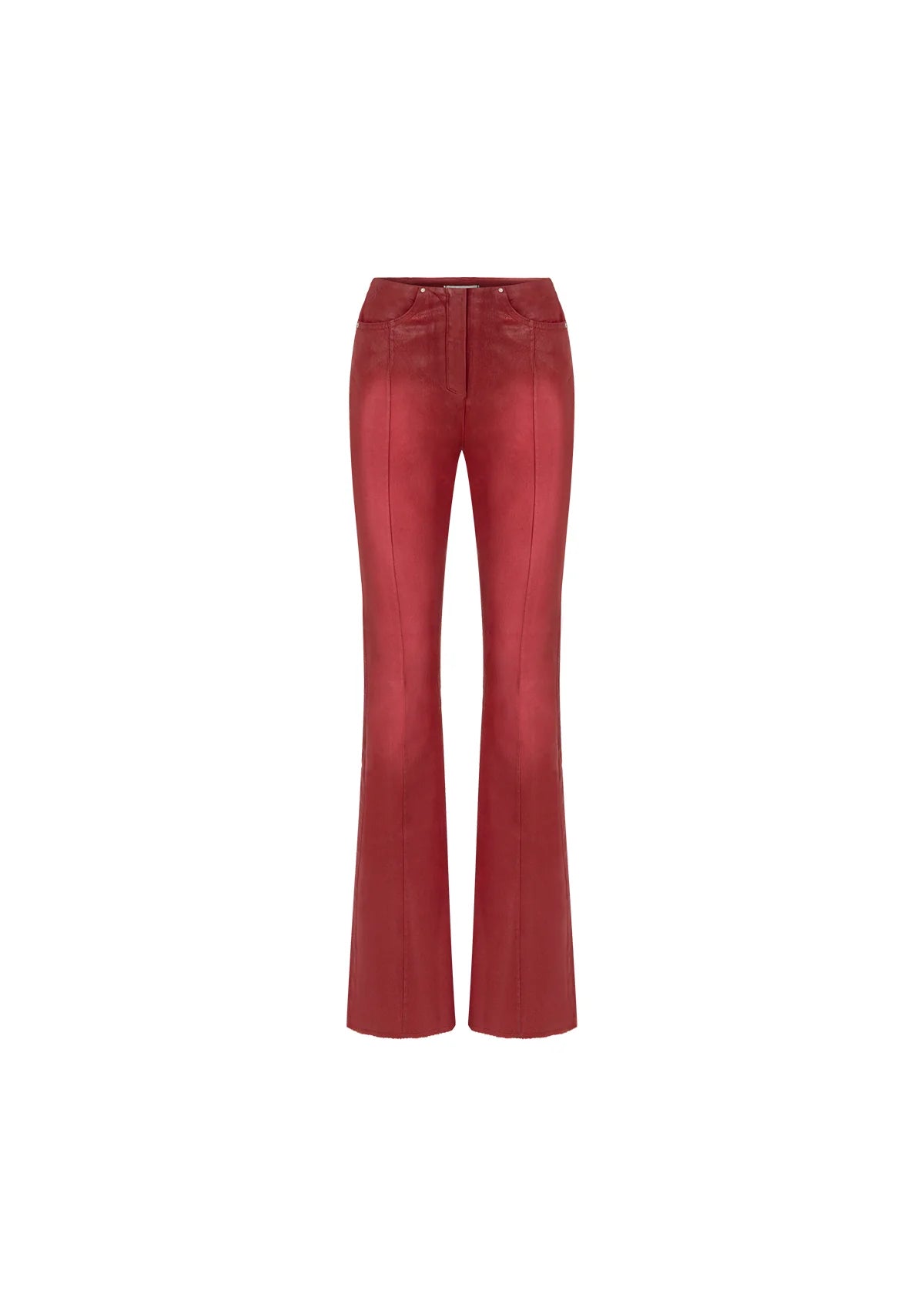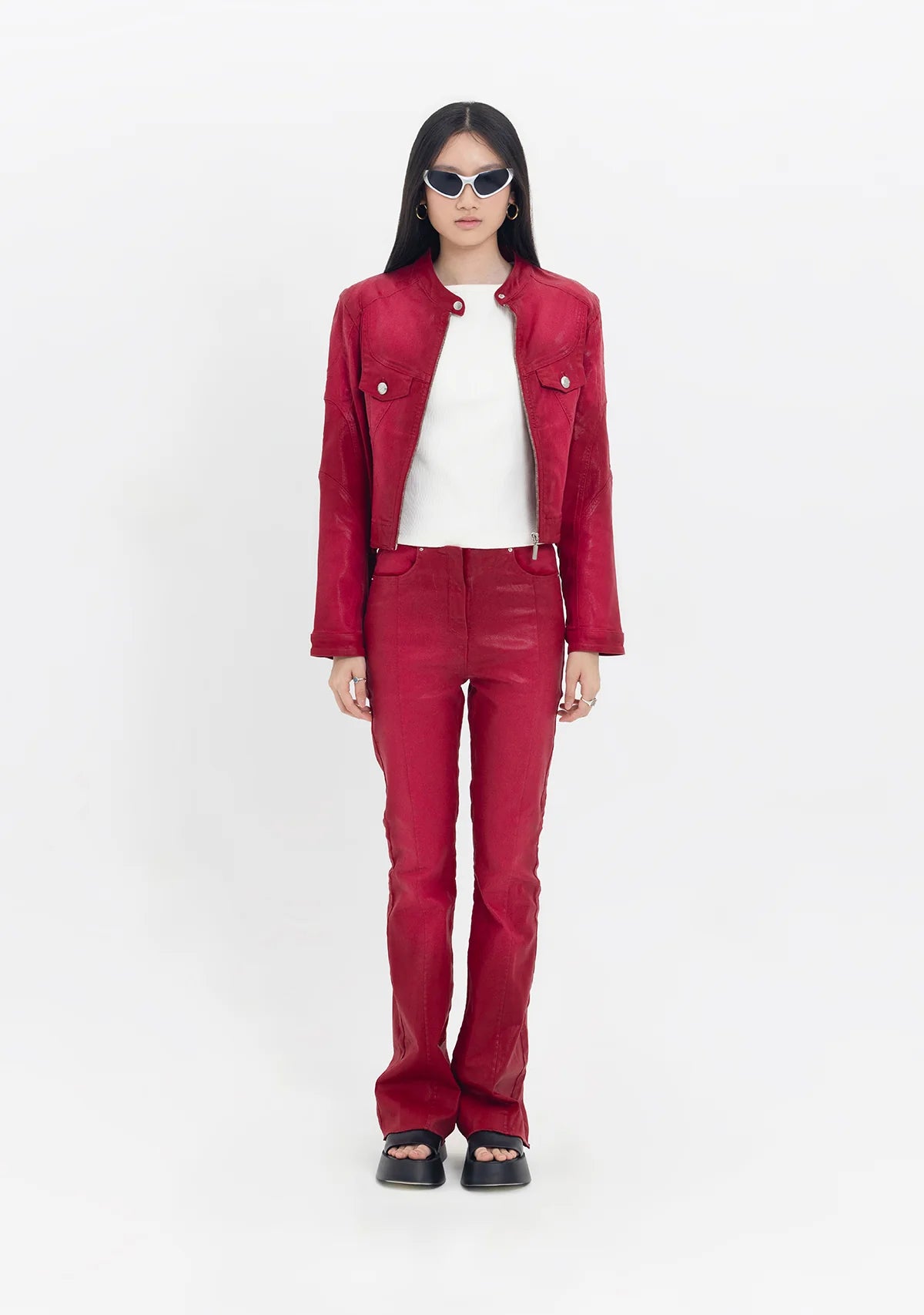 Tiny x Pcfg iş birliğiyle tasarlanan Rebel Harmony pantolon, kırmızı deri görünümlü pamuklu kumaşıyla güçlü ve modern bir ifade yaratıyor. Bele tam oturan kesimi ve ispanyol paça silueti, bacak boyunu zarif bir şekilde uzatıyor. Kemersiz tasarımıyla sade bir şıklık sunarken, önde ve arkada yer alan cepler kullanışlı bir detay katıyor. Hem günlük kombinlerde hem de iddialı gece stillerinde dikkat çekici bir parça olarak öne çıkıyor.
