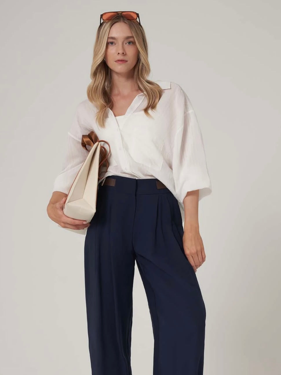 Zamansız duruşu güçlü bir detayla buluşturan bu Utopian pantolon, bel kısmındaki deri kemer dokunuşuyla klasik pileli kesime modern bir yorum katıyor. Rahat ve akışkan dokusu sayesinde gün boyu konfor sunarken, paça bağlama detayı stiline özgün bir siluet kazandırıyor.