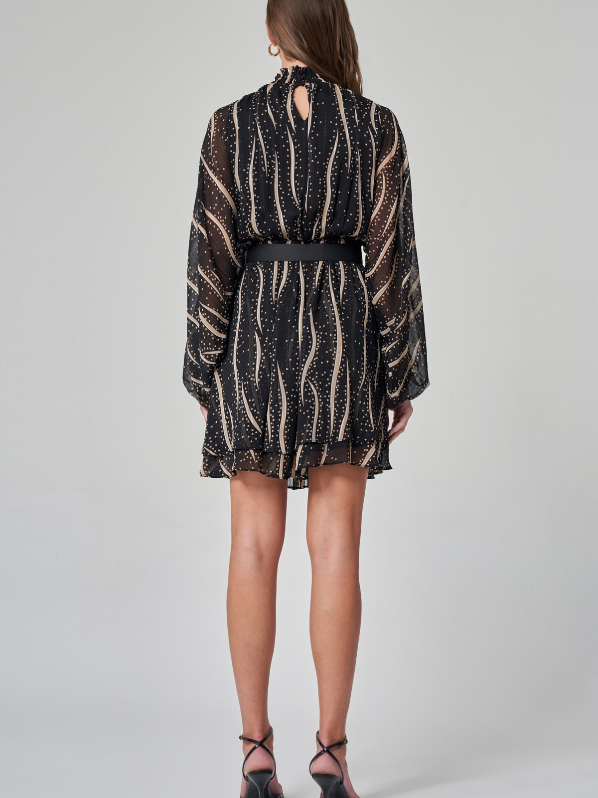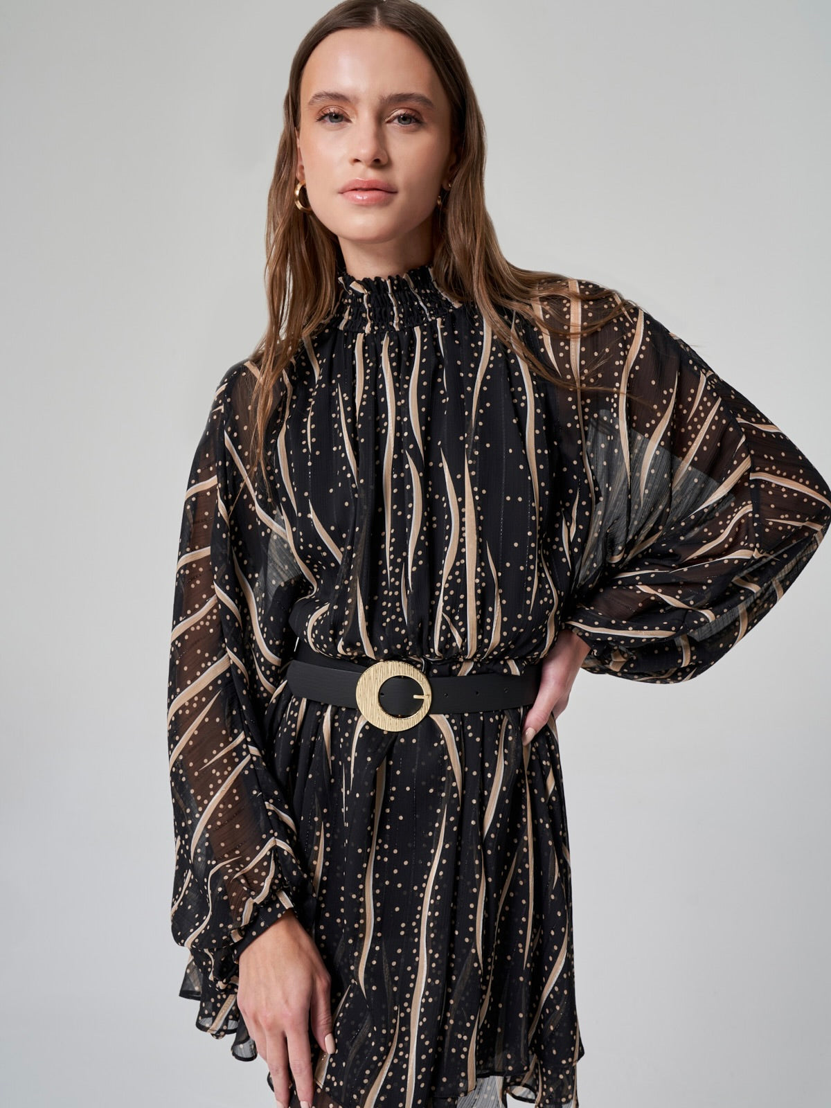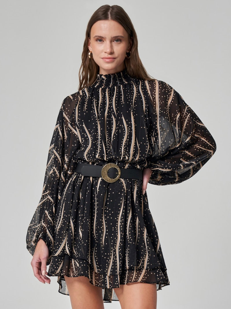 Dik yakası ve volanlı uzun kollarıyla feminen bir duruş sergileyen bu mini elbise, Utopian’ın özgün çizgilerini modern formda sunuyor. Siyah zemin üzerindeki bej tonlu geometrik desenler, elbiseye zarif bir hareket kazandırıyor.