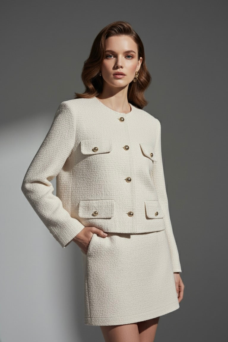 Klasik ceket kalıbını güncel, kompakt bir formda yorumlayan bu tivit ceket; dokulu yüzeyi, yuvarlak yakası ve metal düğmeleriyle sofistike bir görünüm sunar. Kumaş içeriği %50 polyester, %45 viskon, %5 elastandır; dokusu sayesinde vücuda oturmadan şık bir duruş elde edilir.
