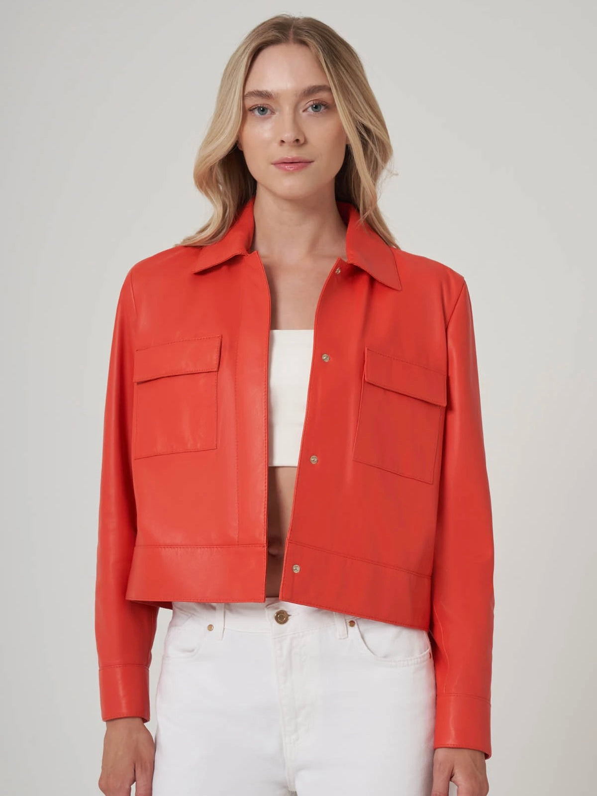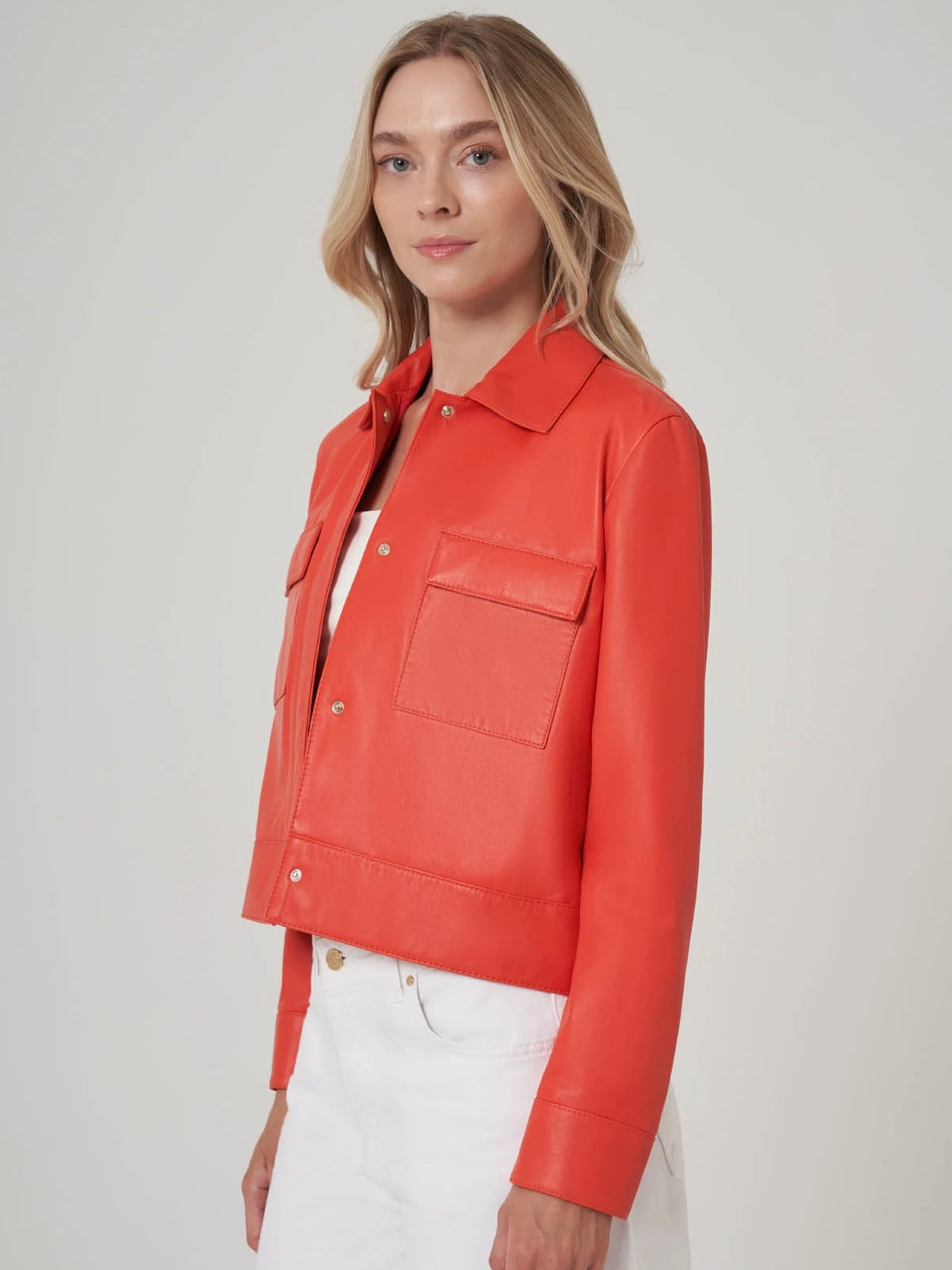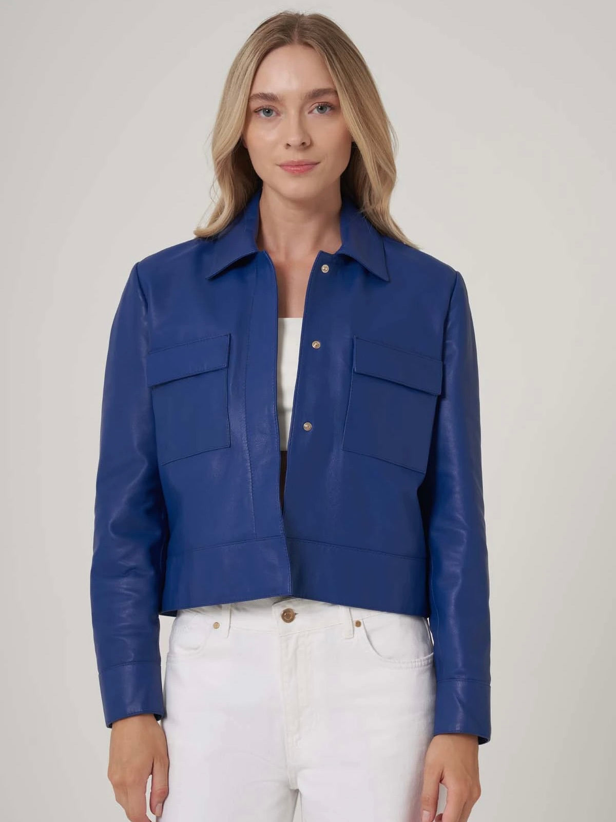 Güçlü ve modern bir siluet sunan bu kısa deri ceket, zamansız dokularla çağdaş bir tavır yaratıyor. Gömlek yaka kesimi ve metal çıtçıtlı kapanışıyla sade ama dikkat çekici bir görünüm sunarken, iki ön cep detayı cekete işlevsel bir dinamizm kazandırıyor.