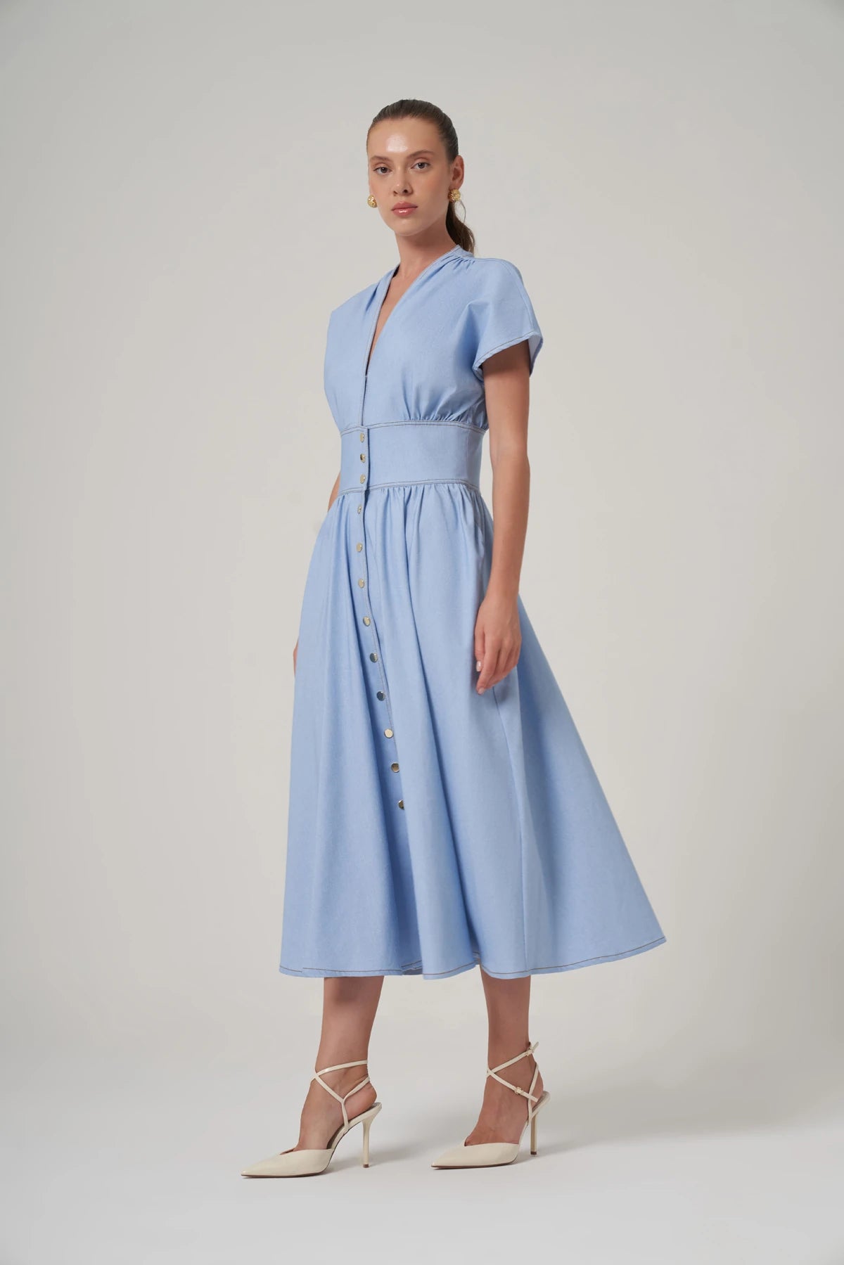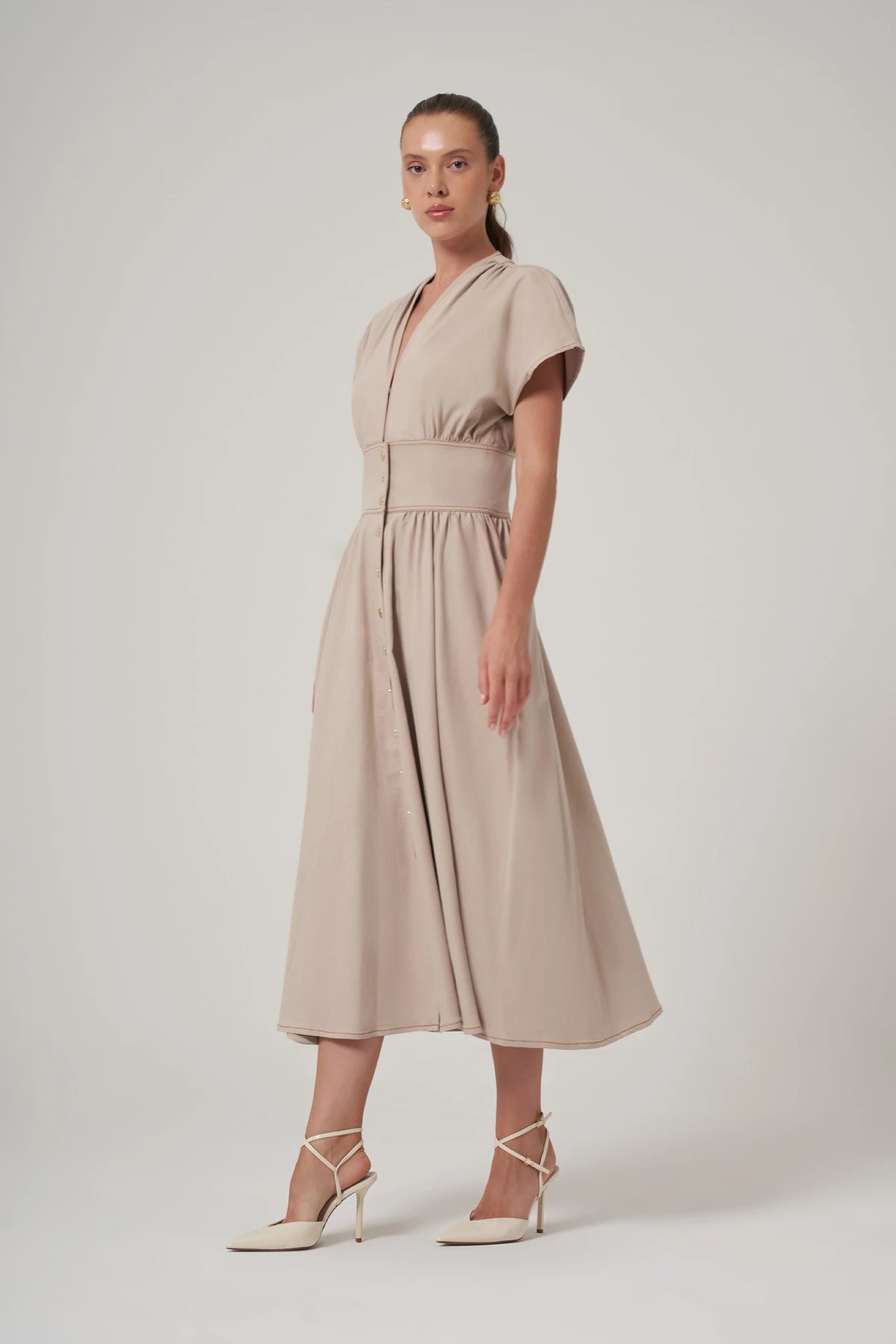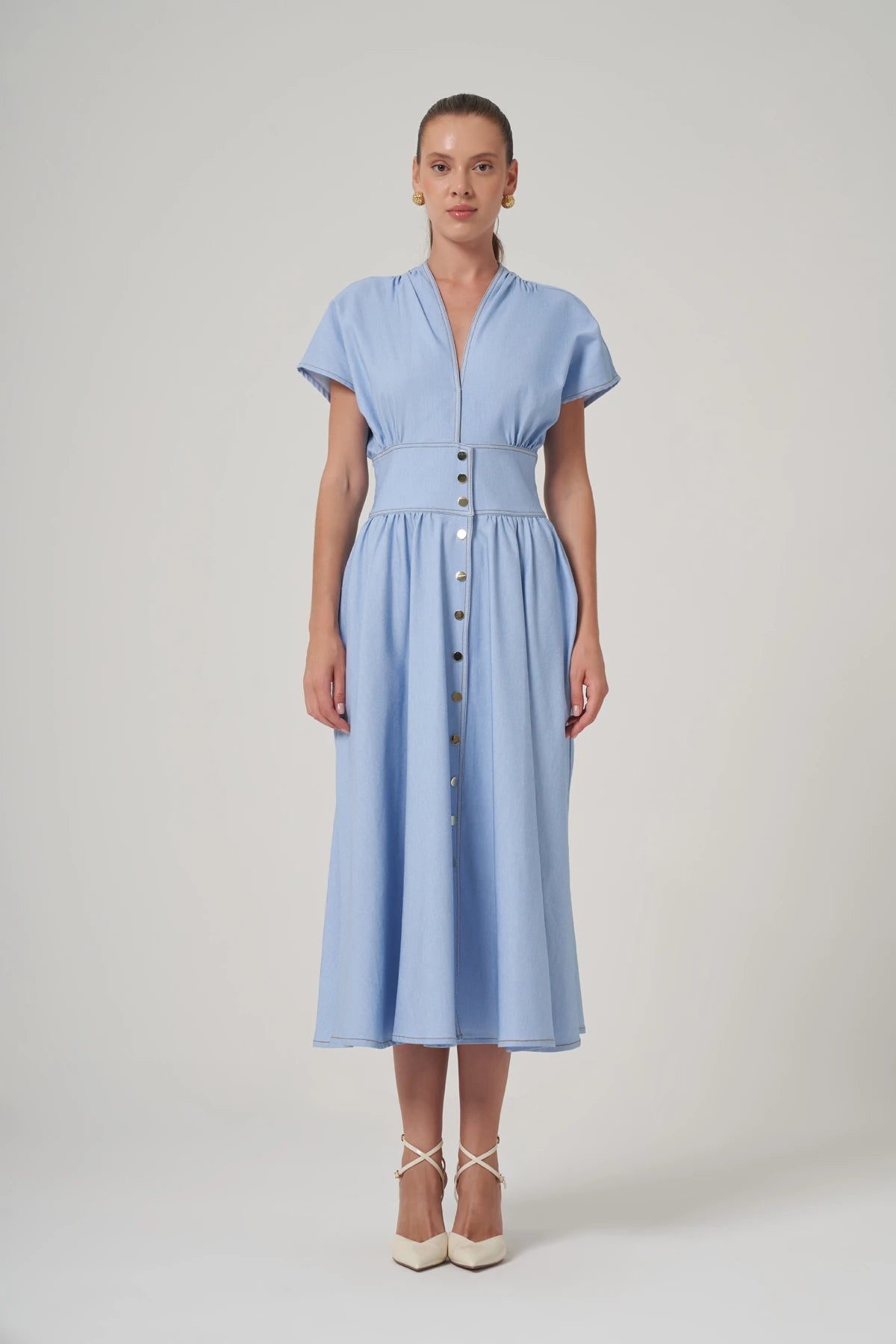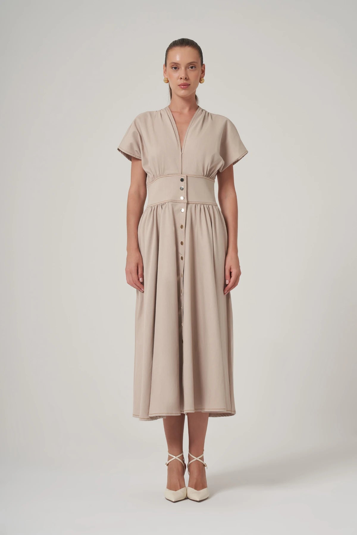 Utopian Kolsuz V Yaka Düğmeli Midi Elbise