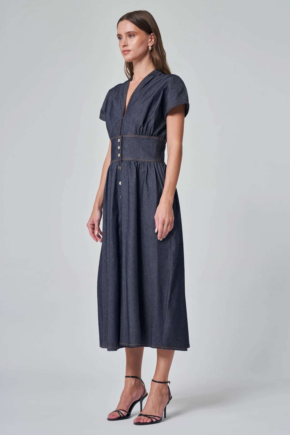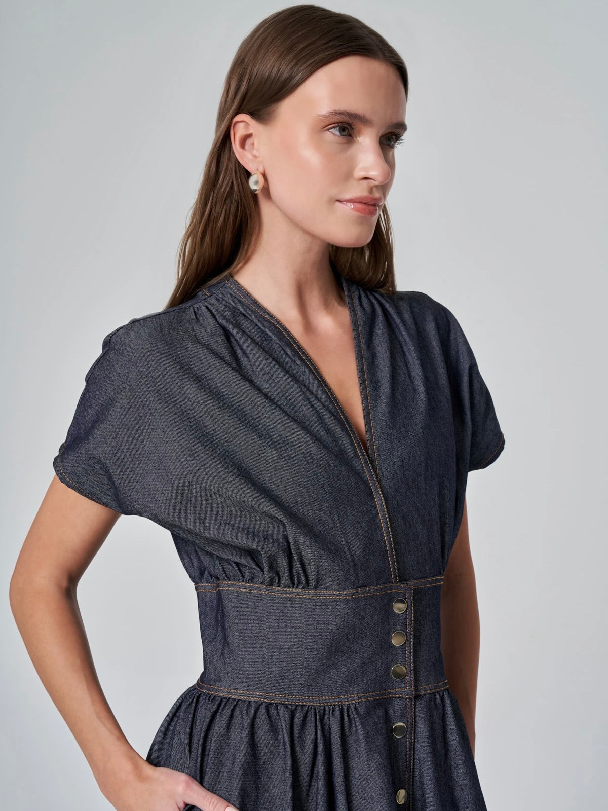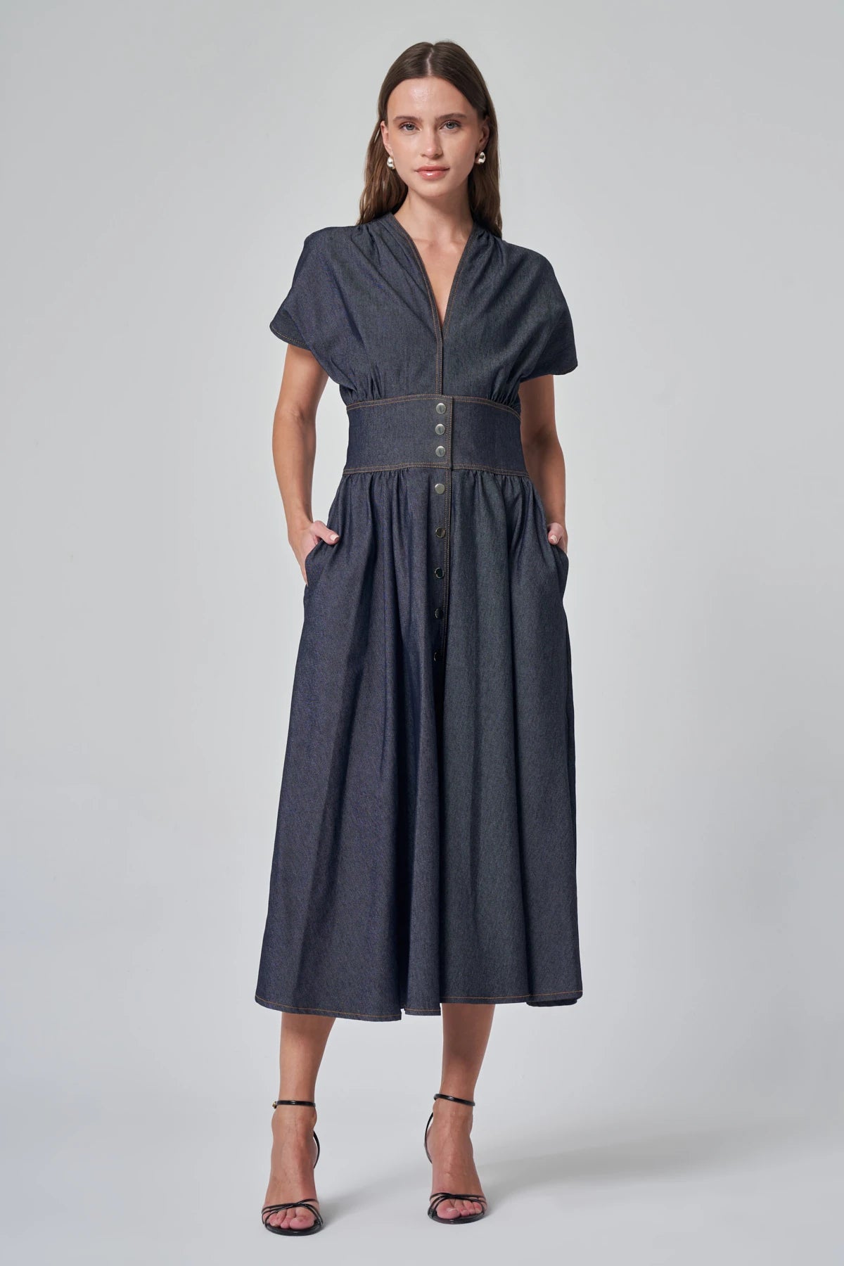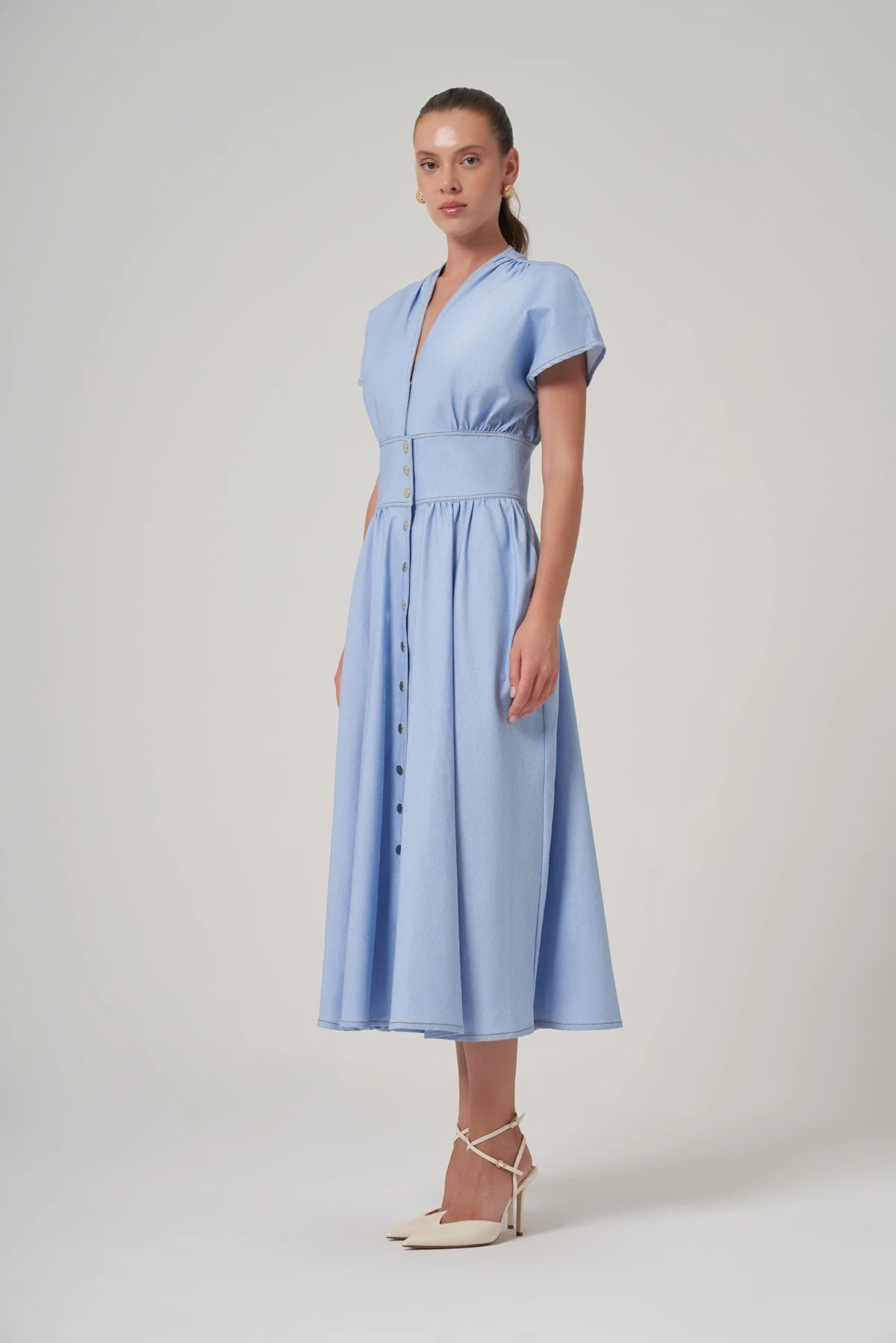 Utopian Kolsuz V Yaka Düğmeli Midi Elbise