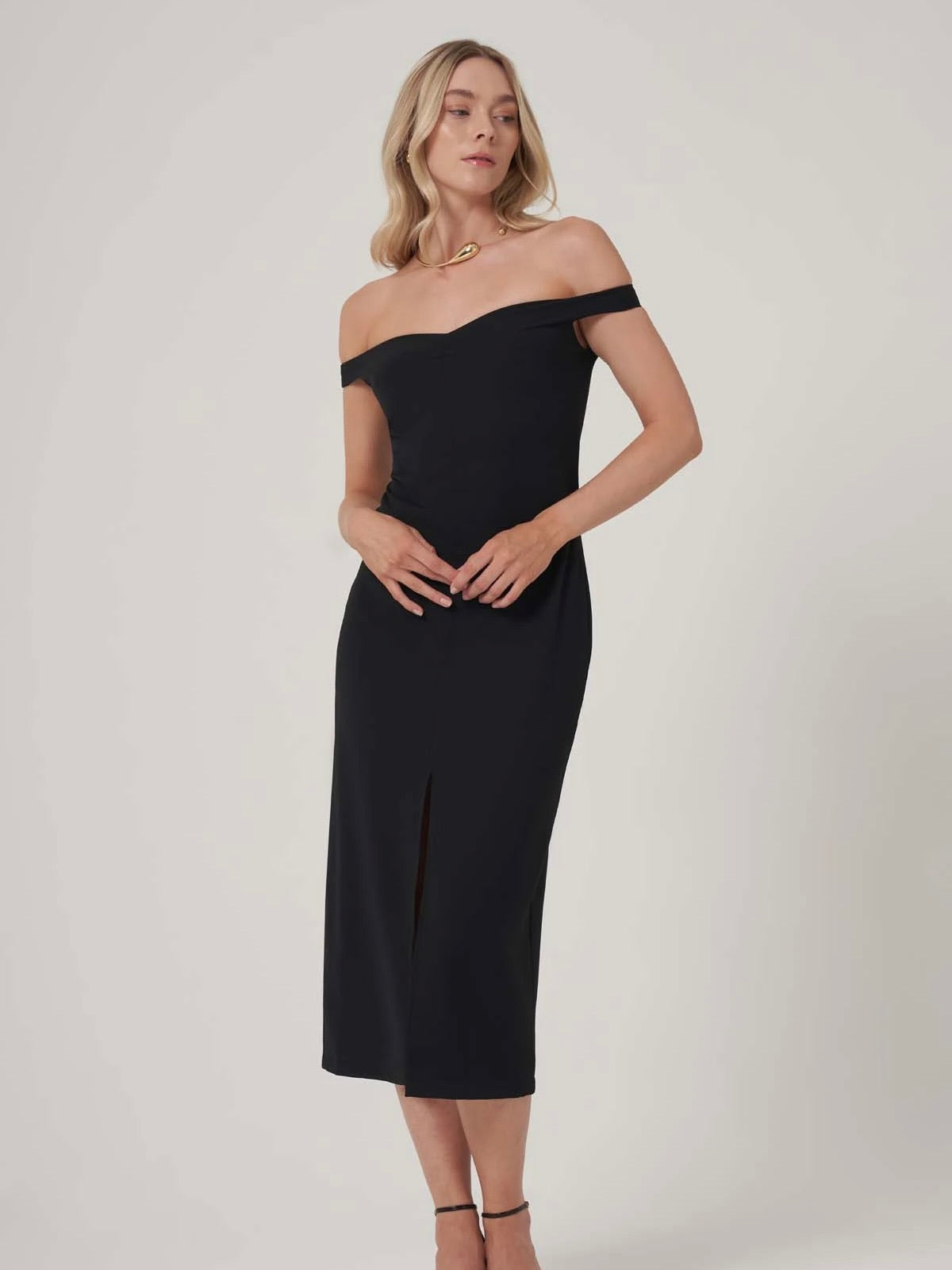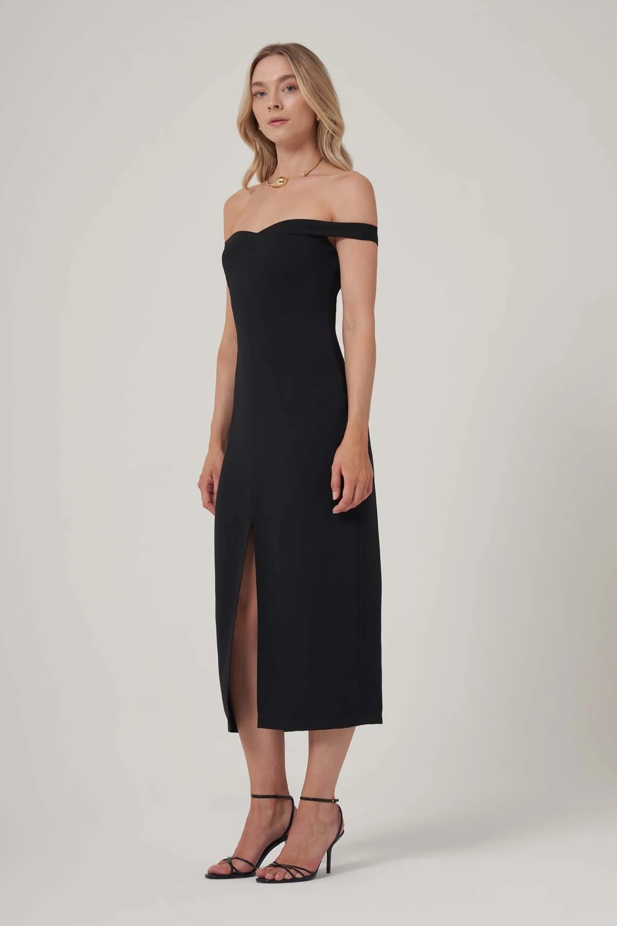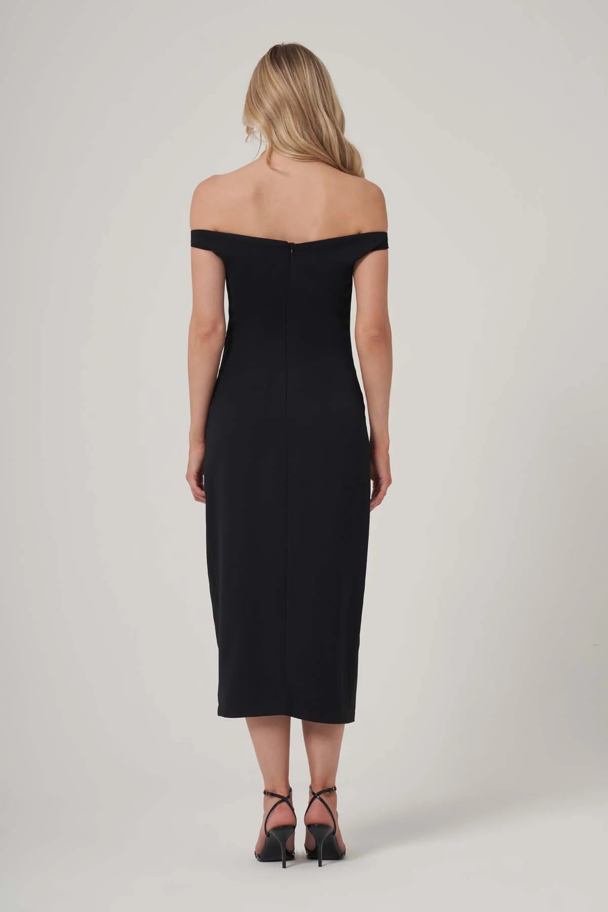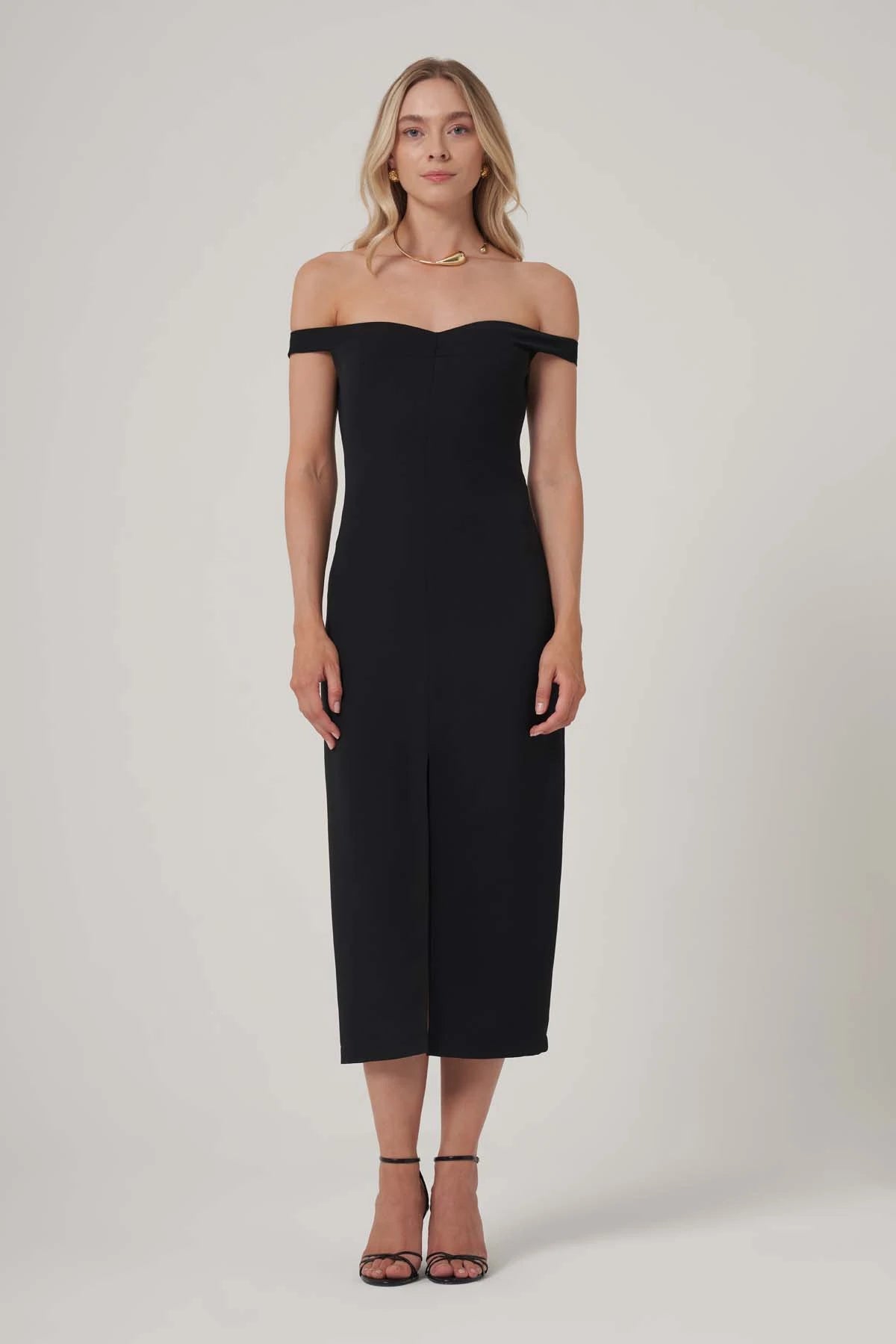 Zamansız siyahın cazibesini minimal detaylarla buluşturan bu omuz dekolteli midi elbise, yalın şıklığın etkileyici bir temsilcisi. Kalçadan aşağıya doğru süzülen kesimi ve tek yırtmaç detayı, bedenin doğal hatlarını zarifçe vurgularken, hafif V formundaki yakası feminen bir dokunuş sunuyor. İnce askısız yapısı, silüeti dengeli bir biçimde öne çıkarıyor.