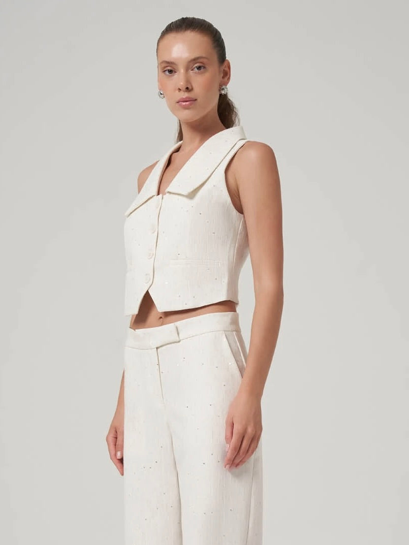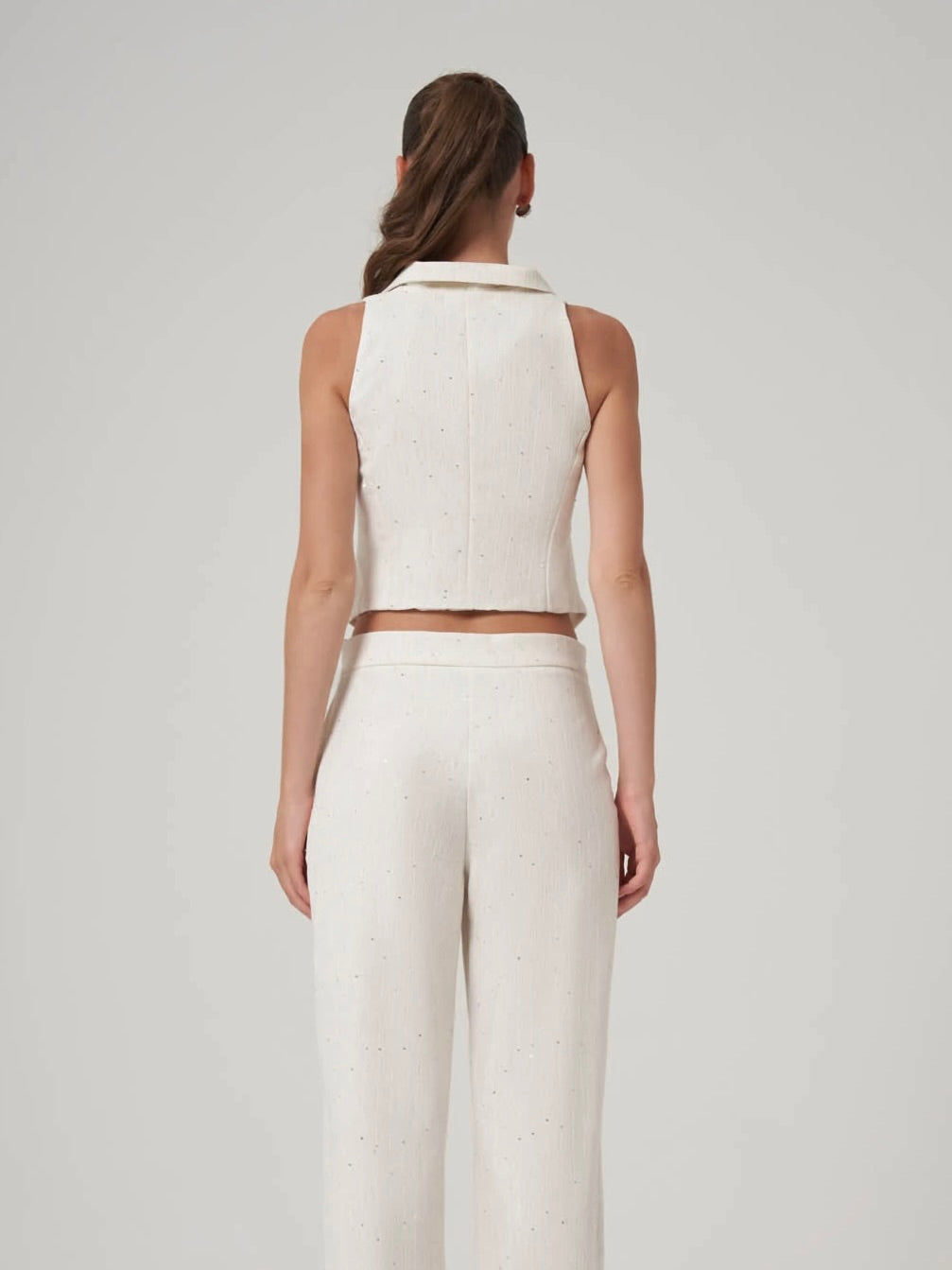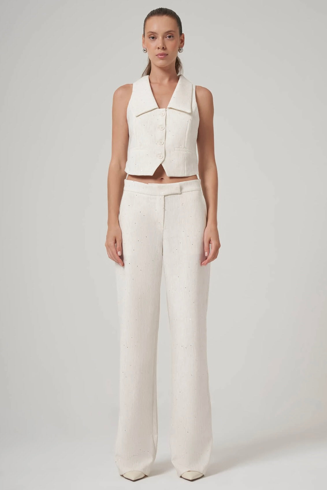 Modern çizgileri zarif ışıltılarla buluşturan bu Utopian yelek, güçlü silüetiyle günün her saatine uyum sağlar. Minimalist yakası ve düğmeli tasarımı, klasik bir kesime modern bir yorum katarken; dokusundaki ince pullar görünümüne sofistike bir parıltı ekler. Aynı kumaştan pantolonla takım olarak giyilebileceği gibi, tek başına da basic parçalarla rahatça kombinlenebilir.