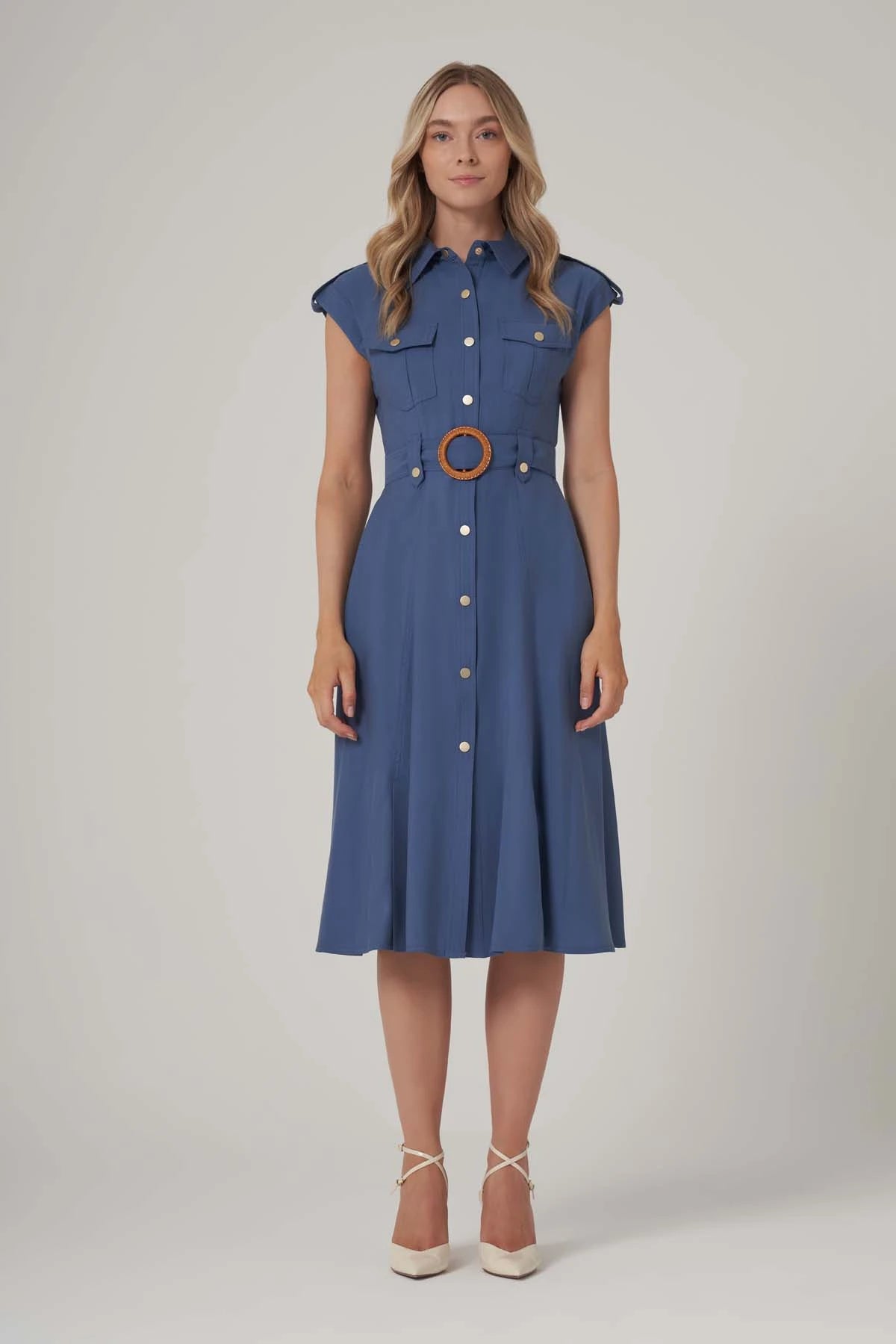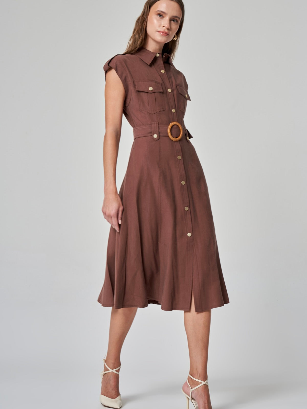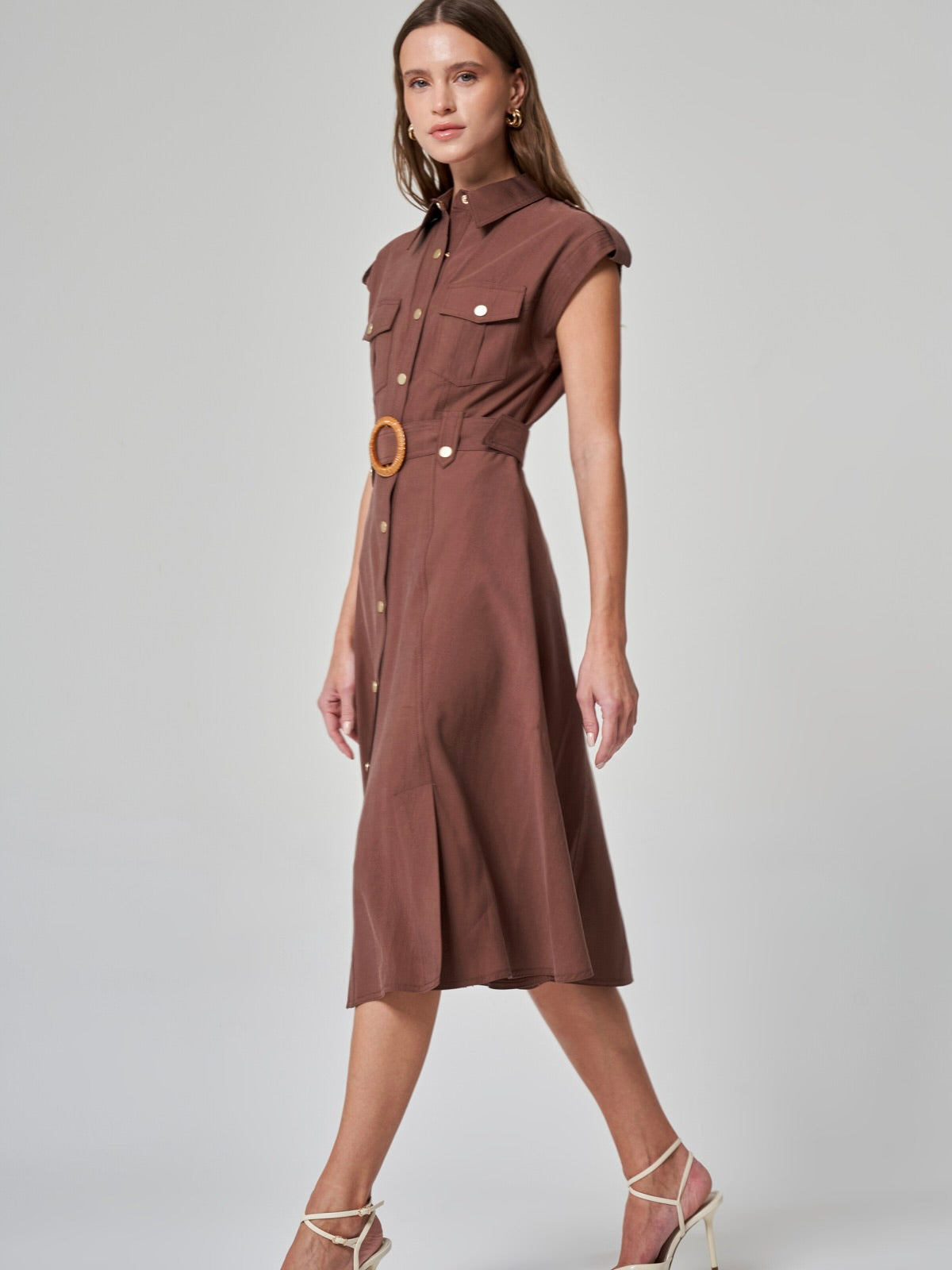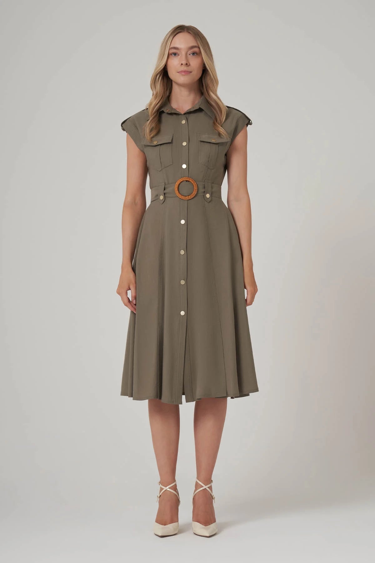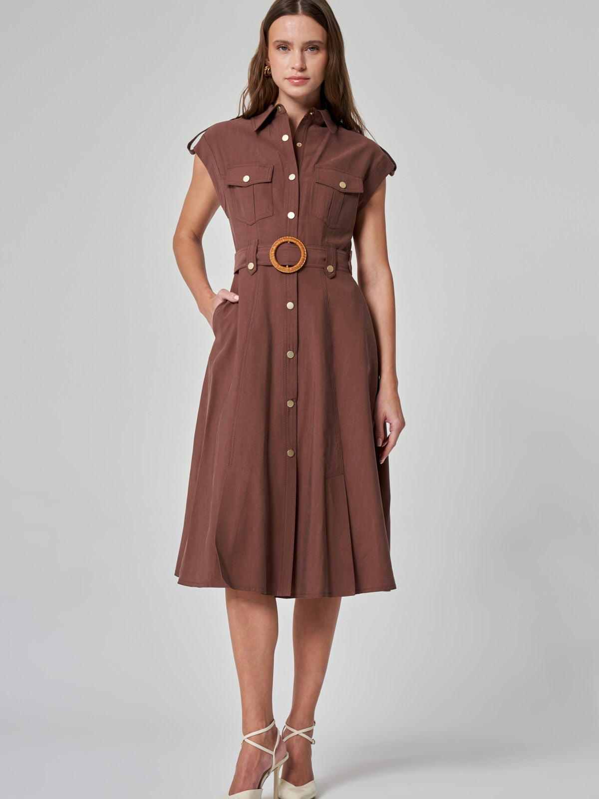 Hafif ve nefes alabilen dokusuyla yaz aylarında konfor sunan bu şık elbise, %93 tencel ve %7 polyamide karışımıyla zarif bir duruş sergiliyor. Yakalı ve kolsuz tasarımı modern bir görünüm sağlarken, çıtçıt detayları ve cepli yapısı fonksiyonelliği ön plana çıkarıyor. Belden kemerli kesimi vücudu zarifçe sararak feminen bir siluet oluştururken, çift yırtmaçlı yapısıyla hareket özgürlüğü sunuyor. Şık ve sıcak tonuyla kahverengi, bu tasarıma sofistike bir hava katıyor ve iş hayatından özel davetlere kadar her ortamda şıklığınızı tamamlıyor.