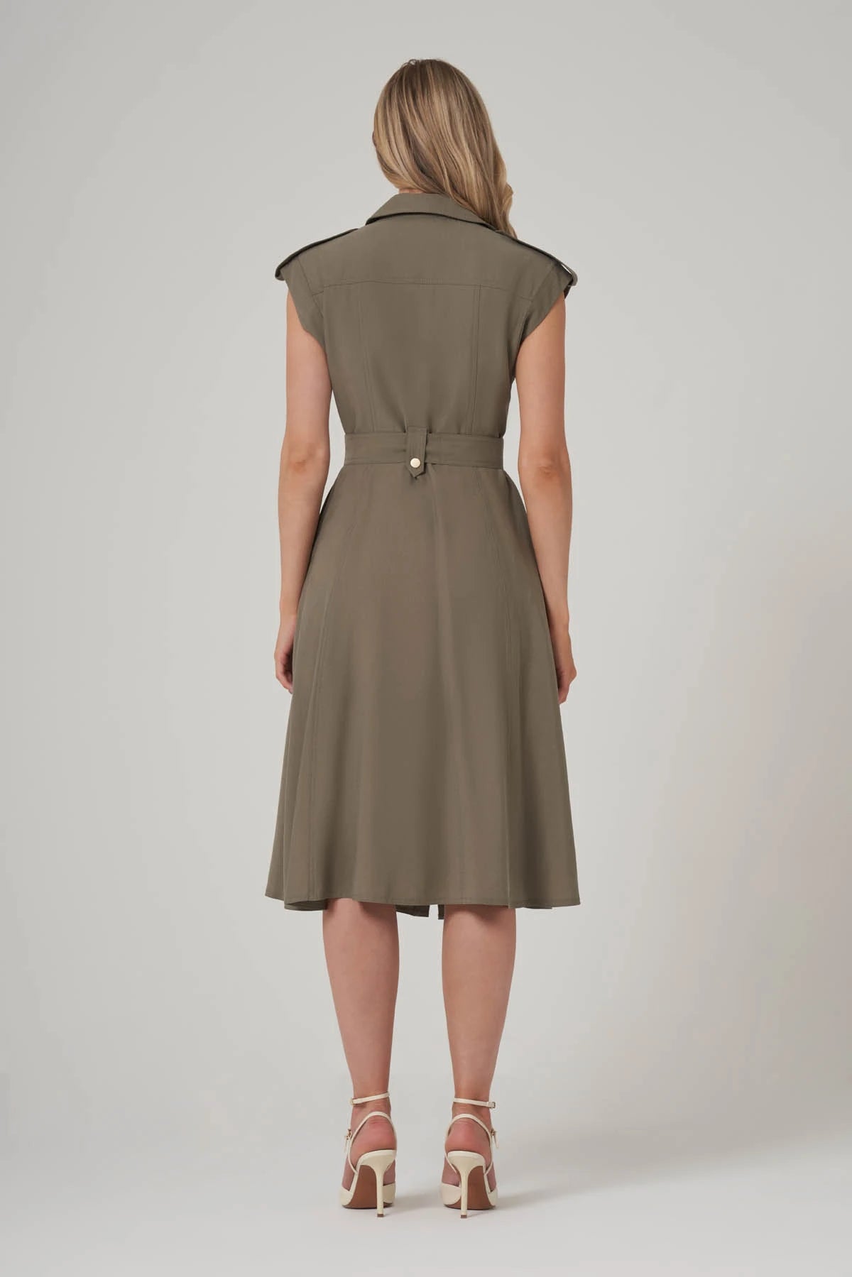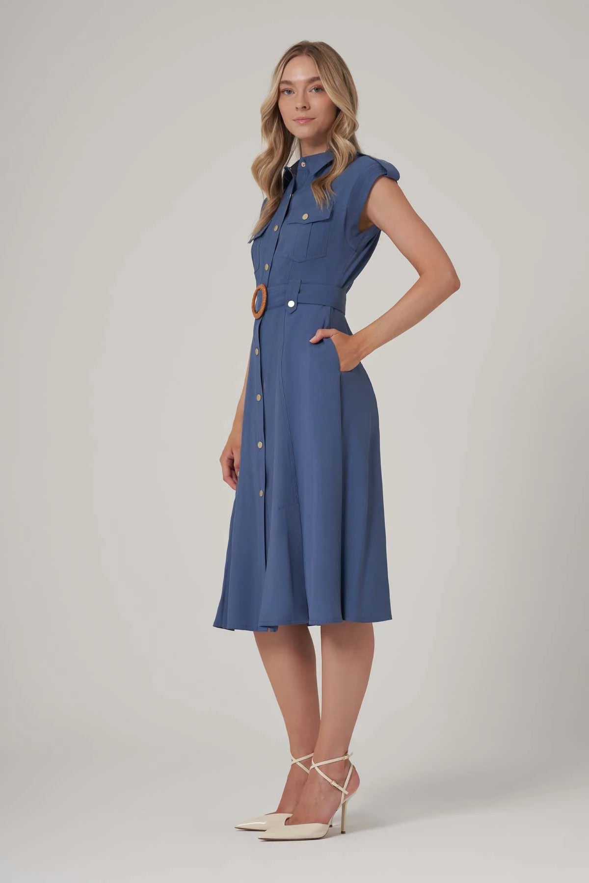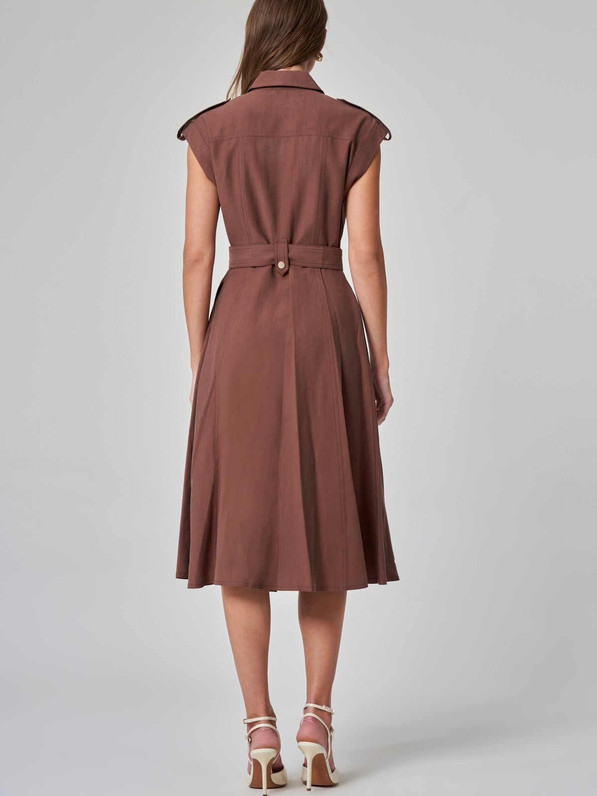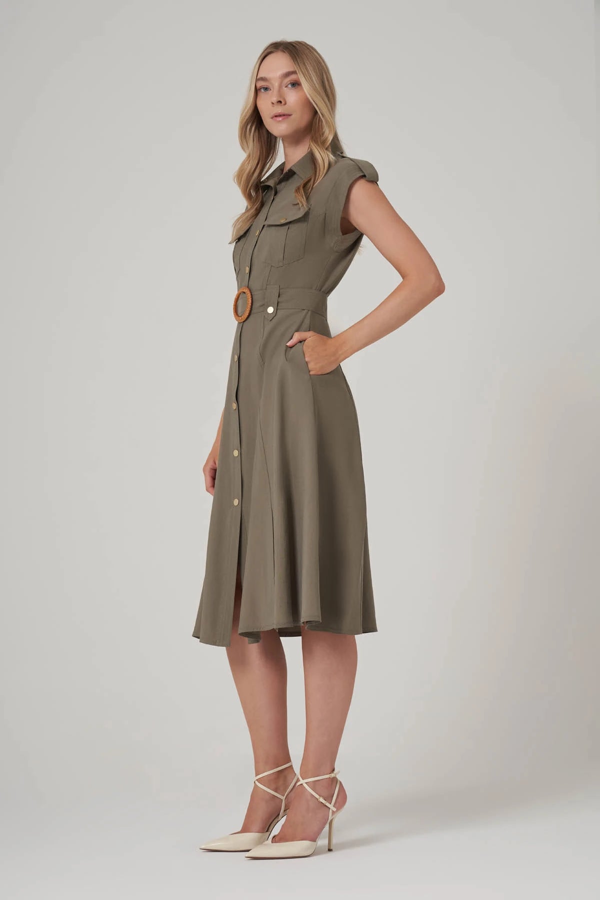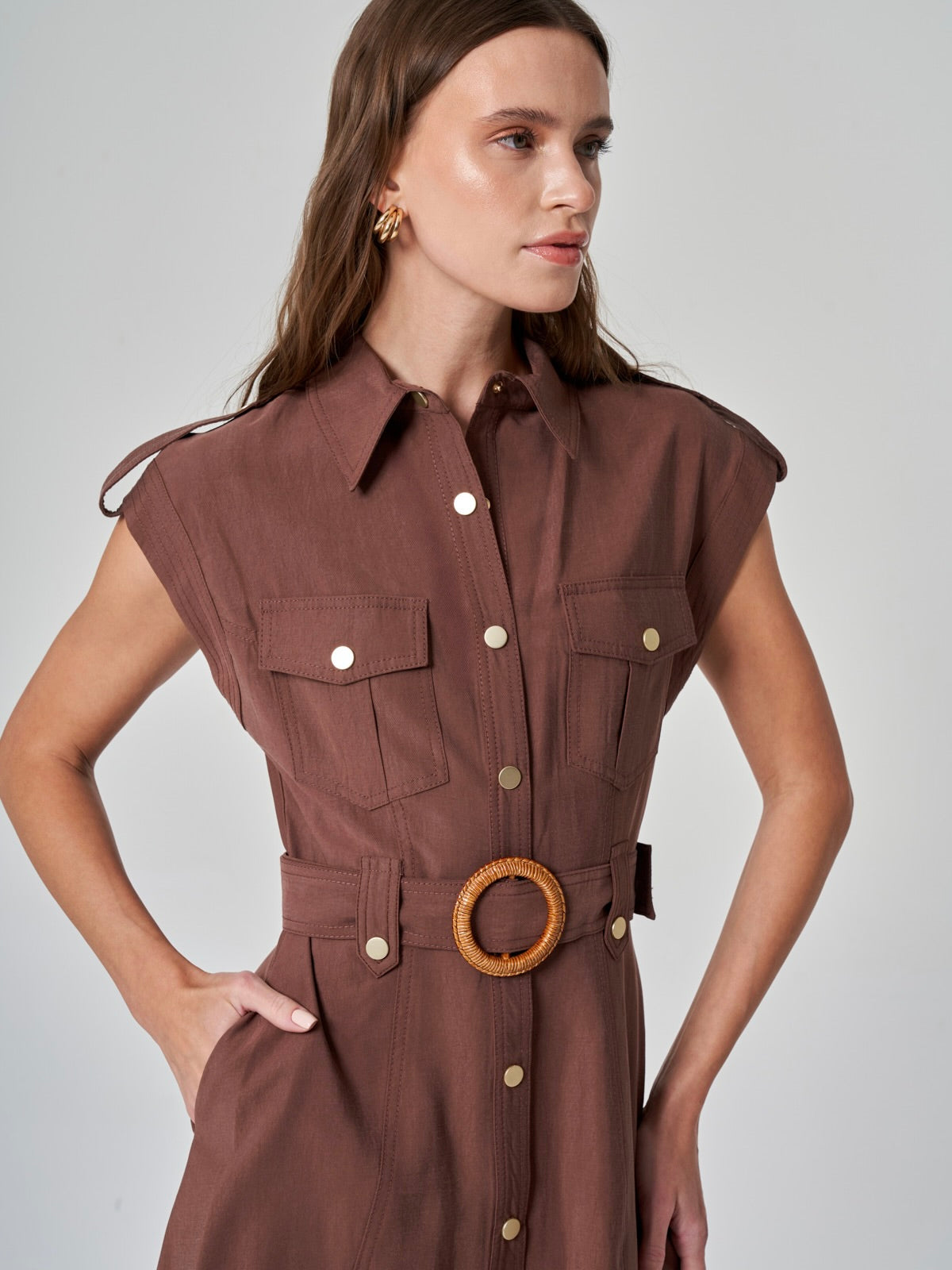 Hafif ve nefes alabilen dokusuyla yaz aylarında konfor sunan bu şık elbise, %93 tencel ve %7 polyamide karışımıyla zarif bir duruş sergiliyor. Yakalı ve kolsuz tasarımı modern bir görünüm sağlarken, çıtçıt detayları ve cepli yapısı fonksiyonelliği ön plana çıkarıyor. Belden kemerli kesimi vücudu zarifçe sararak feminen bir siluet oluştururken, çift yırtmaçlı yapısıyla hareket özgürlüğü sunuyor. Şık ve sıcak tonuyla kahverengi, bu tasarıma sofistike bir hava katıyor ve iş hayatından özel davetlere kadar her ortamda şıklığınızı tamamlıyor.
